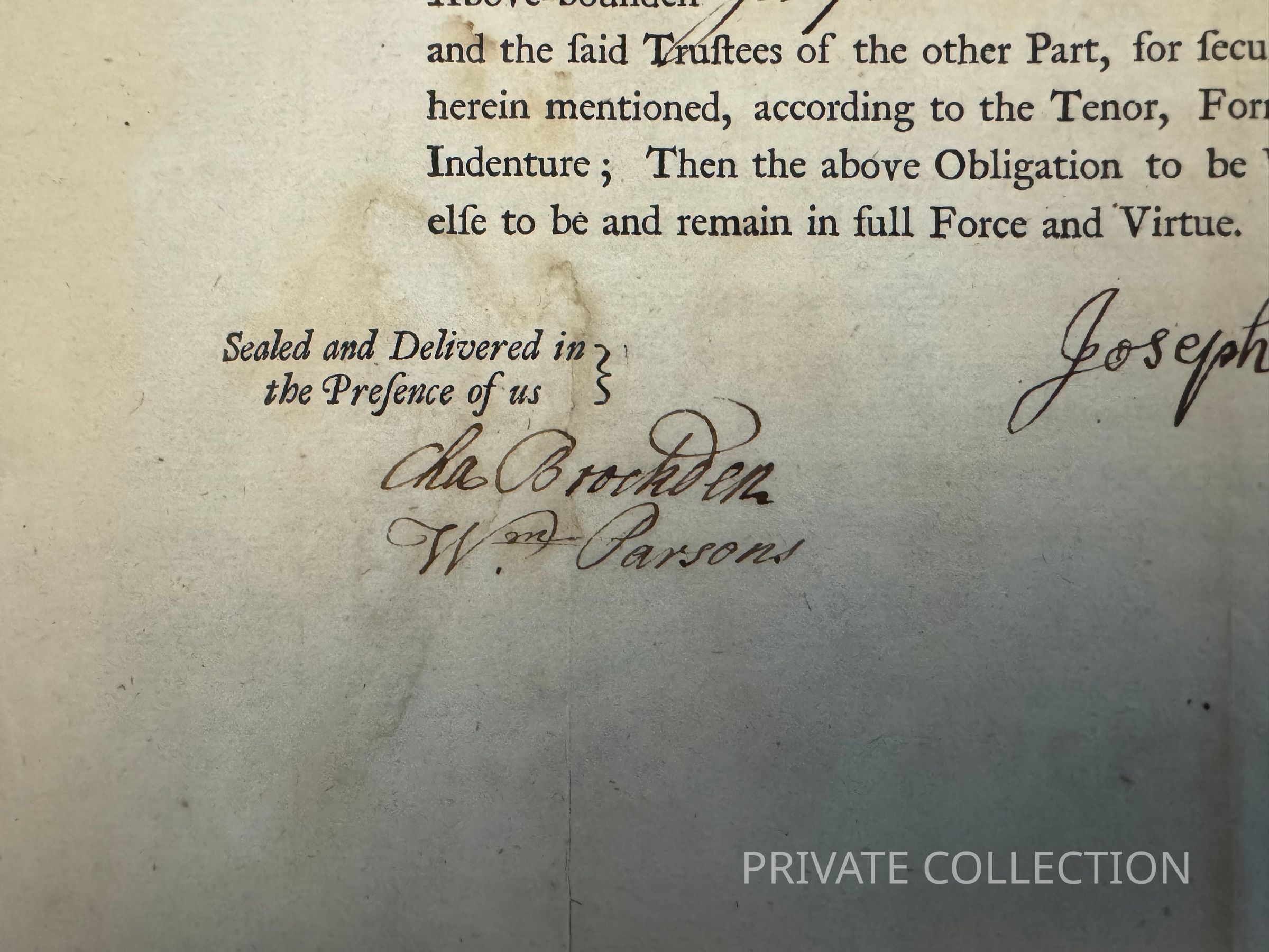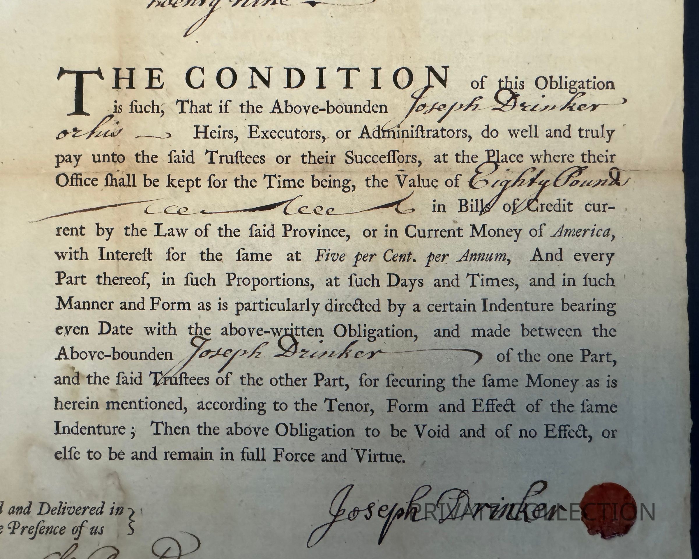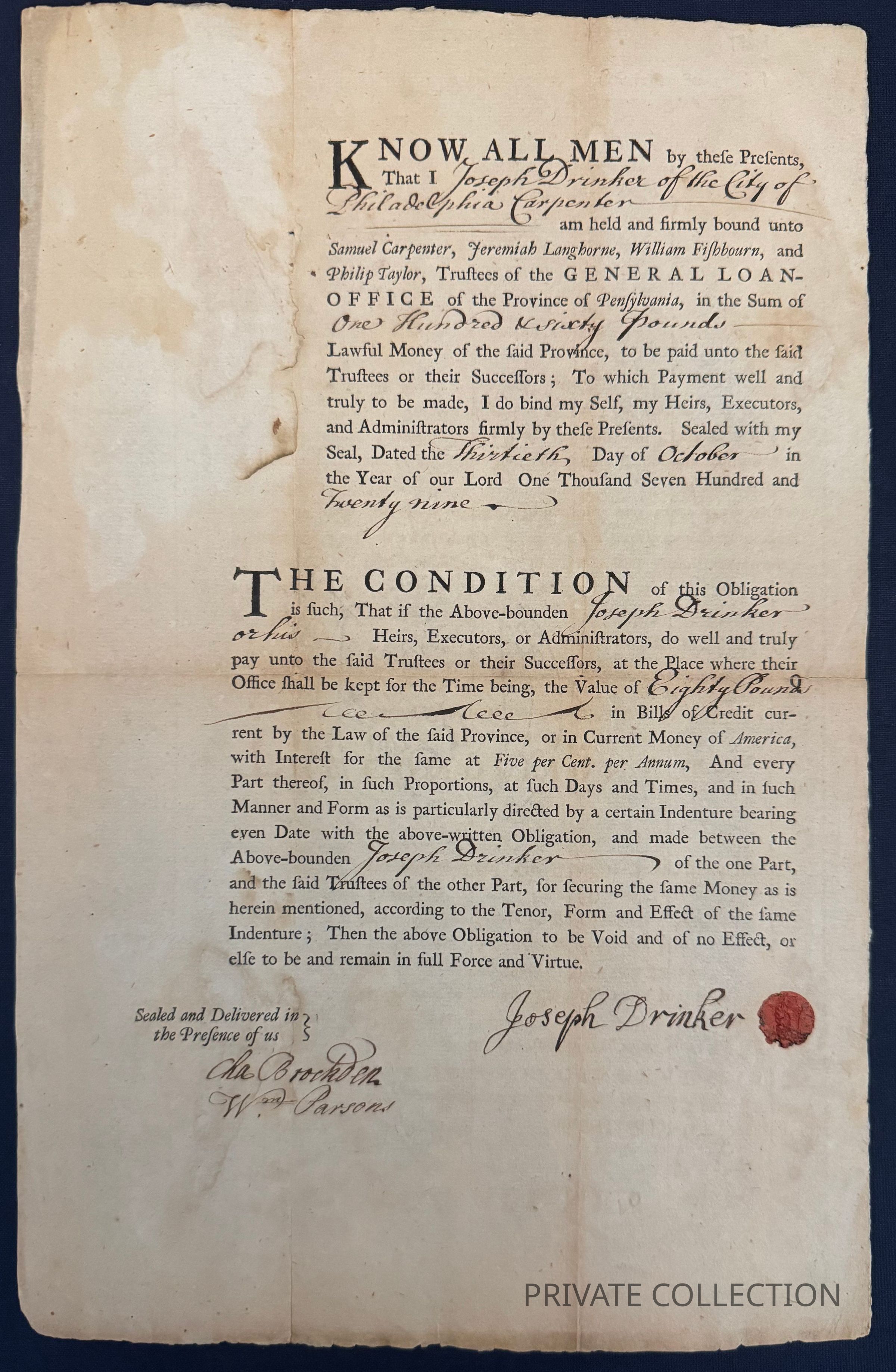 The document is signed in manuscript by Drinker (beside the wax seal), and also by Charles Brockden and William Parsons as witnesses. Brockden was Recorder of Deeds for the county of Philadelphia and Clerk of the General Loan Office.