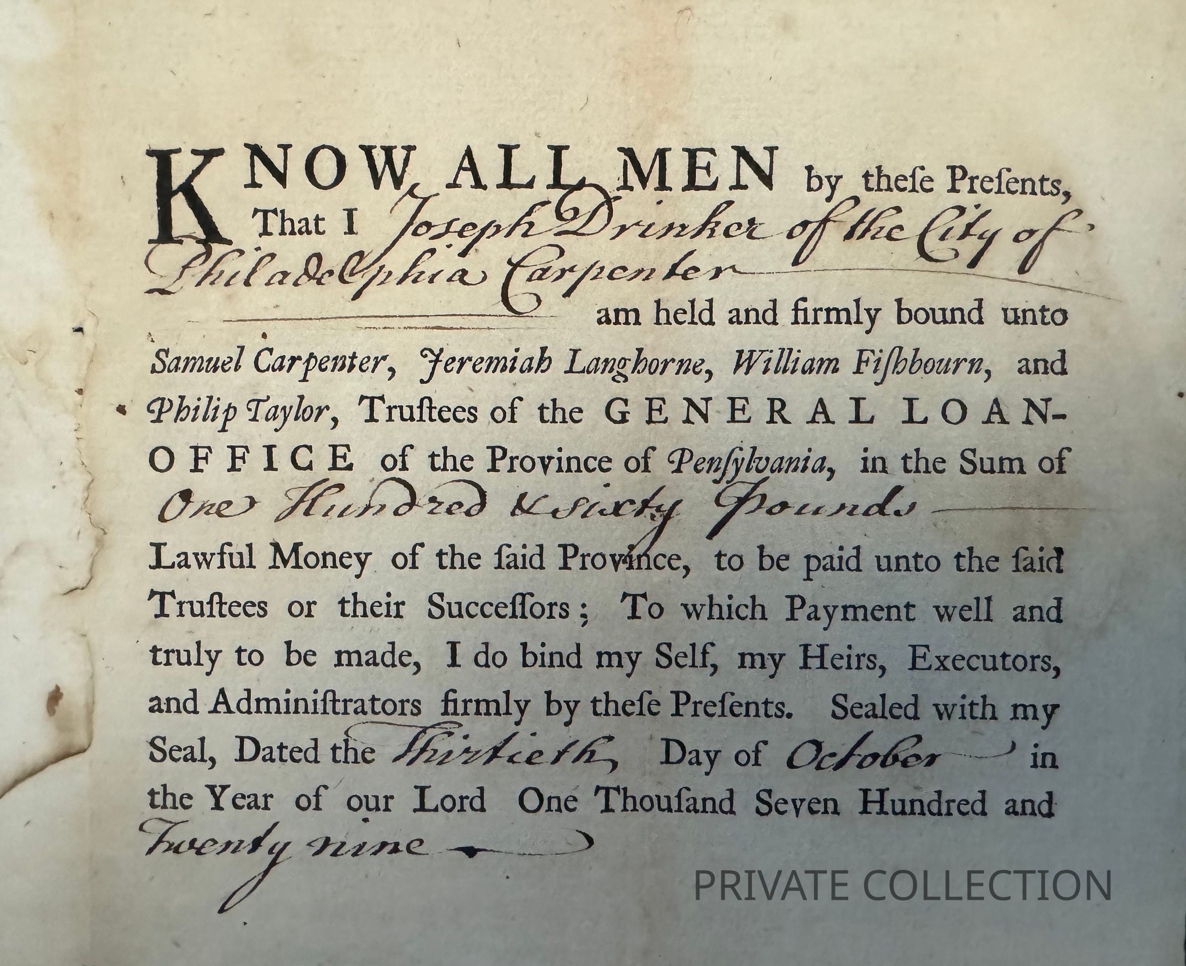 This partially printed mortgage bond is a very early Benjamin Franklin imprint, produced within the first year of the establishment of his printing office in Philadelphia. By this form, dated in manuscript 13 October 1729, "Joseph Drinker of the City of Philadelphia Carpenter" borrows 160 at 5 per cent per annum from the trustees of the General Loan Office of Pennsylvania. The trustees are identified in type as Samuel Carpenter, Jeremiah Langhorne, William Fishbourn, and Philip Taylor. It is docketed on the reverse.