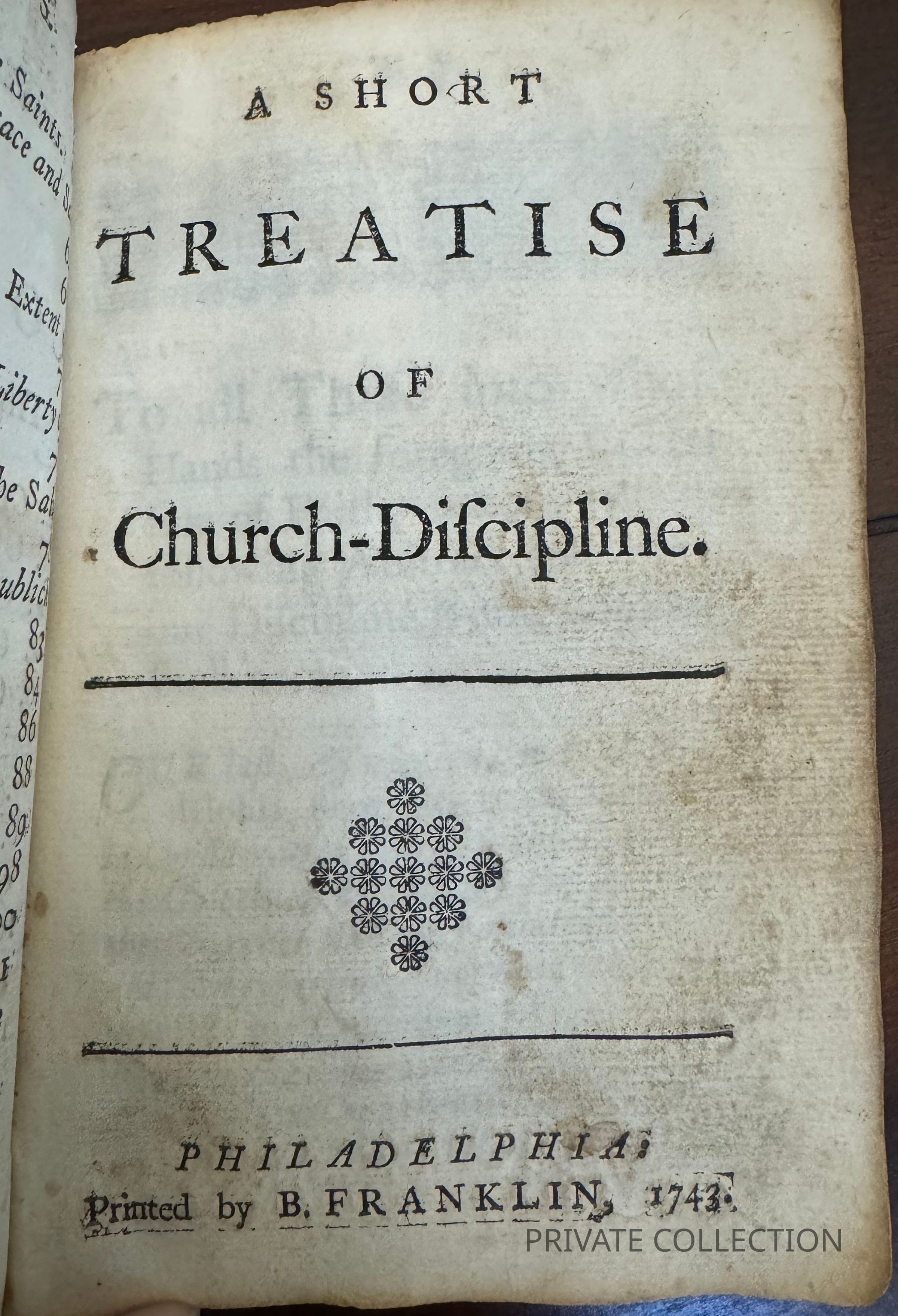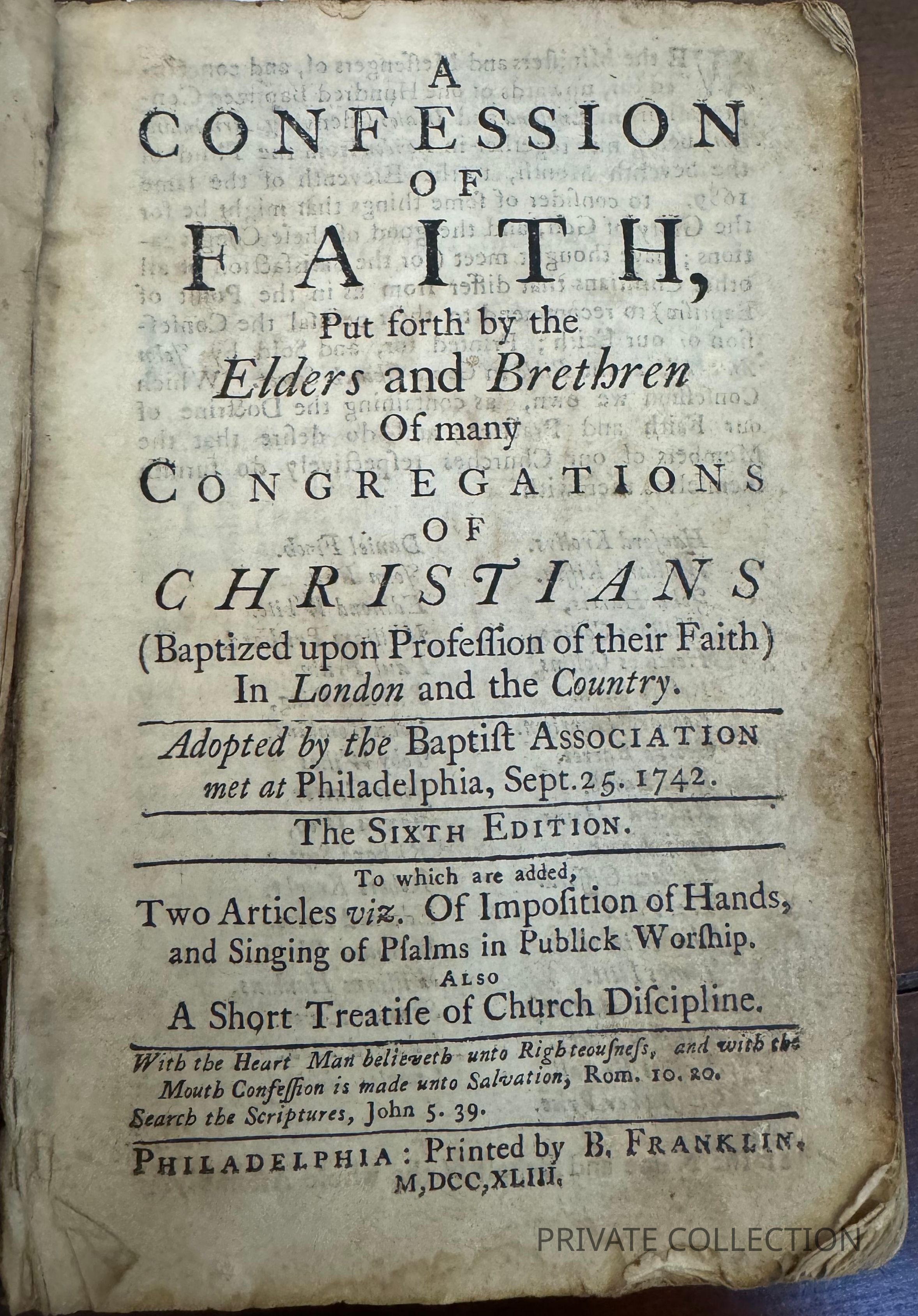 (FRANKLIN IMPRINT). A Confession of Faith, Put Forth by the Elders and Brethren of Many Congregations of Christians (Baptized upon Profession of Their Faith) in London and the Country. [bound with:] A Short Treatise of Church Discipline. Philadelphia. 1743.