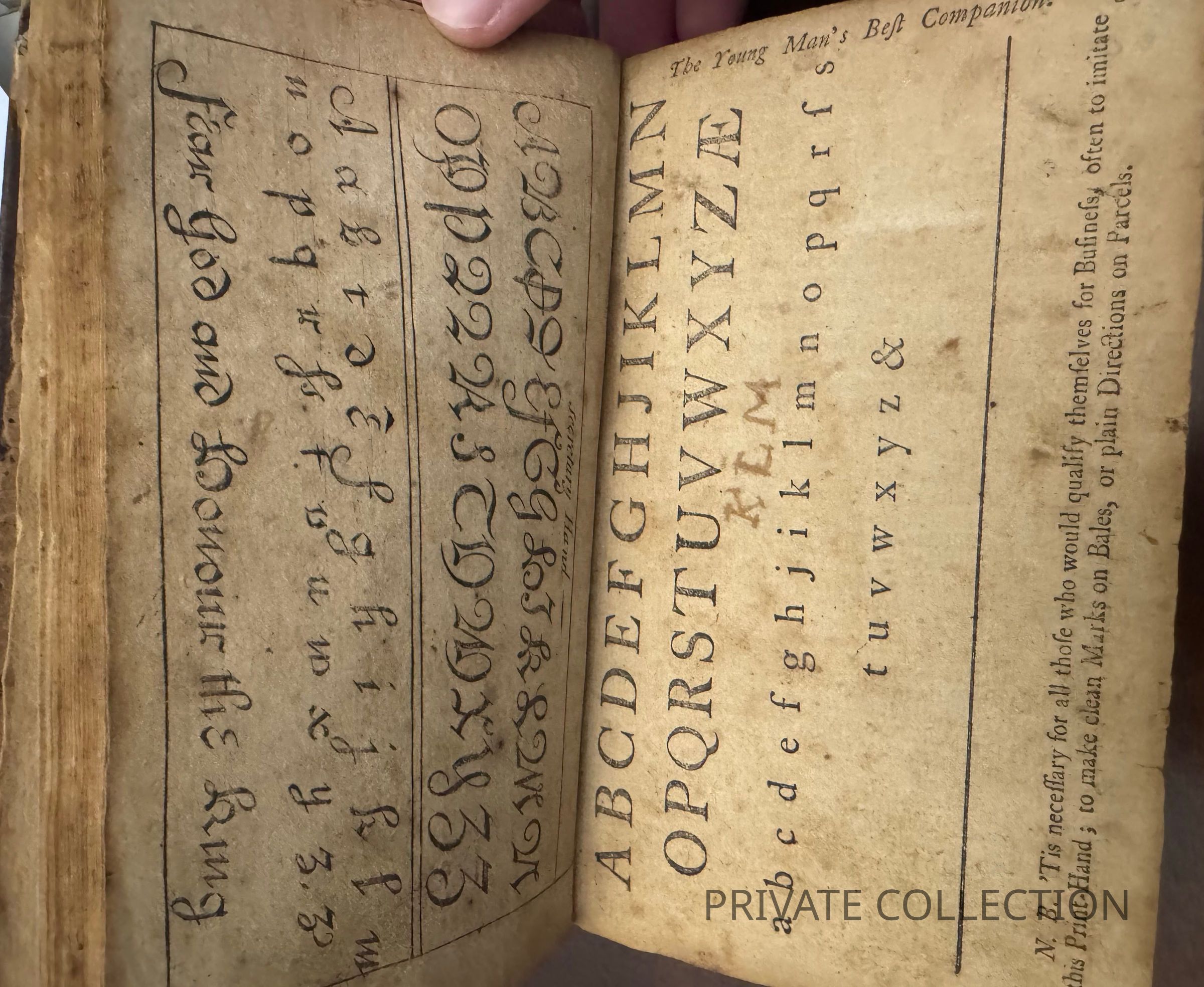 PLATES: (I) four writing hands: Italian, secretary, round, flourishing, imposed on 8° half-sheet and inserted after p. 30; (2) fold-in engraving of geometrical figures done by James Turner, inserted after p.
