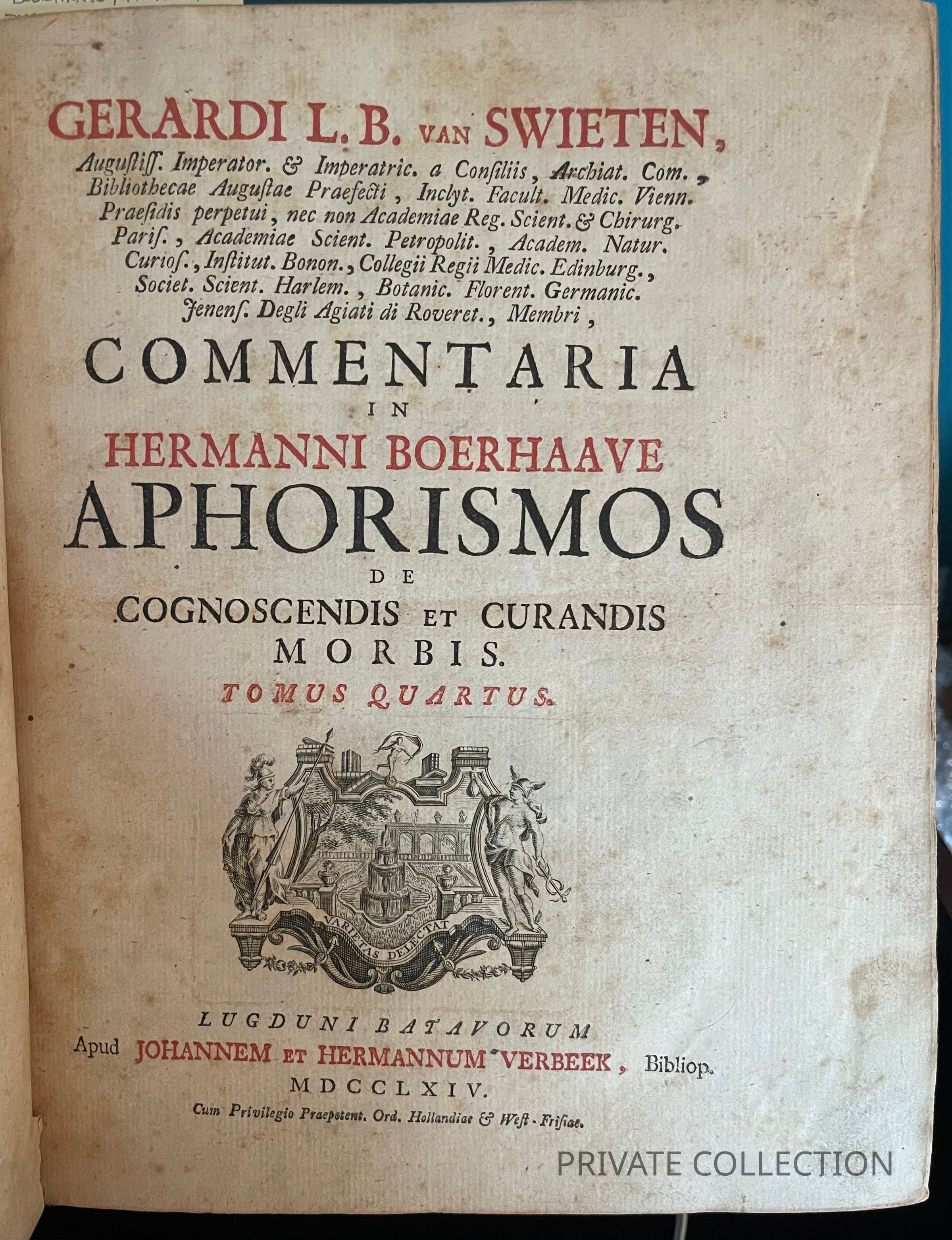 Herman Boerhaave (1668-1738) was a Dutch philosopher, botanist, and physician, considered to be the founder of clinical teaching and of the concept of the modern teaching hospital. Boerhaave revived the Hippocratic tradition of teaching students at the patients' bedsides. He also insisted on performing autopsies in order to understand the connection between symptoms and lesions. In 1709 he became professor of botany and medicine at the University of Leiden, which he made into Europe's leading center for medical education. "Students came to Leiden from many different countries, returning with textbooks by their professor to teach his methods at home, so that Boerhaave's academic system, both in style and in organization, survived through his pupils long after death. The most remarkable example of his influence was in the medical school at Edinburgh...At one moment, in 1726, the whole medical faculty at Edinburgh consisted of Boerhaave's pupils following his teaching. Through his pupils he is the real founder of the Edinburgh Medical School, and through it of the best medical teaching in the English- speaking countries of the world.'" Grolier, One Hundred Famous Books in Medicine 39 (ref.) Gerard van Swieten (1700-1772) enrolled as a medical student at the University of Leiden, attracted by the lectures of Boerhaave. After receiving the MD degree in 1725, he established a medical practice in Leiden, which, although it soon became quite sizable, did not prevent him from continuing to attend every lecture of Boerhaave until the latter's death in 1738.
