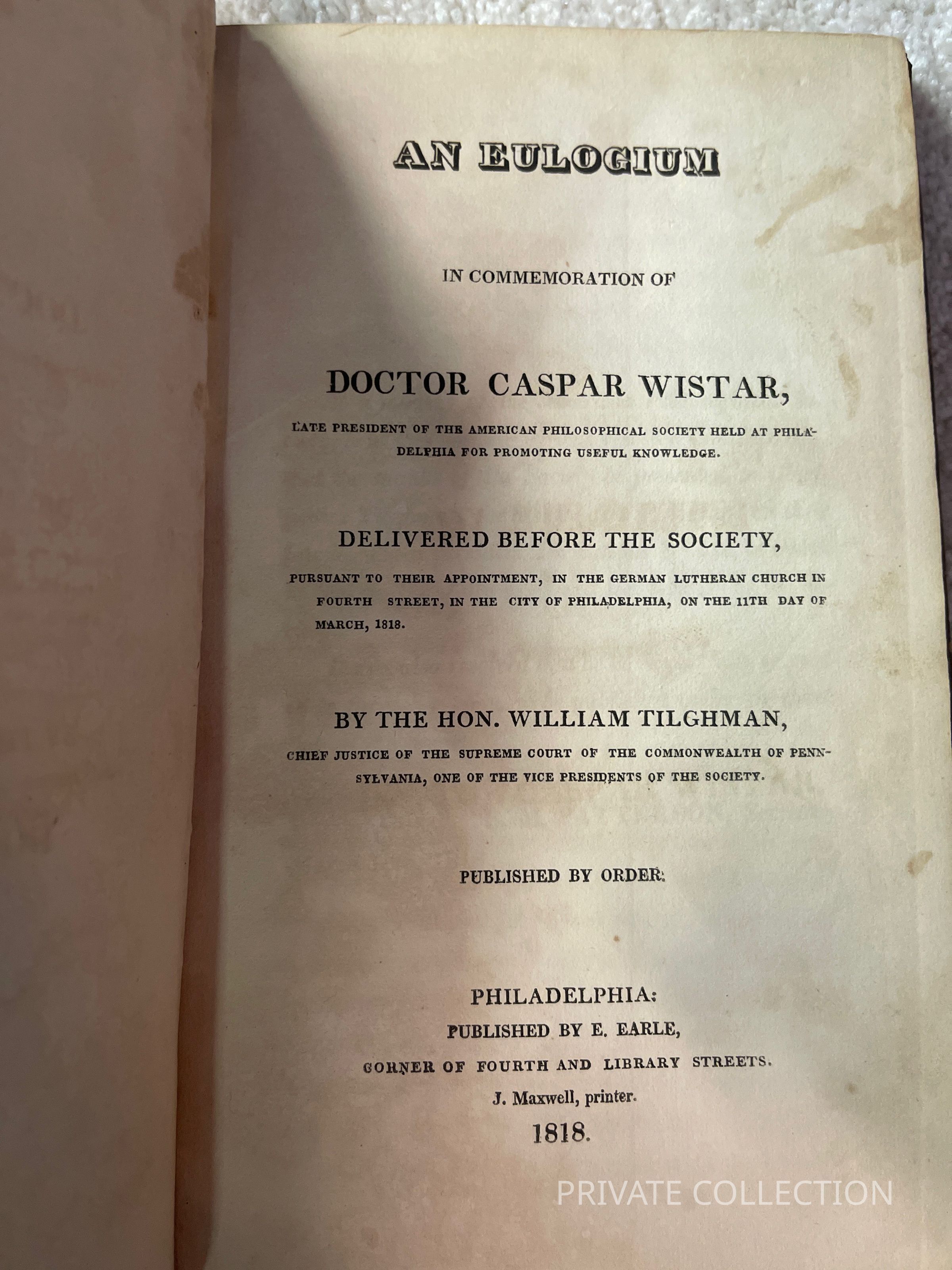 The first, An Euologium on commemoration of Doctor Casper Wistar, late president of the American Philosophical Society held at Philadelphia for promoting useful knowledge delivered before the society, pursuant to their appointment, in the German lutheran church in fourth street, in the City of Philadelphia, on the 11th day of March, 1818, By the Hon, William Tilghman, Chief Justice of the Supreme court of the commonwealth of pennsylvania, oe of the vice-presidents of the society. Phila: E. Earle publisher, J maxwell, printer, 47 pp