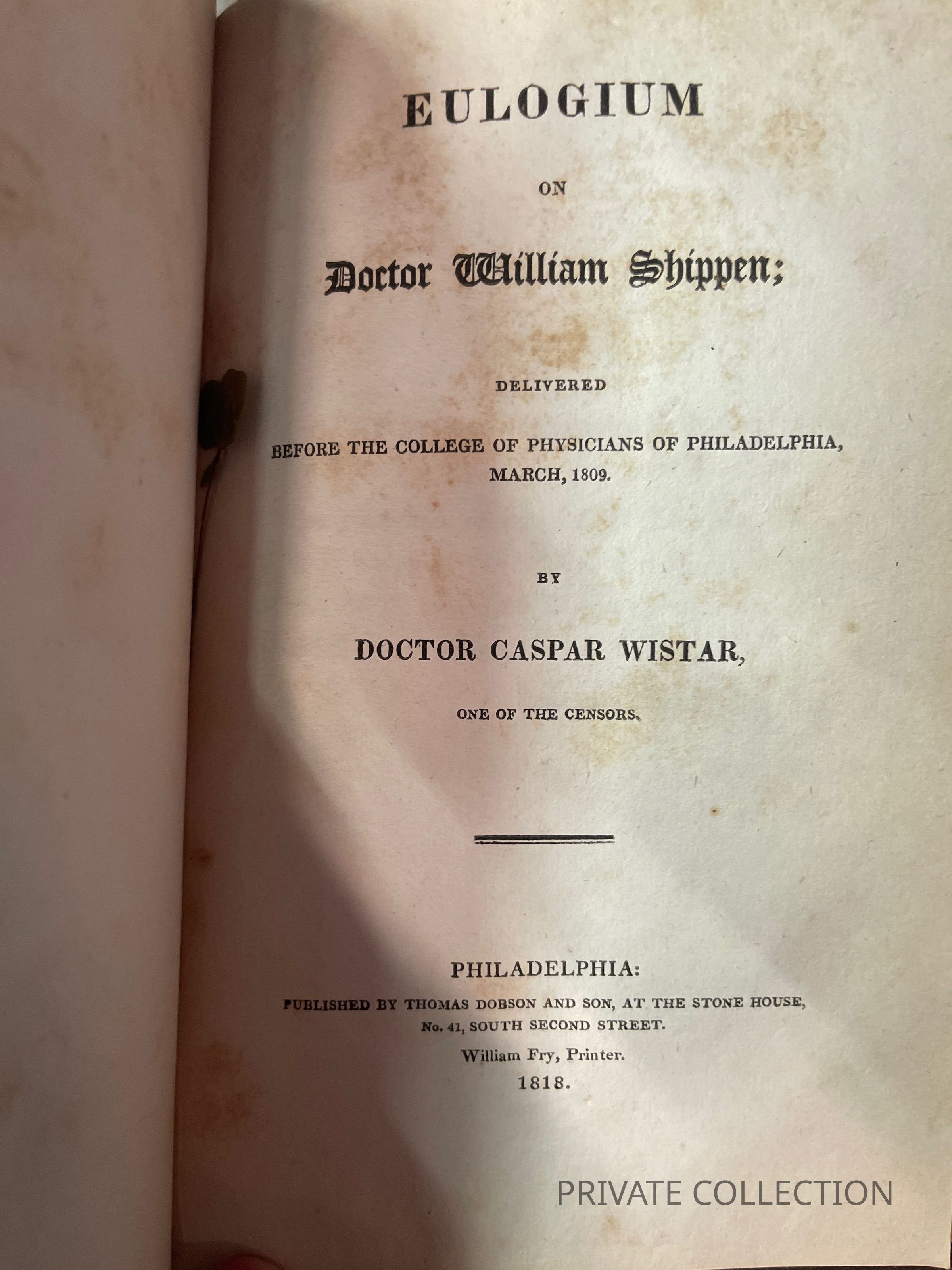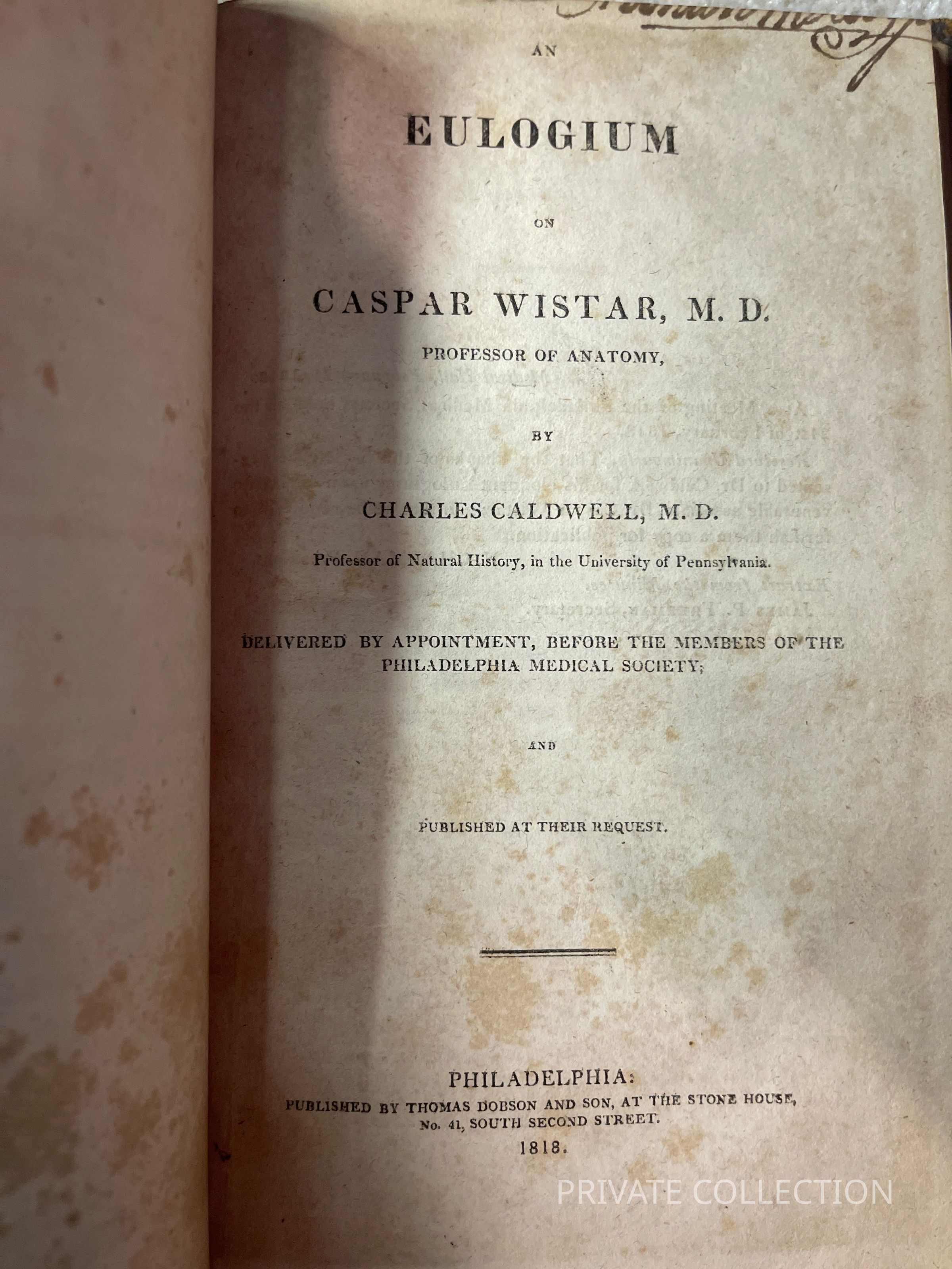 The Second: An eulogium on Caspar Wistar, MD, professor of Anatomy, by Charles Caldwell, MD., professor of natural history in the University of Pennsylvania. Delivered by appointment before the members of the Philadelphia Medical Society and Published at their request.” Published by Thomas Dobson, 28pp.