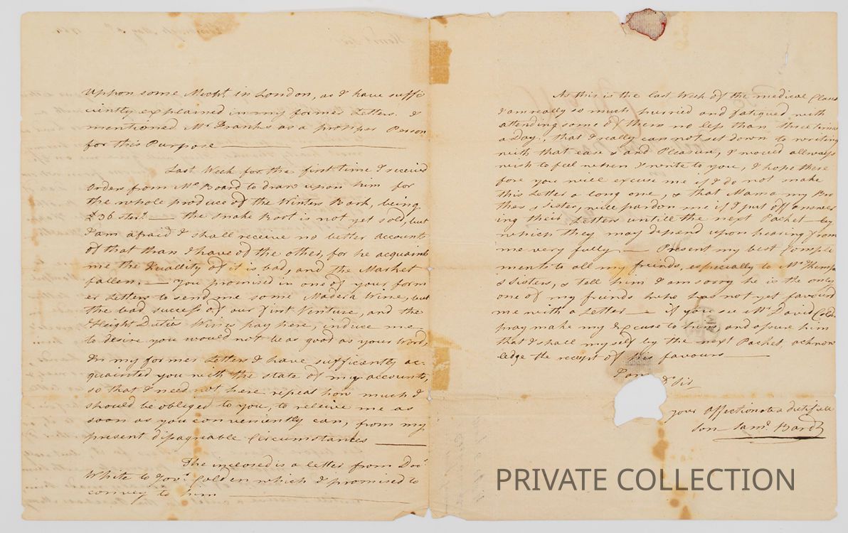 Autograph letter signed by the influential early American physician, Samuel Bard, written while a medical student in Edinburgh. Bard was founder of the King s College (Columbia) Medical School, the New York Hospital, and longtime president of the College of Physicians & Surgeons.