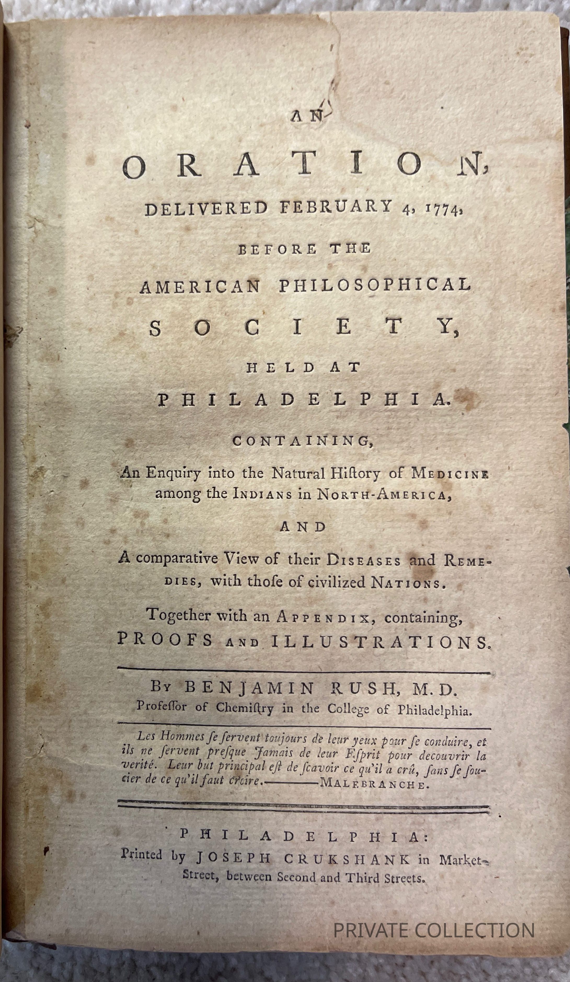 1774. Thomson, scheduled to deliver a paper before the February meeting of the American Philosophical Society, fell ill and Rush was asked to fill the gap. He narrowed down the broad topic of Pennsylvania's natural history to something more manageable-the natural history of medicine among the Indians. The audience gave the talk lavish praise. It is not unlikely that Rush took the praise to heart, for he obviously disallowed the comments of a friendly critic who later reminded him that "a discourse well spoken may captivate the auditors, and yet not bear a critical examination in a closet." During the ensuing months he snatched time from politics and medicine to polish the lecture and encase it with a multitude of erudite footnotes; on July 4 it was published as a small pamphlet which Rush considered his best piece of writing up to that time. Even years later, when it should have been apparent the piece was flawed, he touched it up once more for republication.