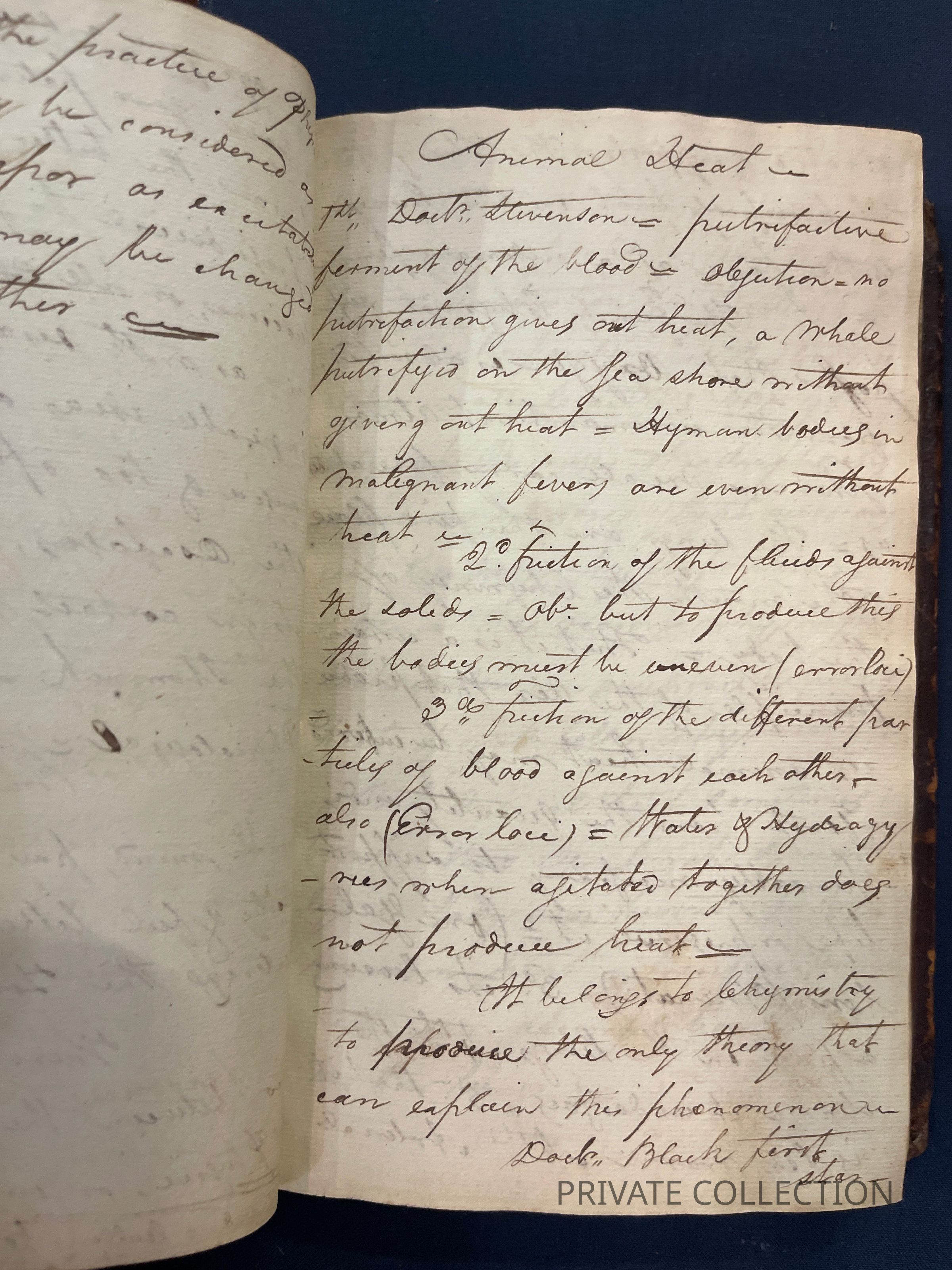Bound With: “Manuscript Notes of Rice W. Hood (RWH), a private student of Rush’s who continued correspondance with Rush for several years afterwards. (2 letters from Hood to Rush in Libreary Company of PA) “Useful Hints collected from Doctor Rush’s Lectures on the Institutes of Medicine & Animal Practice and Doctor Wistar and Doctor Shippen on Anatomy, Surgery, and Obstetricy, Doctor Woodhouse on Chemistry, Dr. Physic on Chirugial practice and care, Doctor Delbees on Obstetricy, also from the attenand physicians to the Hospital, Bettering HOuse, Prison and Dispensary in Philadelphia with hints taken from different authors read there in the fall, winter and spring - commencing in Novermber 1801 and ending in April 1802”- a fascinating and unique multi-page manuscript filled with the authors lecture notes, self-pontifications, poetry, and other medical tidbits.Condition
