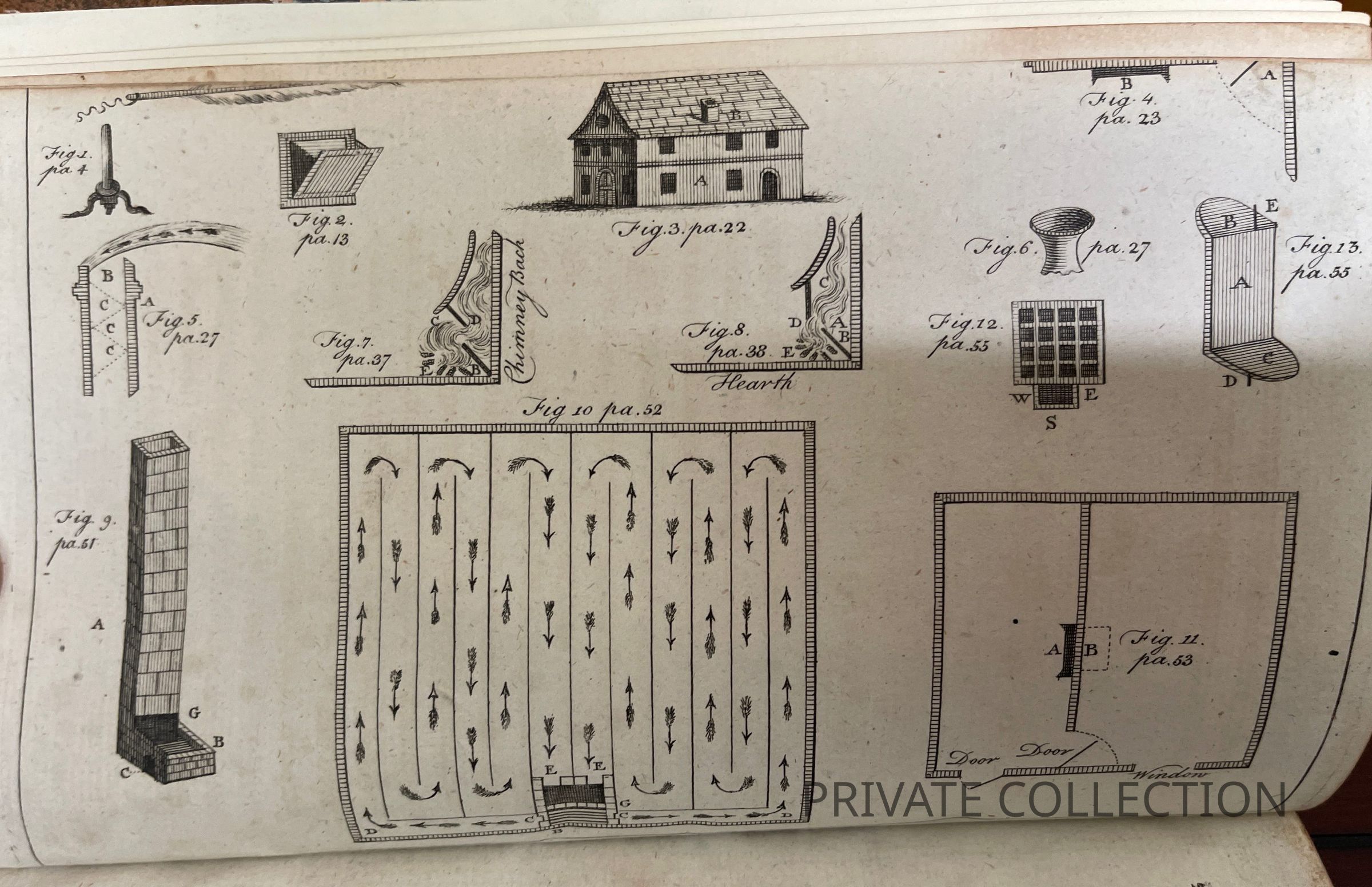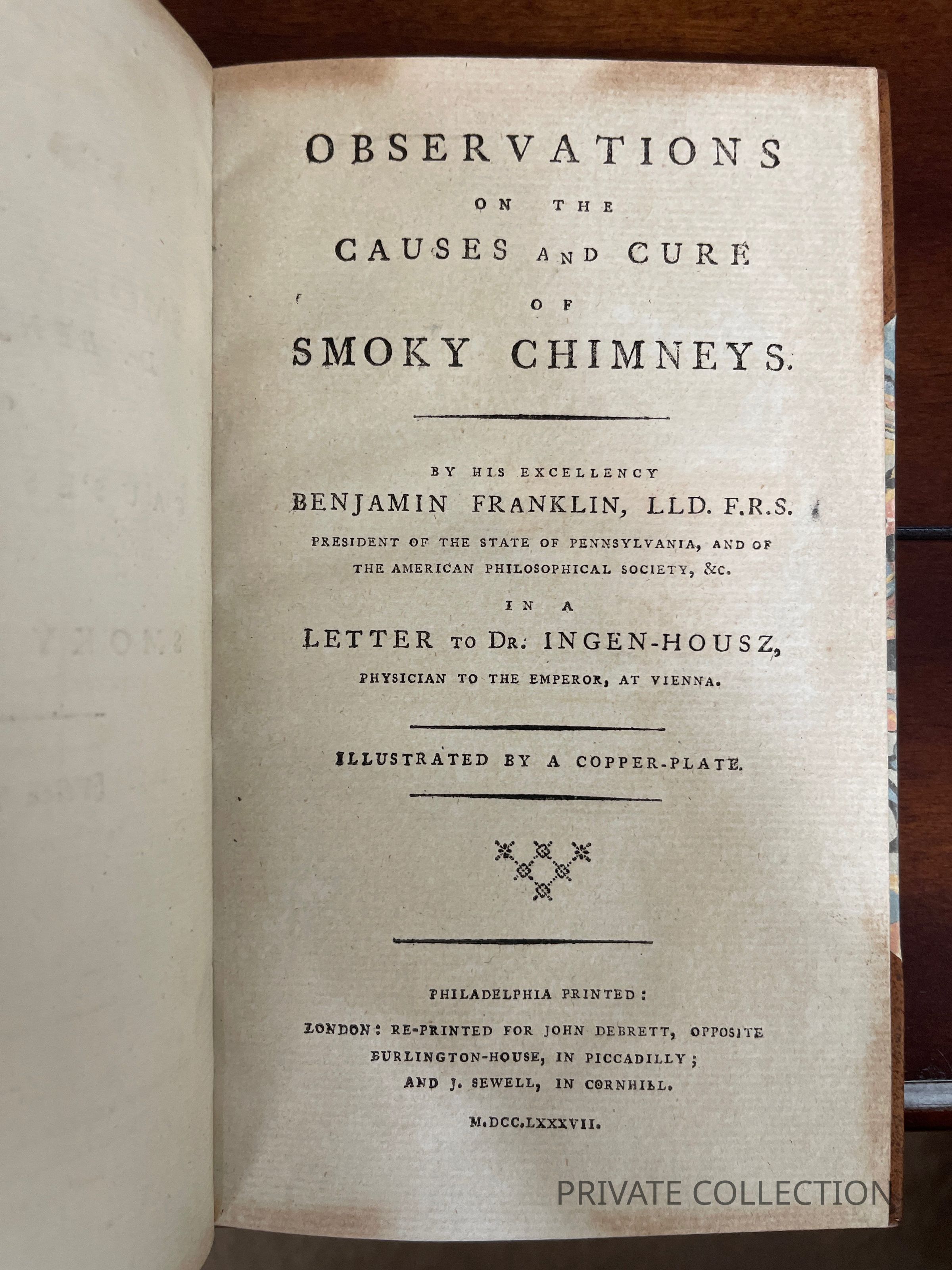 FRANKLIN, Benjamin. Observations on the Causes and Cure of Smoky Chimneys. London: Re-printed for John Debrett...,1787. [4],56pp. plus engraved plate (foredge slightly clipped) and one in text engraving. Ford 375. This is the first British edition, printed the same year as the first separate American printing, of an interesting article Franklin contributed to Vol. Two of the Transactions of the American Philosophical Society (1786). It is a notable technical contribution by Franklin, which sets forth his ideas on smoky chimneys, measuring humidity, coal-burning stoves, efficient chimneys, and the like. The engraved plate depicts the working of chimneys, air-flow through room, and diagrams of chimney accessories.