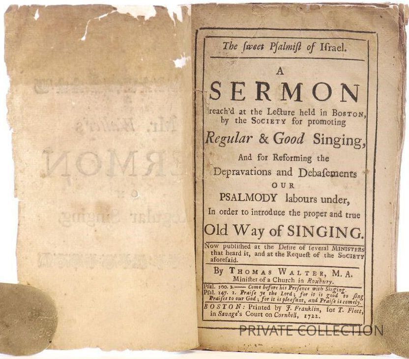 Walter and others prescribed that tunes be formalized and notes written out for the congregation to follow. This led the publication of his landmark The Grounds of Rules of Musick Explained: Or, an Introduction to the Art of Singing, published in 1721, also by James Franklin. It carried with it the recommendations of Increase Mather, Cotton Mather, Joseph Sewall, Thomas Prince, Benjamin Colman, and more. The second edition added the names of John Hancock, John Cotton, etc. Unsurprisingly, it started a pamphlet war, splitting churches and occupying the presses until 1725. The epicenter of this battle was the audience of our present address, The Society for Promoting Regular & Good Singing.