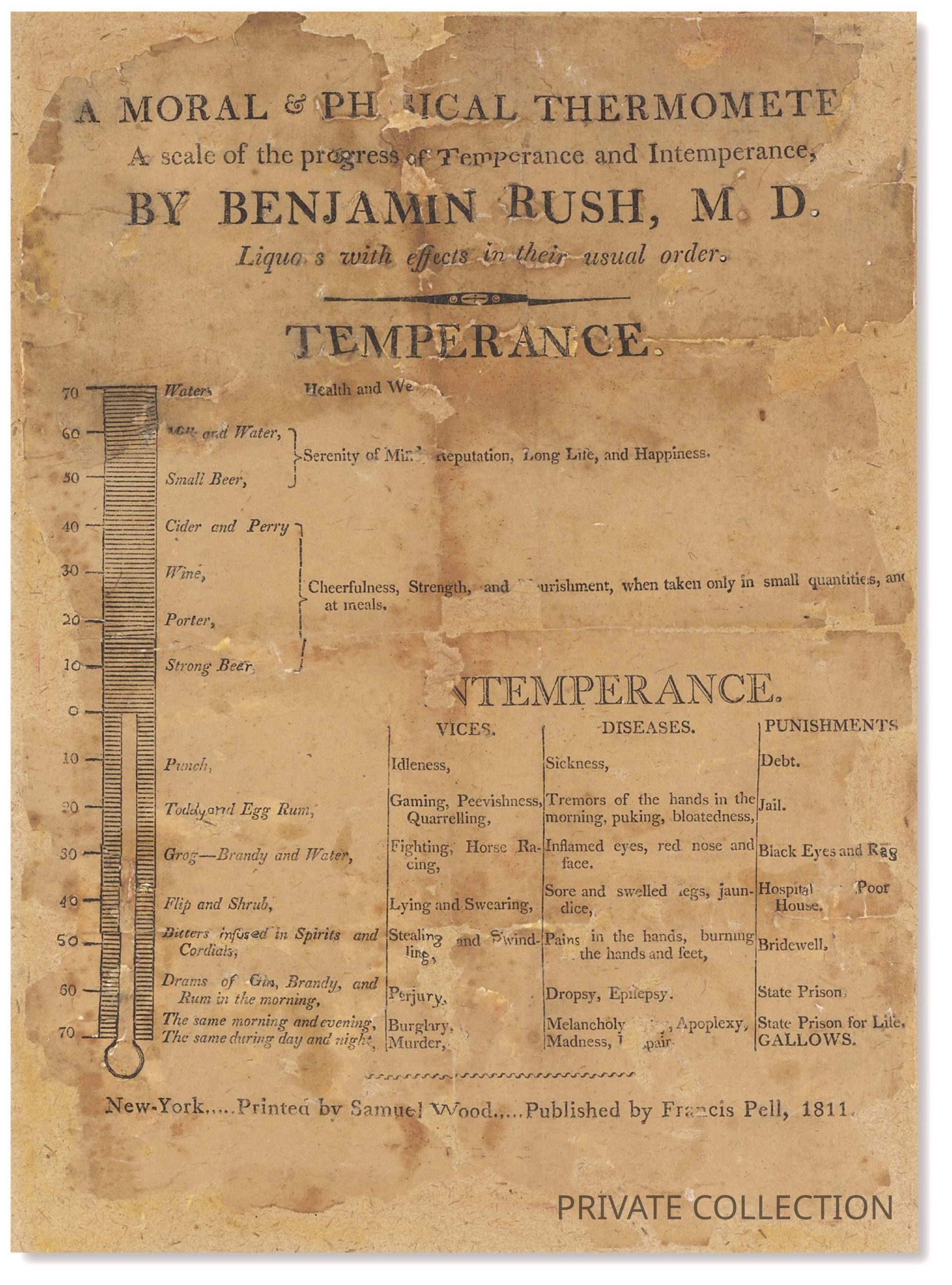 A rare and previously unrecorded illustrated broadside published in 1811, New York, drawn from Benjamin Rush’s text An inquiry into the effects of spirituous liquors on the human body. To which is added, a moral and physical thermometer…, later revised as An Inquiry Into the Effects of Ardent Spirits Upon the Human Body and Mind.
