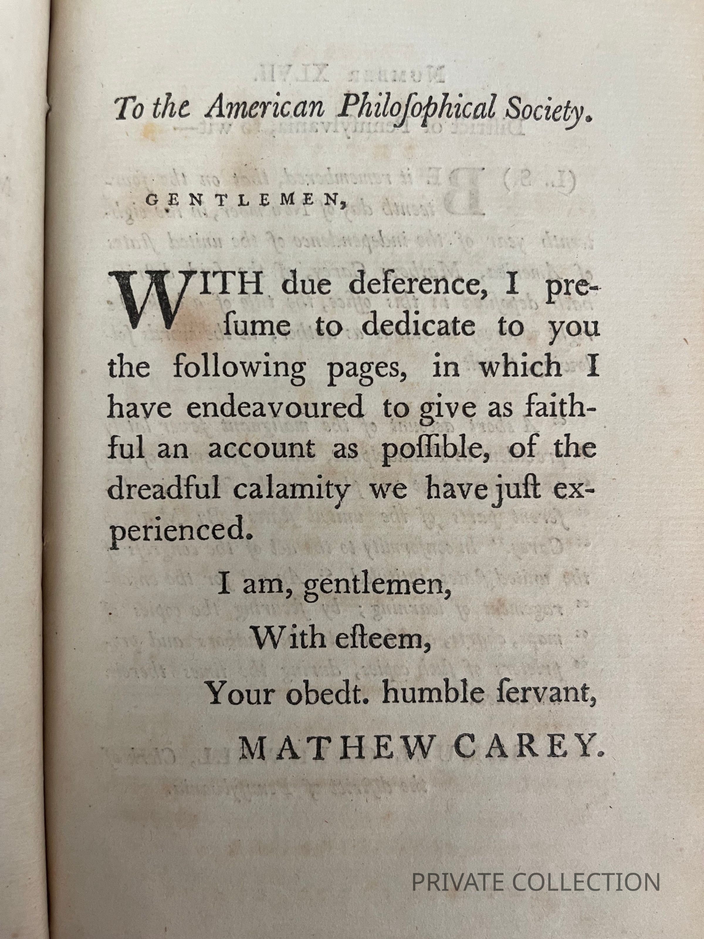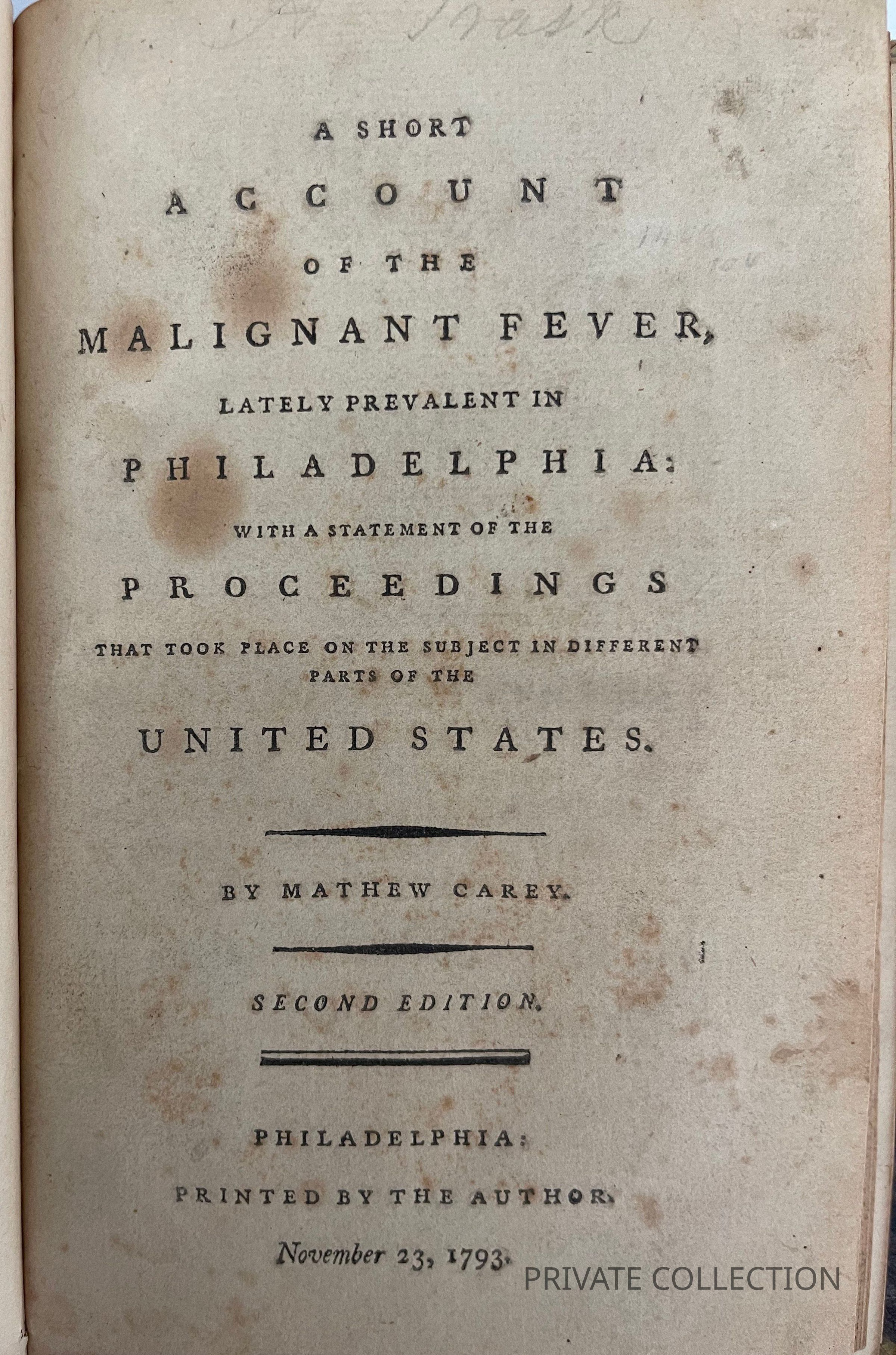 "One of the foremost American publishers of the late 18th- and early 19th-centuries, Carey was also a prolific author, among whose works is this first-hand account of the yellow fever epidemic which claimed the lives of more than 4,000 Philadelphians between August and November 1793.... The author's account of the epidemic's effect on daily life--the cessation of commerce, the interruption of political activity, and the dissolution of bonds among friends and within families--is reminiscent of passages from Boccaccio, Defoe or Manzoni" (annotation to Miner 80, the 1st ed.).
