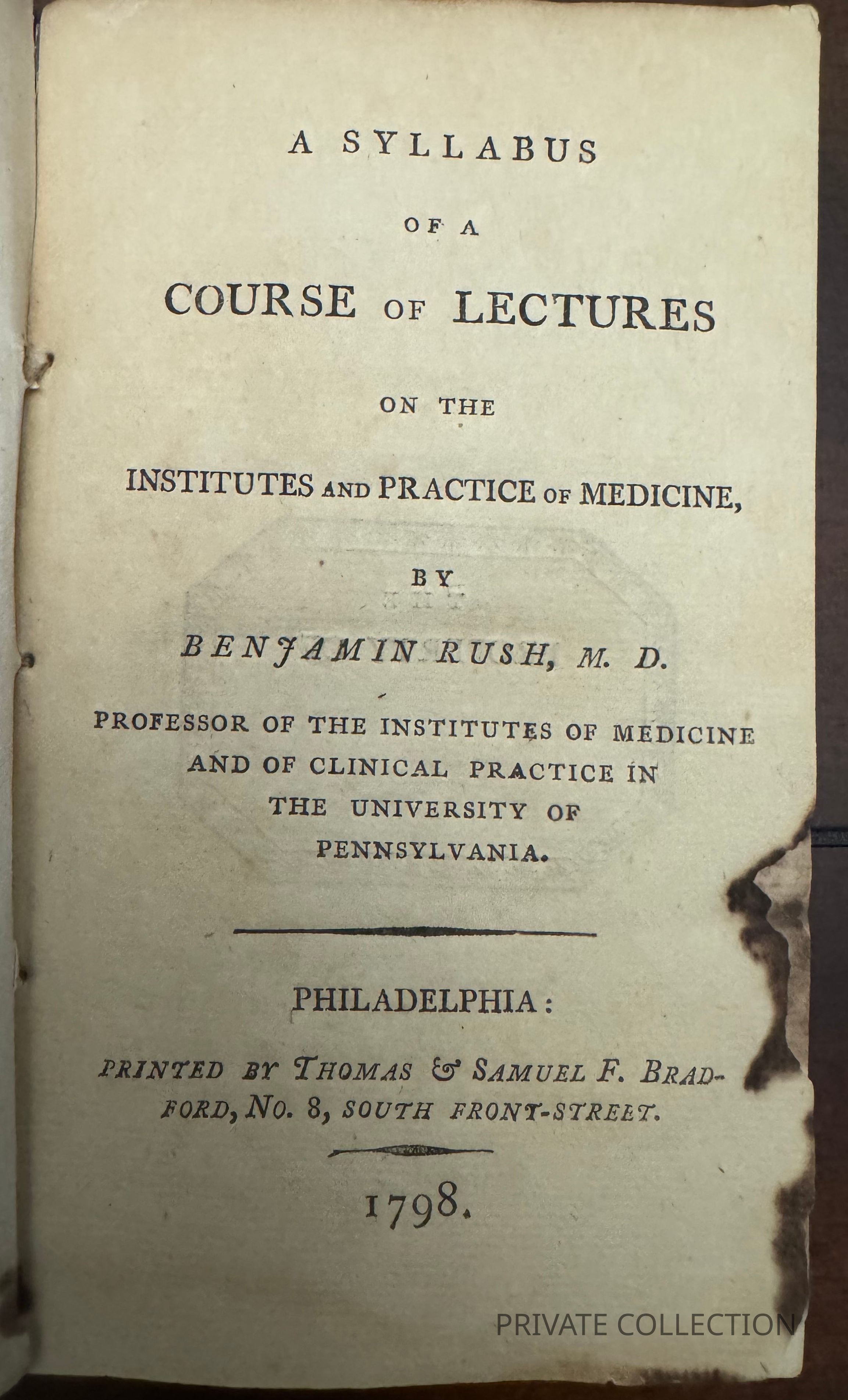 Rare. This work was written and distributed by Rush for his lecture class in 1798 at the University of Pennsylvania. Most of all copies of this syllabus are either held by institutions or have come from institutions.