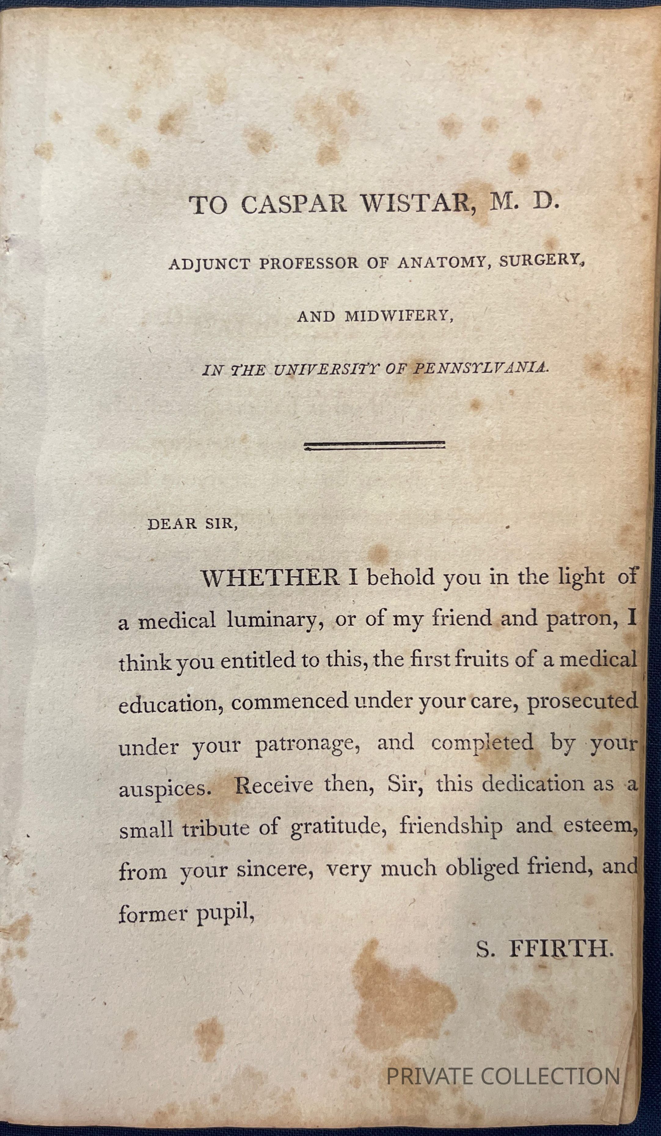 The author's inaugural dissertation at the University of Pennsylvania. The most remarkable portion of this work ("Experiments on the black vomit, &c." pp. 53-60) describes fifteen experiments which Firth undertook in 1802 and 1803 to prove the non-contagiousness of yellow fever. Most of these Flirth performed on himself: sleeping in the same bed with patients; filling subcutaneous pockets in his arms and legs with fresh vomit, blood, bile, sweat, saliva or urine from yellow fever victims; ingesting black vomit, inhaling its vapors, etc. (Miner)