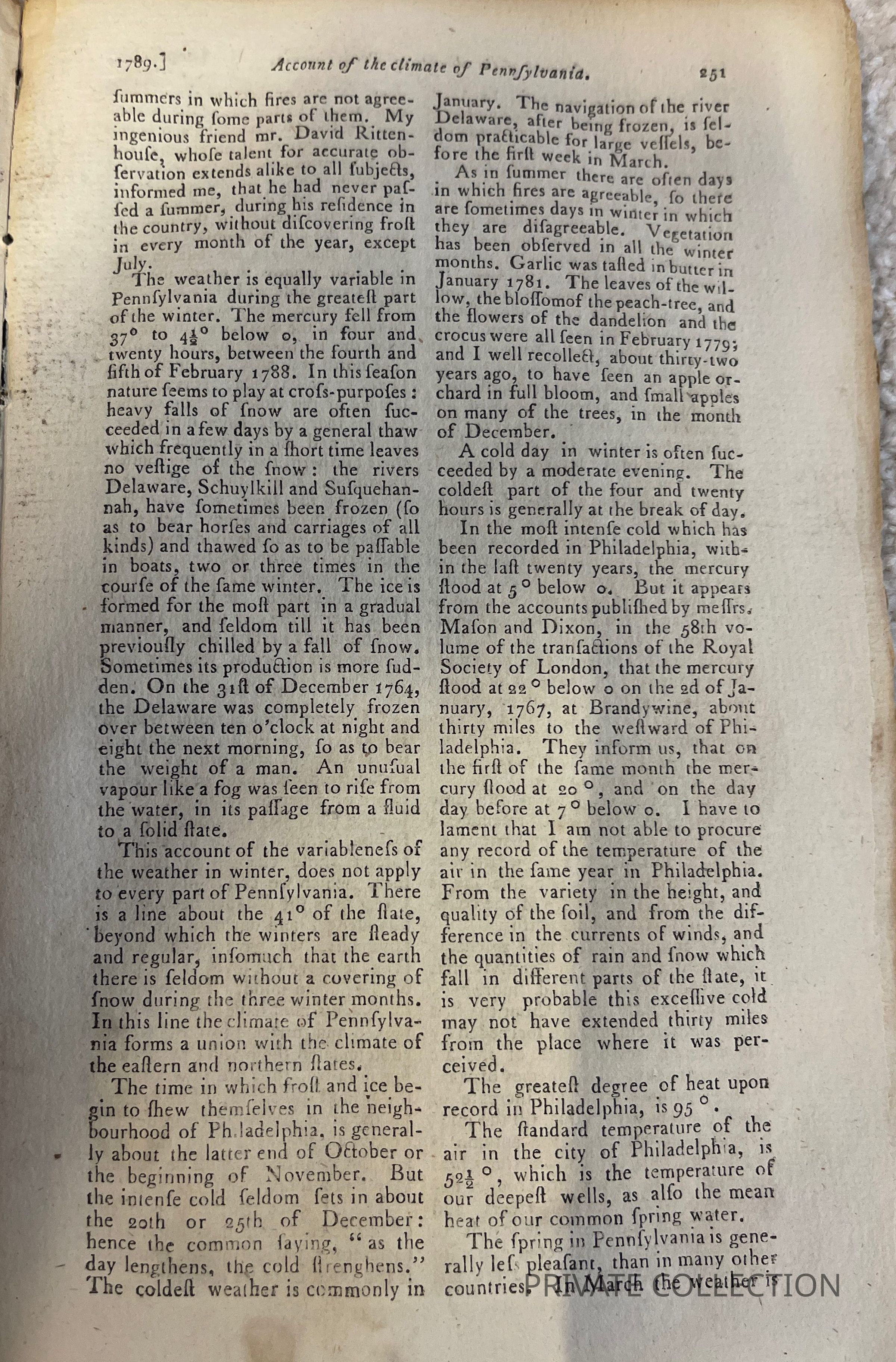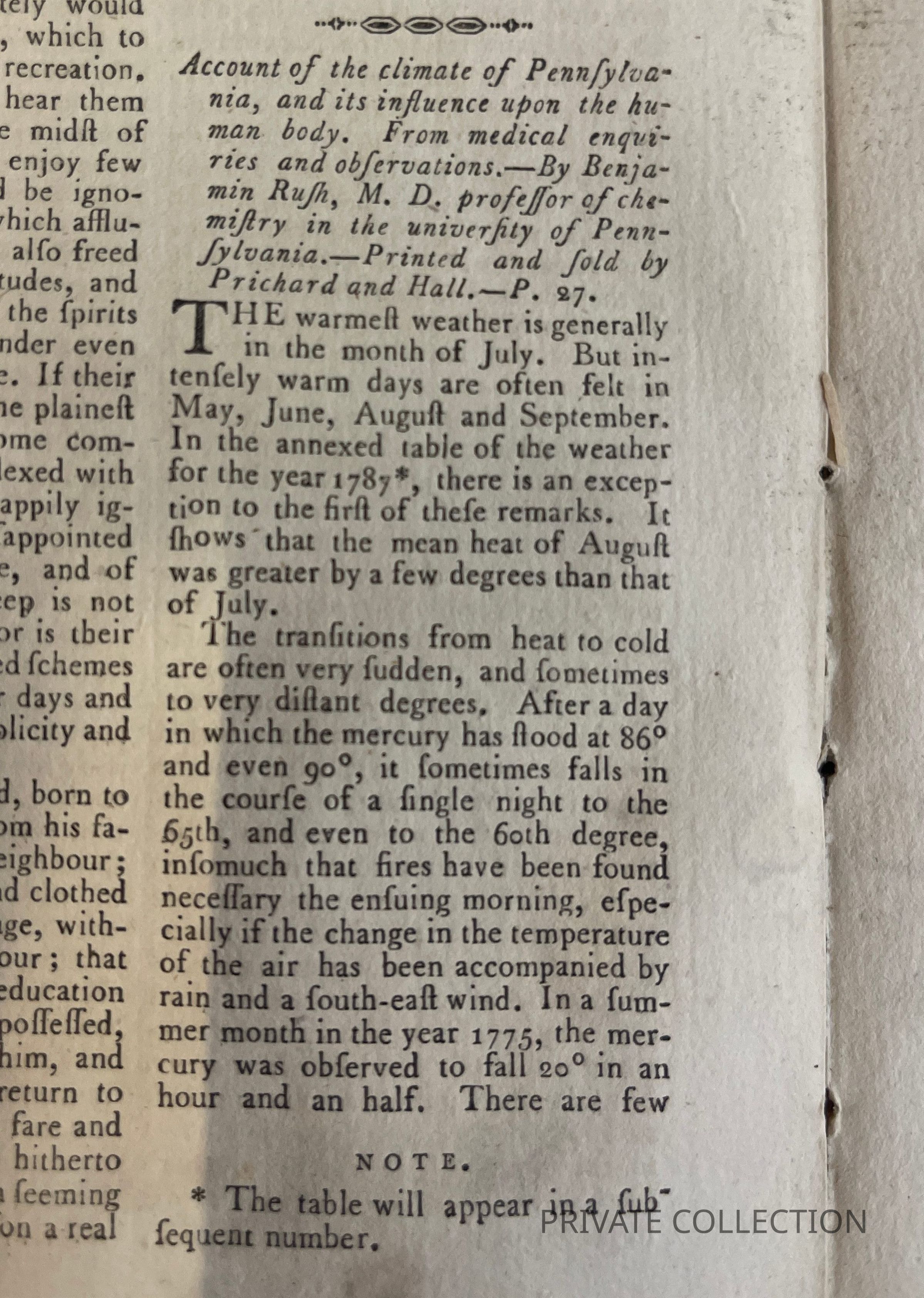 Several medical articles, including ‚ "An account of the climate of Pennsylvania and the influence upon the human body. from Medical Inquiries and Observations- By Benjamin Rush, MD, professor of chemistry in the university of Pennsylvania-..‚"