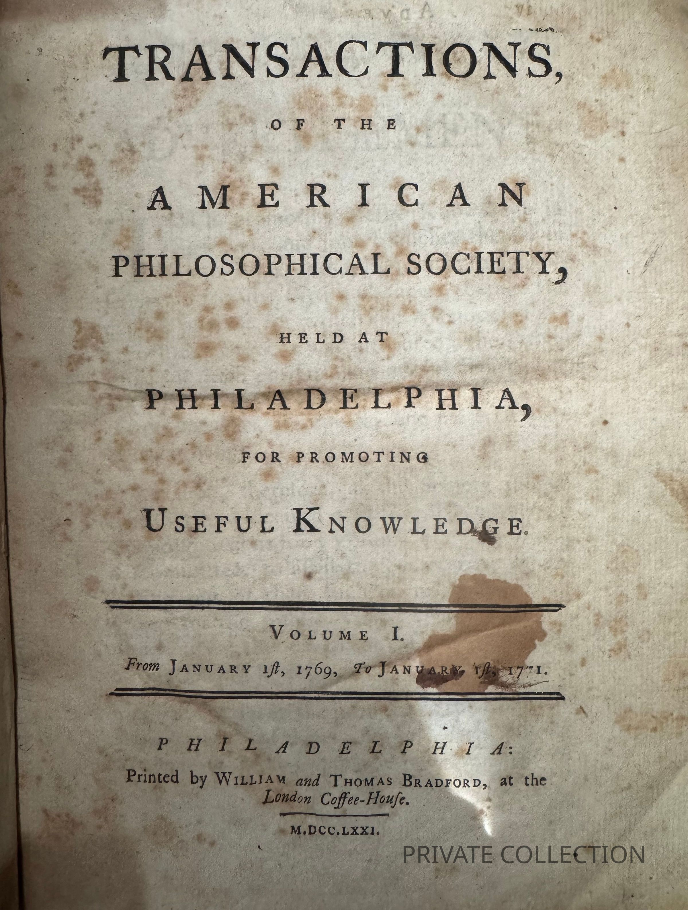 [AMERICAN PHILOSOPHICAL SOCIETY]. Transactions, of the American Philosophical Society, Held at Philadelphia, For Promoting Useful Knowledge. Volume I. From January 1st, 1769, TO January 1st, 1771.