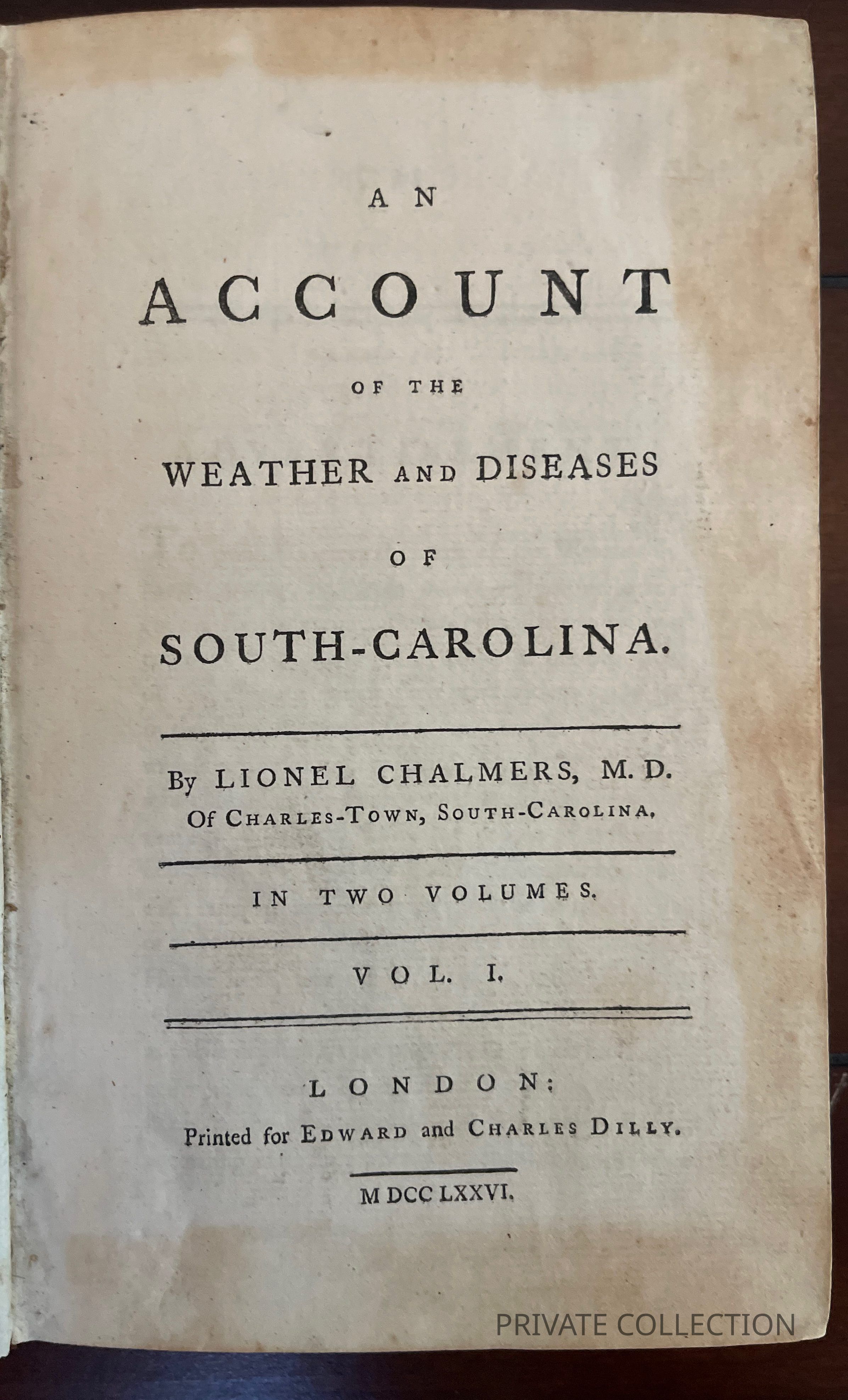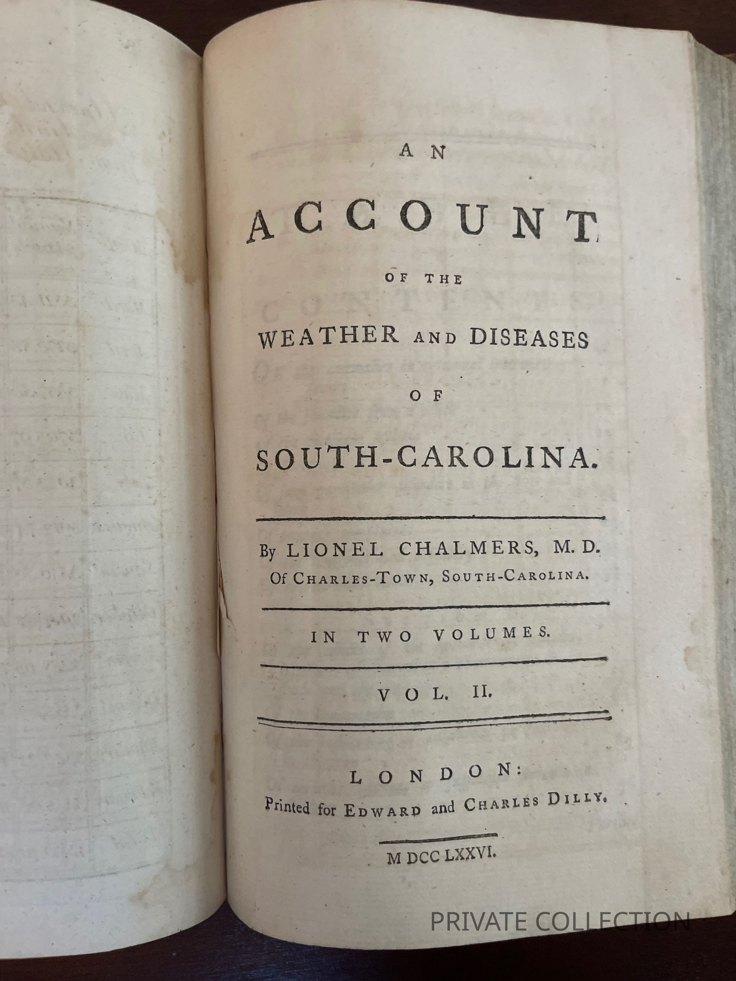 CHALMERS, Lionel. An Account of the Weather and Diseases of South Carolina. London: Edward and Charles Dilly, 1776. 1st ed. Two vols bound in one. viii, 222; 1v, 224pp. plus two folding charts.