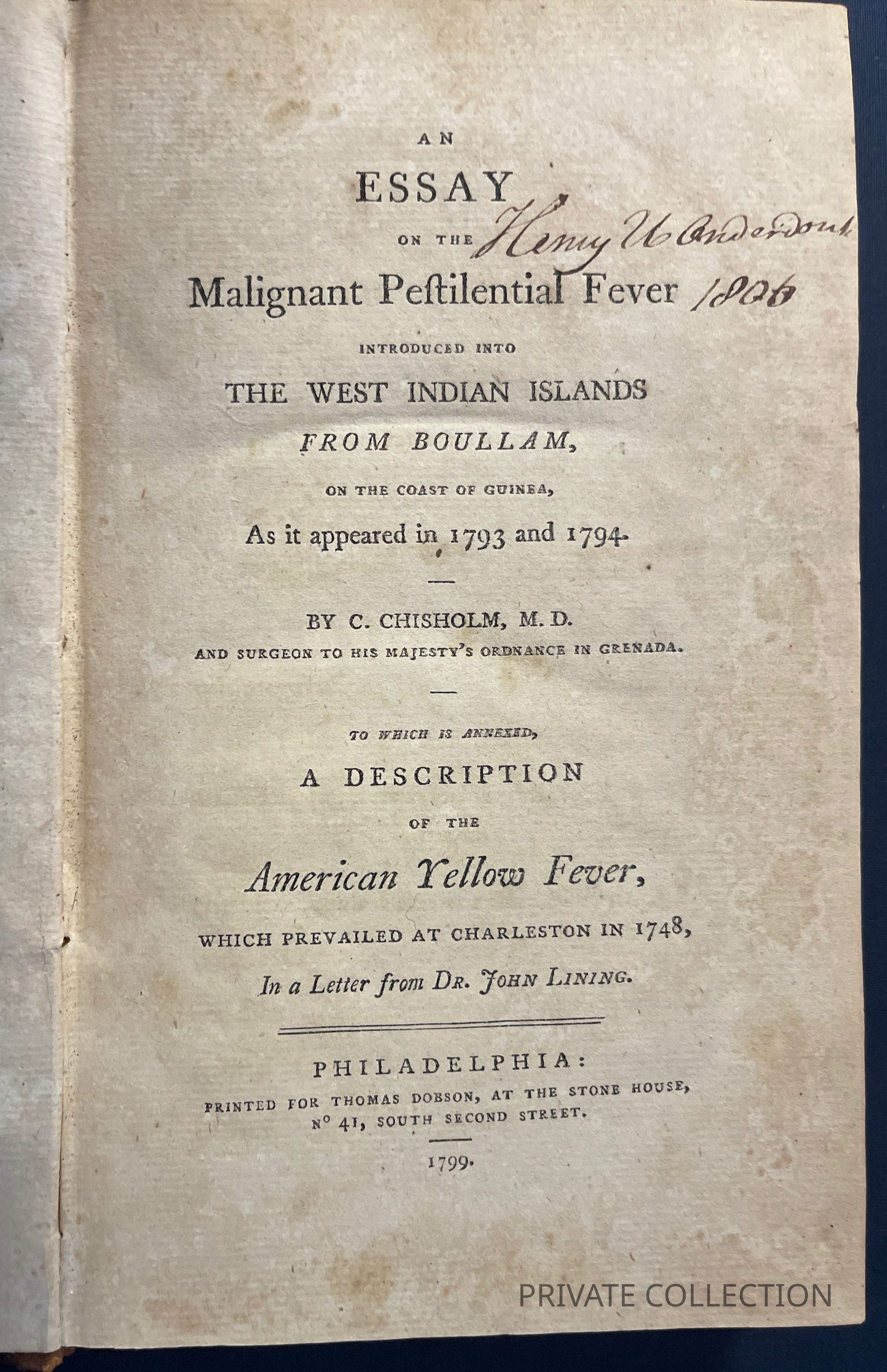 Chisholm, Colin, 1755-1825. An essay on the malignant pestilential fever introduced into the West Indian Islands from Boullam, on the coast of Guinea, as it appeared in 1793 and 1794...To which is annexed, A description of the American yellow fever, which prevailed at Charleston in 1748, in a letter from Dr. John Lining. Philadelphia: Printed for Thomas Dobson... 1799.