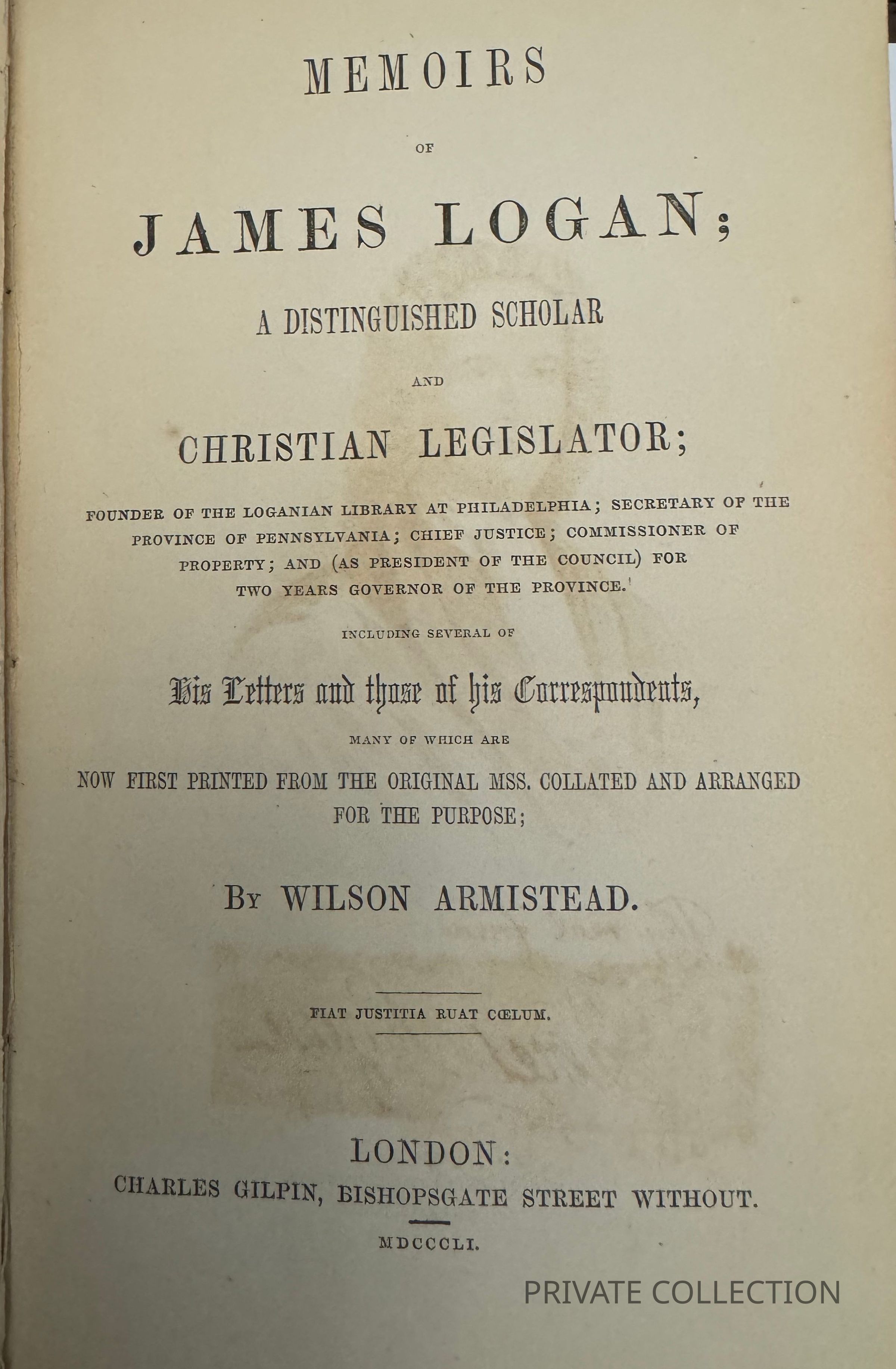 ARMISTEAD, Wilson. Memoirs of James Logan; A Distinguished Scholar and Christian Legislator; Founder of the Loganian Library at Philadelphia; Secretary of the Province of Pennsylvania; Chief