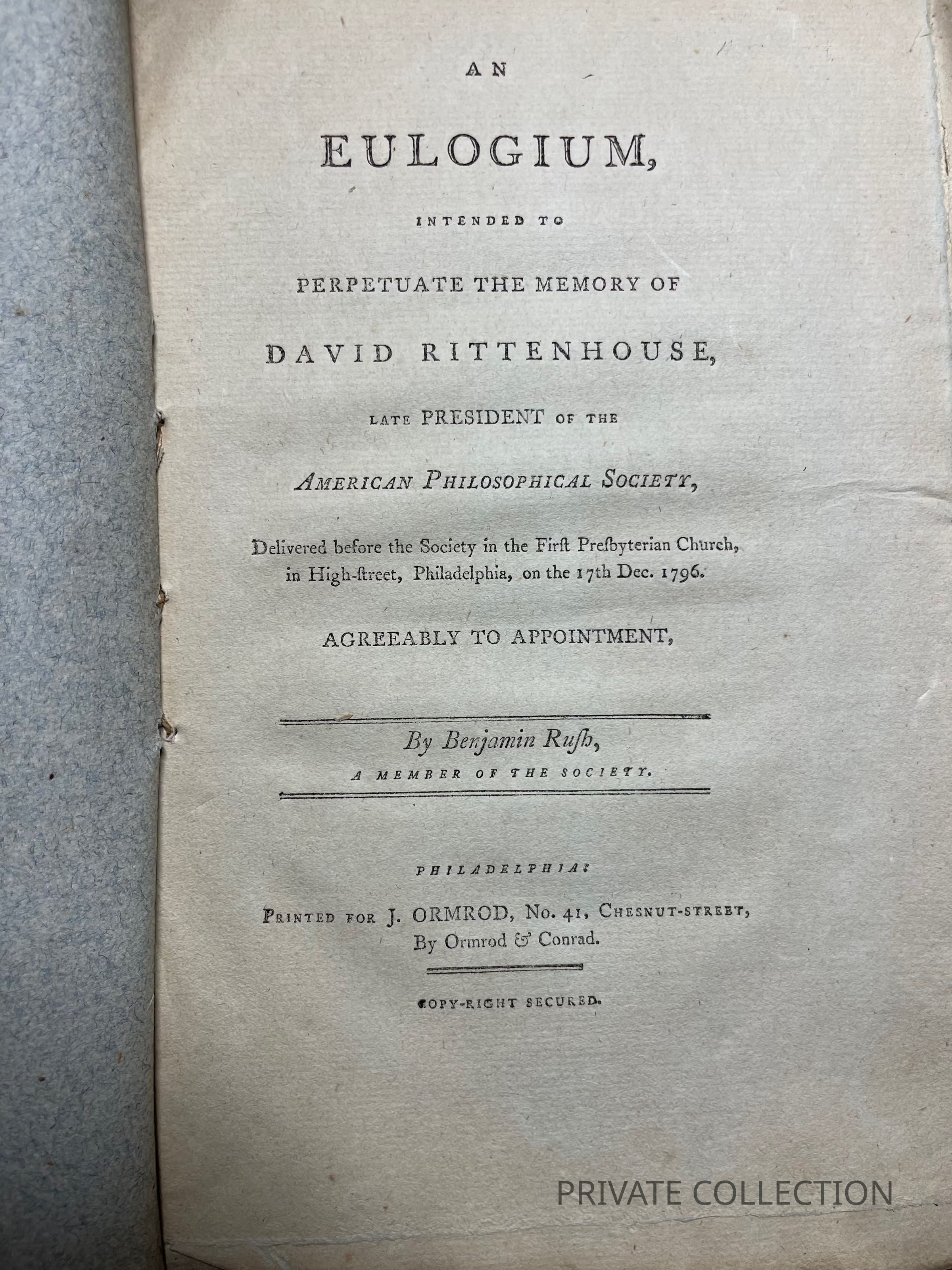 RUSH, Benjamin. An Eulogium Intended to Perpetuate the Memory of David Rittenhouse, Late President of the American Philosophical Society...Delivered...Philadelphia, 17th December, 1796. Phila.: J. Ormrod, [1796].Other Names and Numbers