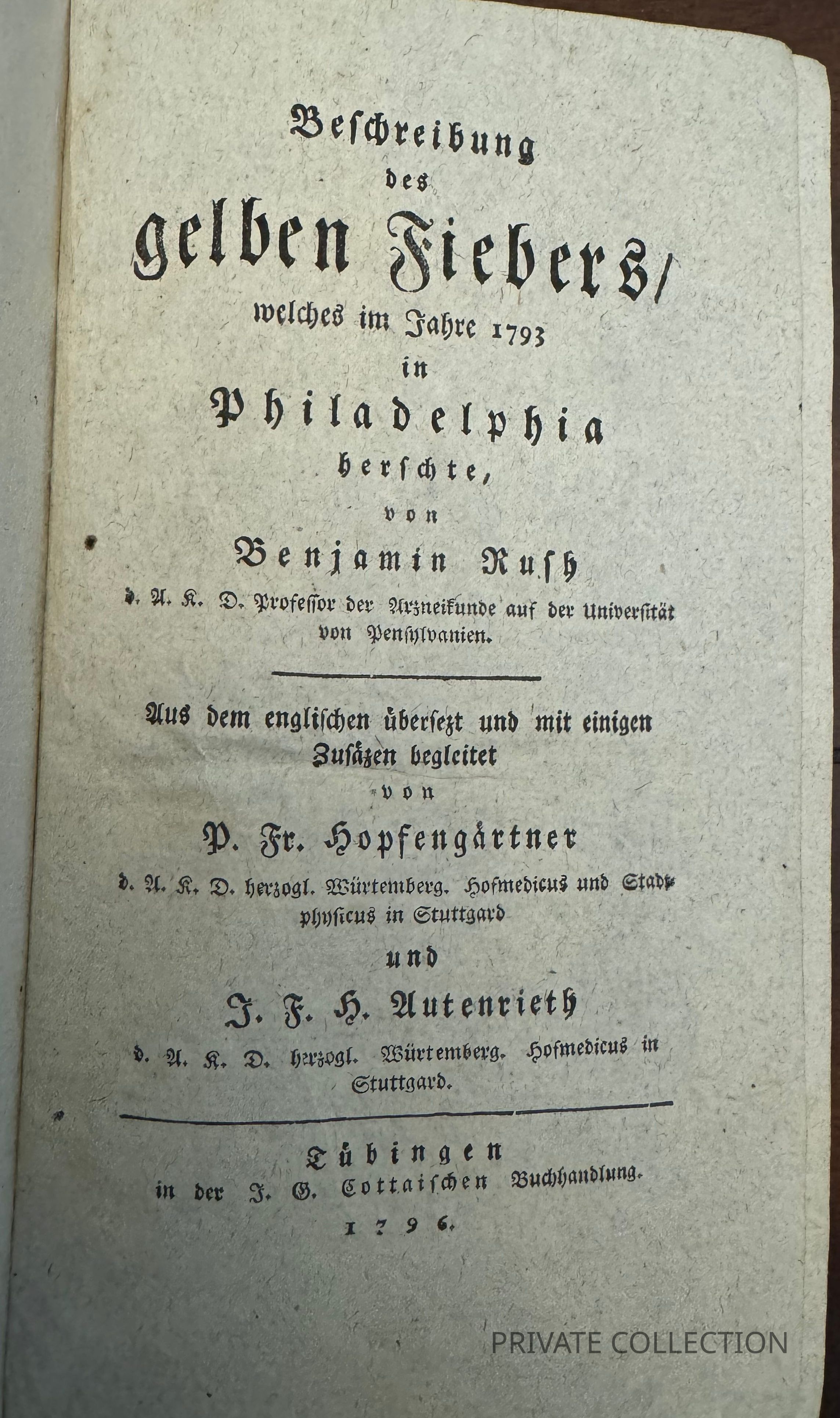 A very interesting and rare account of the Yellow Fever outbreaks in Philadelphia. This is the first German translation of Rush's "Account of the Bilious Remitting Yellow Fever 1793" that first appeared in 1793. This translation is notable because it contains some additional notes from people who were present in Philadelphia for the yellow fever epidemic.