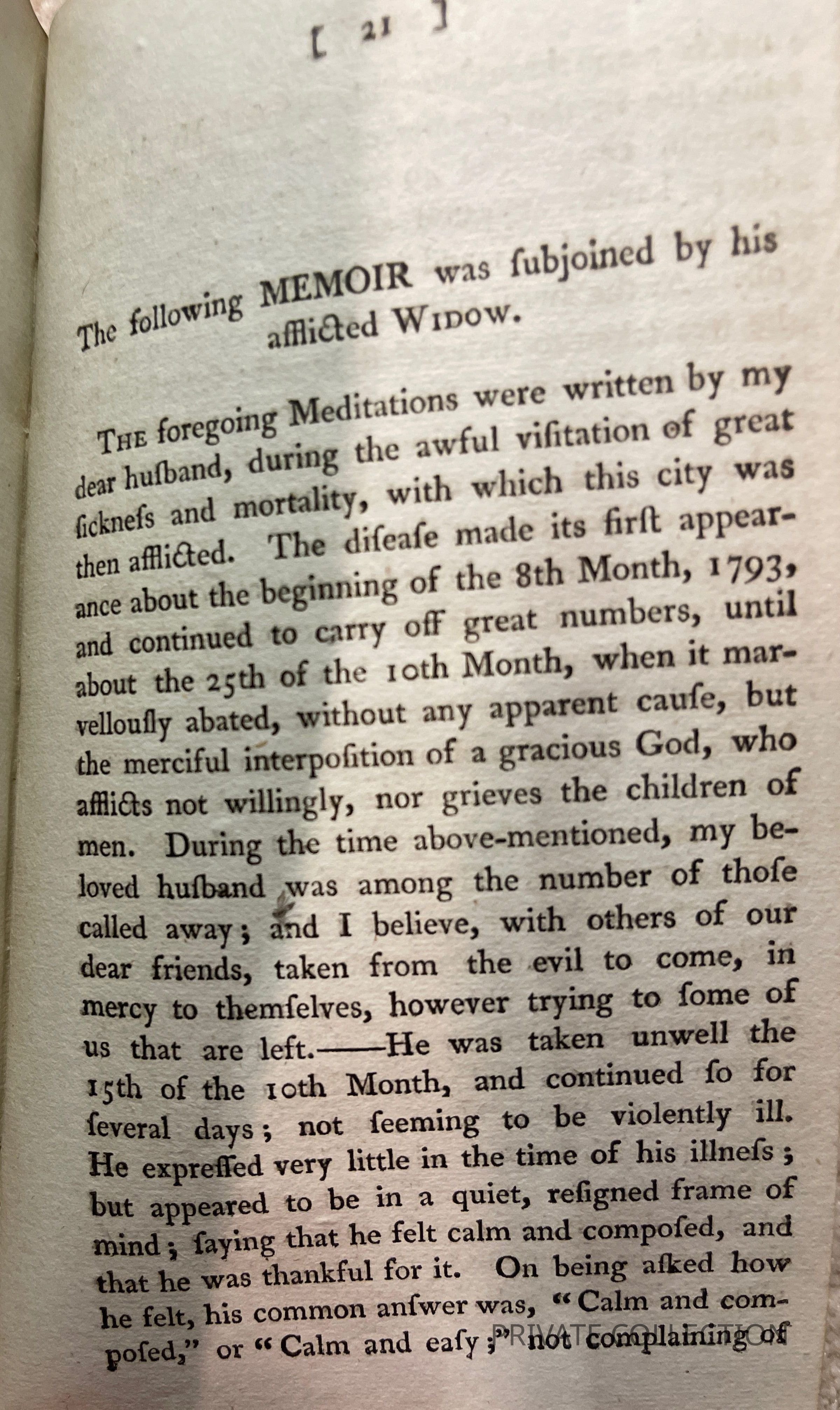Cresson, a Philadelphia Quaker, died of yellow fever on 21 October, 1793. His meditations on the epidemic, written during the month prior to his illness, were acquired and edited for publication by William Dillwyn (cf Sabin 17484). A memoir by Cresson's widow is included. (Miner)Other Names and Numbers