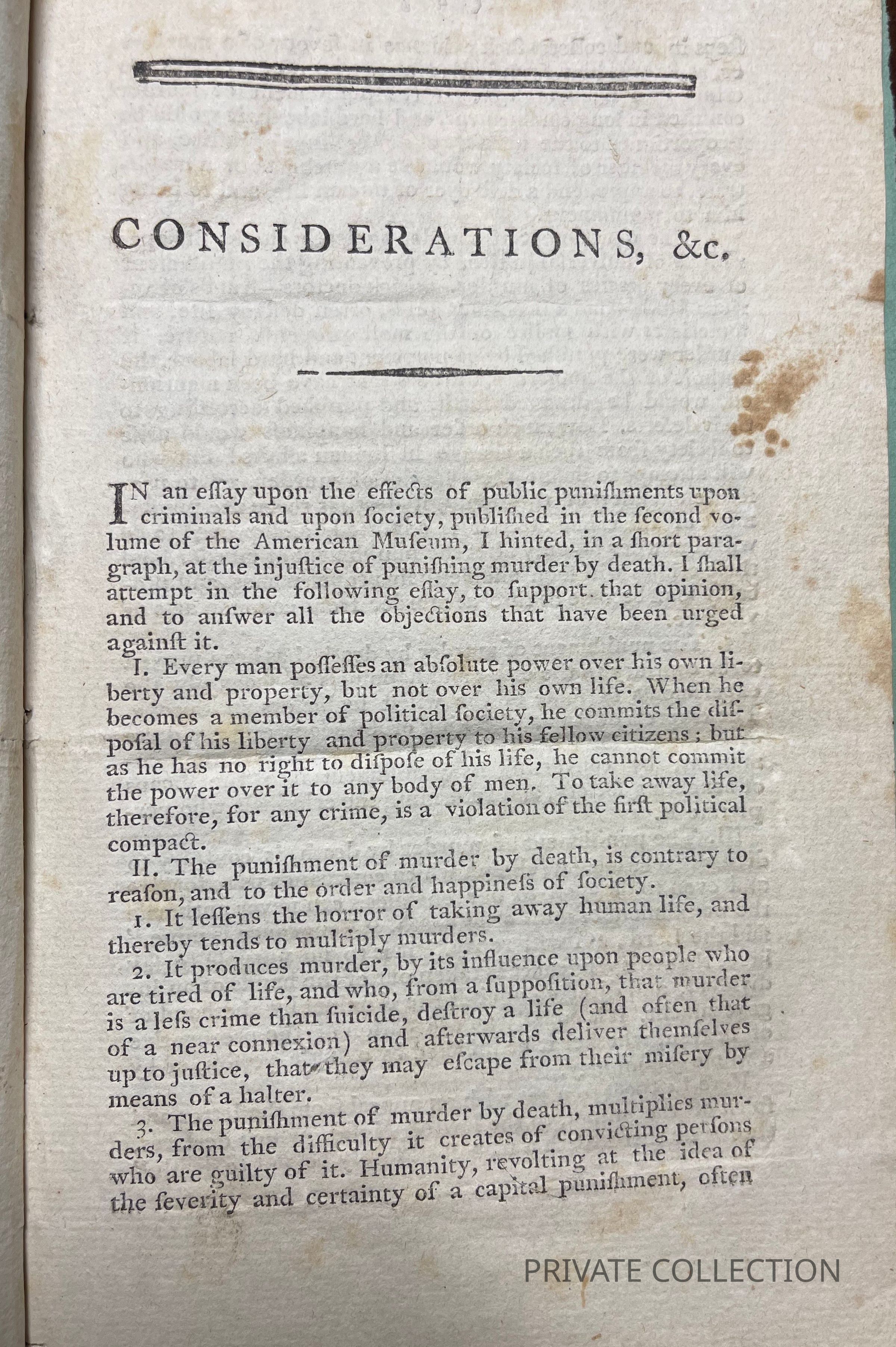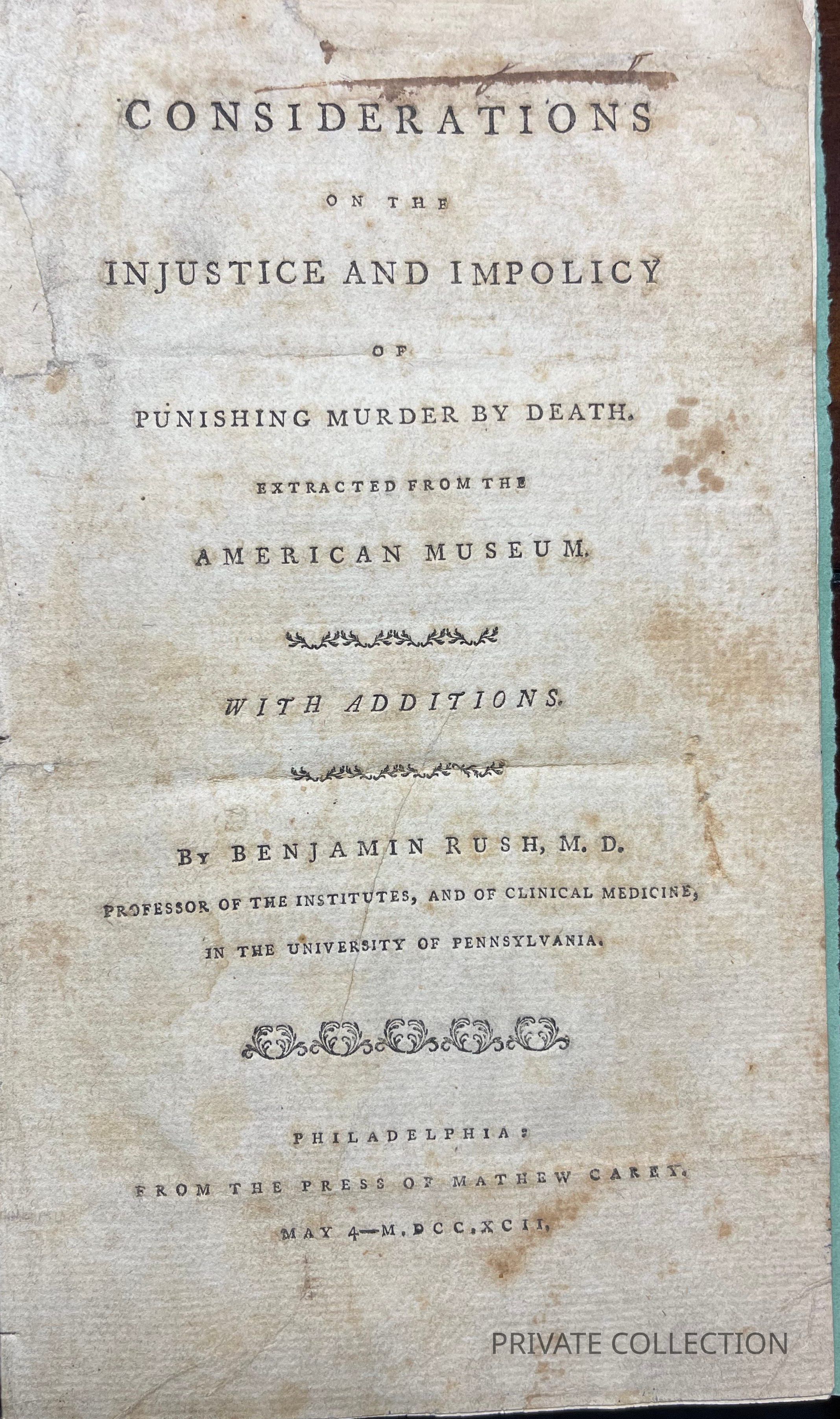 1798-1). Butterfield (Letters, 480, n. 1) says that "this was the earliest form of BR's assault on capital punishment, an assault that was to become a fierce and protracted campaign... As a result of the movement he had initiated, BR could announce in a postscript to his article when it was reprinted in his Essays (1798) that capital punishment had been abolished in Pennsylvania for all crimes except first-degree murder." A critical reply to Rush's "Enquiry," written by Robert Annan under the pseudonym "Philochoras," appeared in the American Museum 4 (November 1788):-54, and (December 1788): 547-53. For Rush's "Rejoinder" to Annan's "Reply," see RUSH- FOX:1789(23) in this collection.Note Type