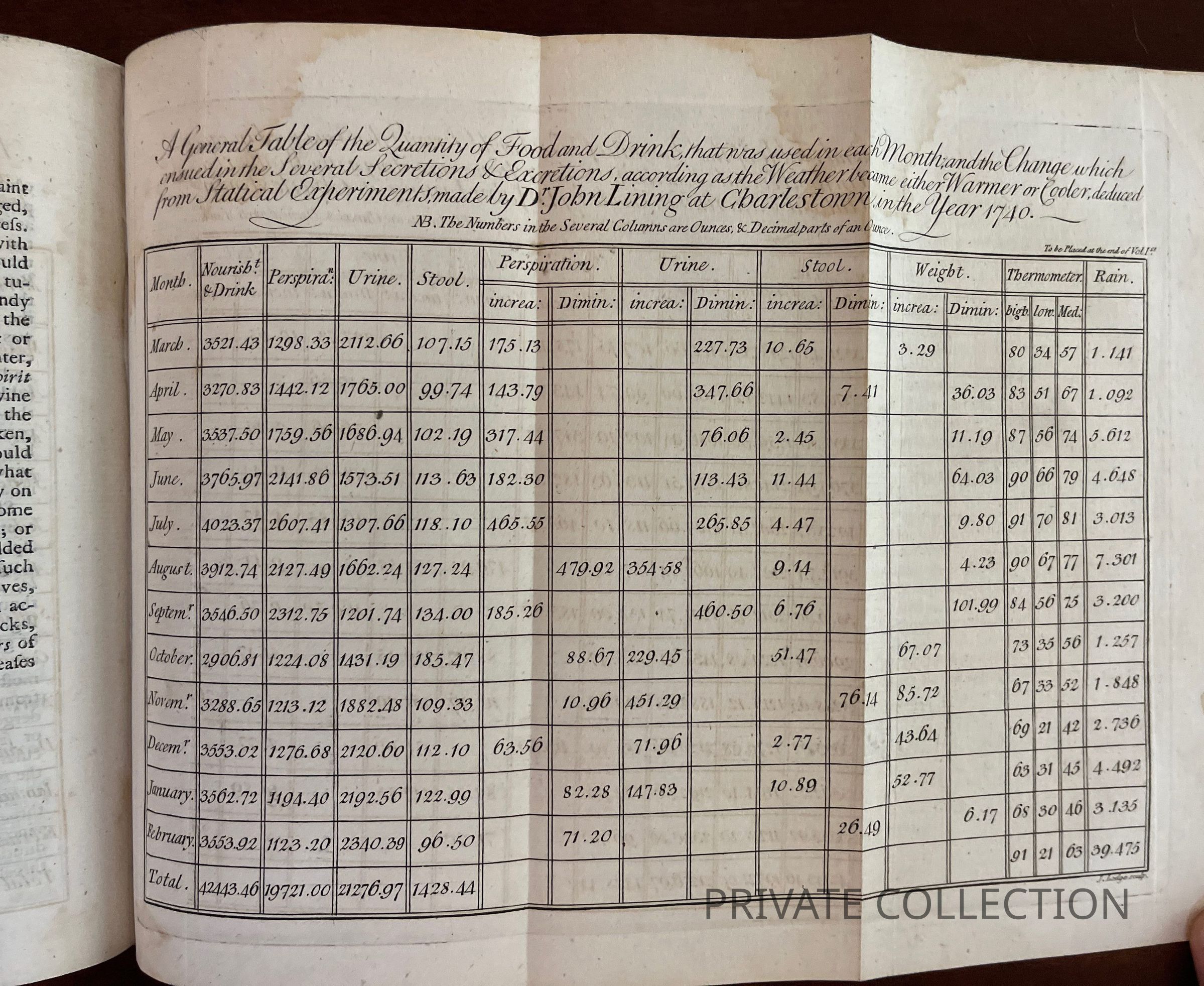 CHALMERS, Lionel. An Account of the Weather and Diseases of South Carolina. London: Edward and Charles Dilly, 1776. 1st ed. Two vols bound in one. viii, 222; 1v, 224pp. plus two folding charts.