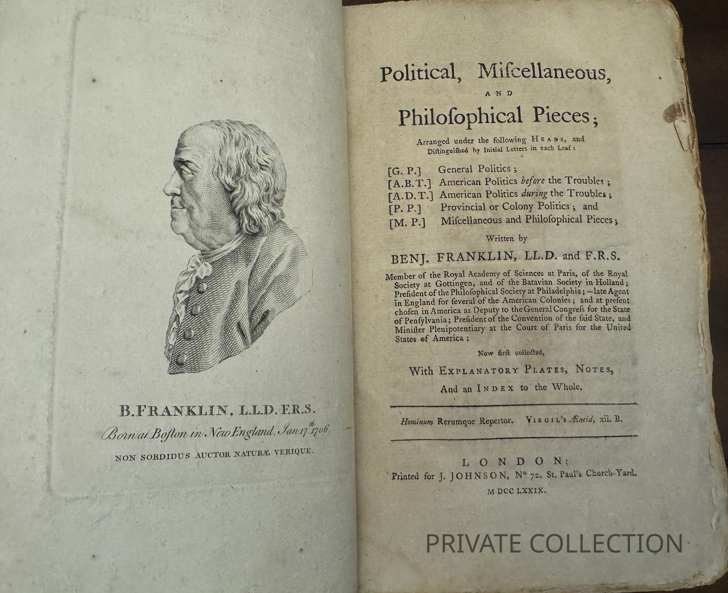 1st edition of the only edition of Franklin's writings (except his scientific pieces) written during his lifetime. It was done with Franklin's blessing and contains an errata written by him for the book.