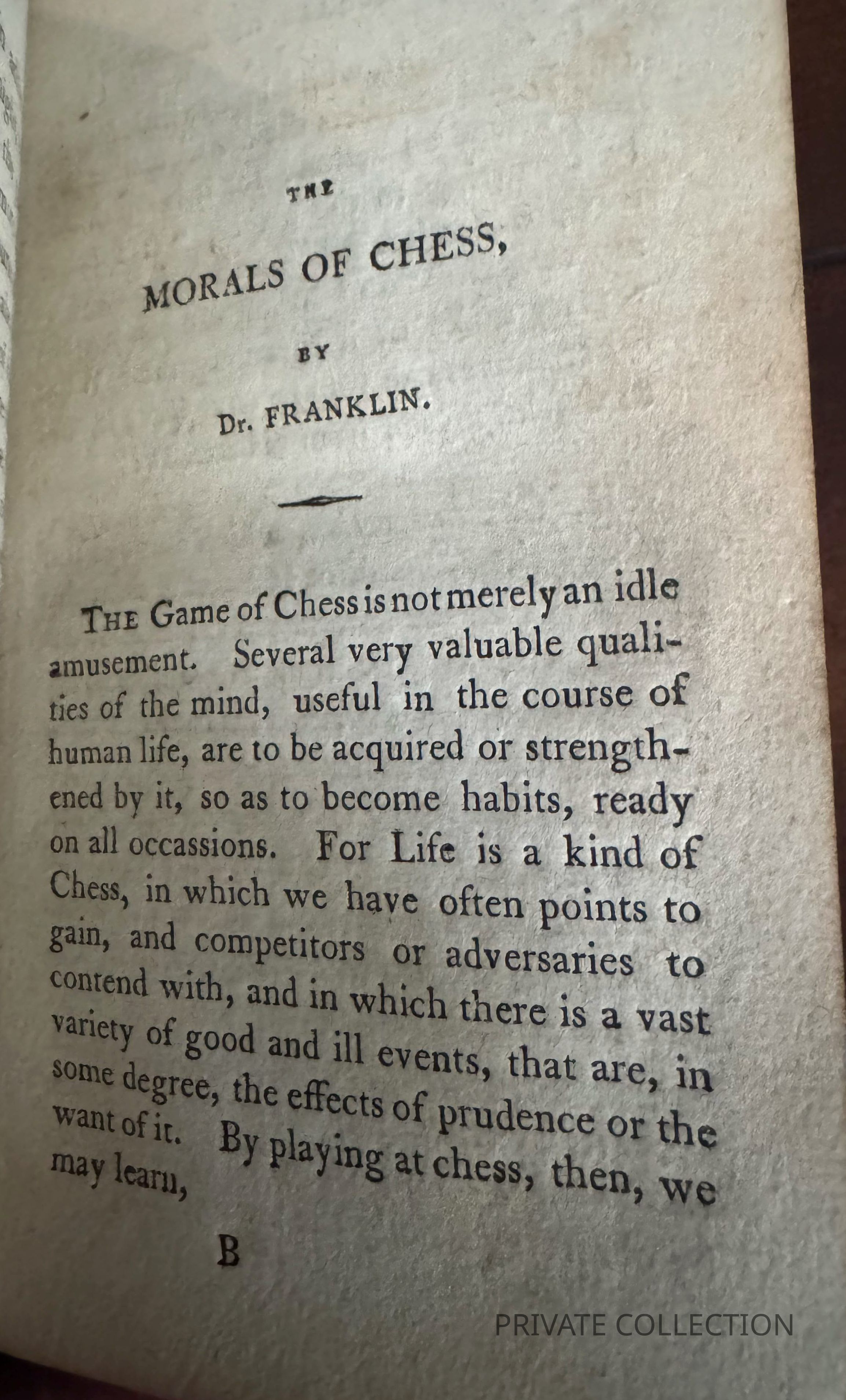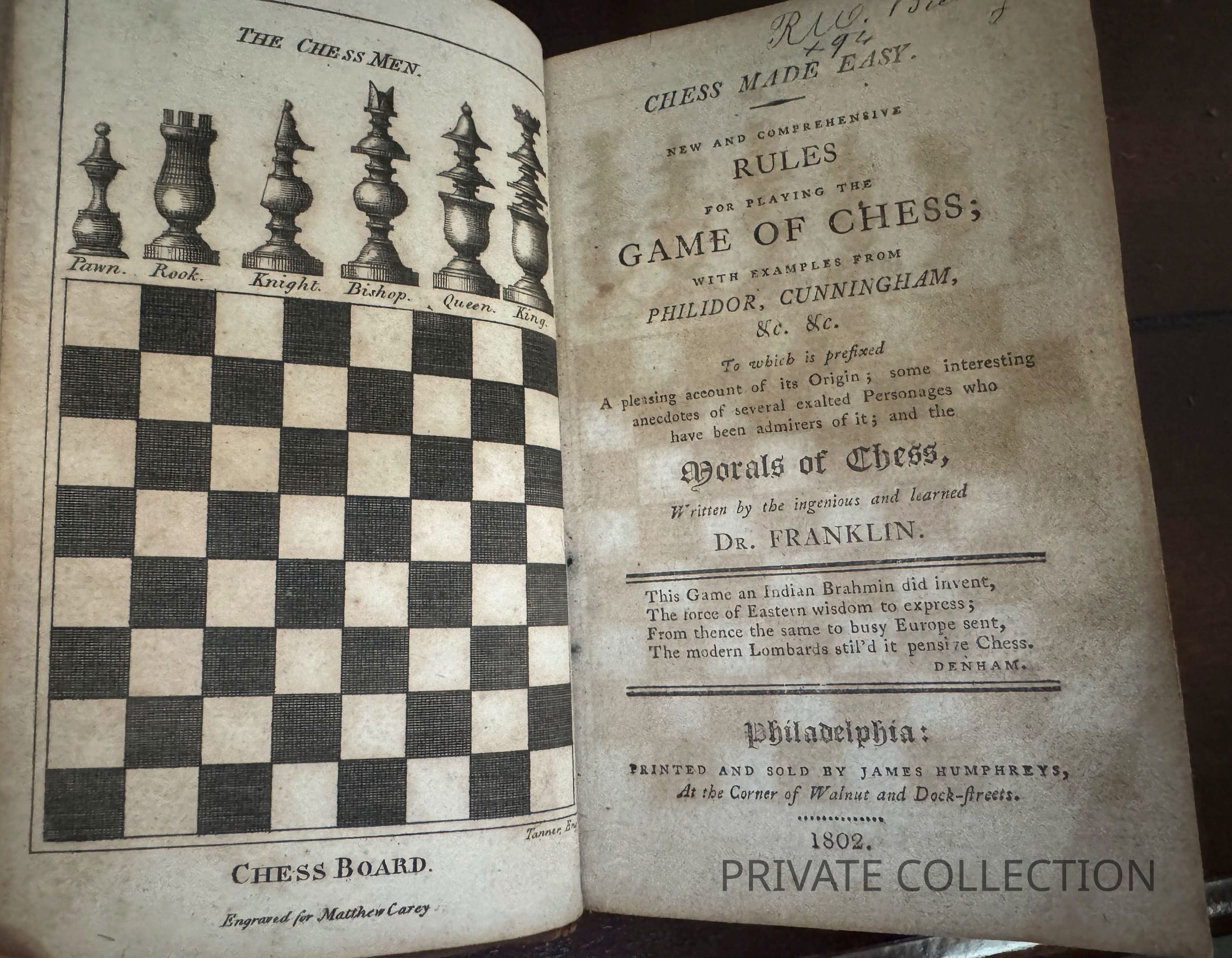 The first American book on the game of Chess. This includes the first American printing of Franklin's "THE MORALS OF CHESS."