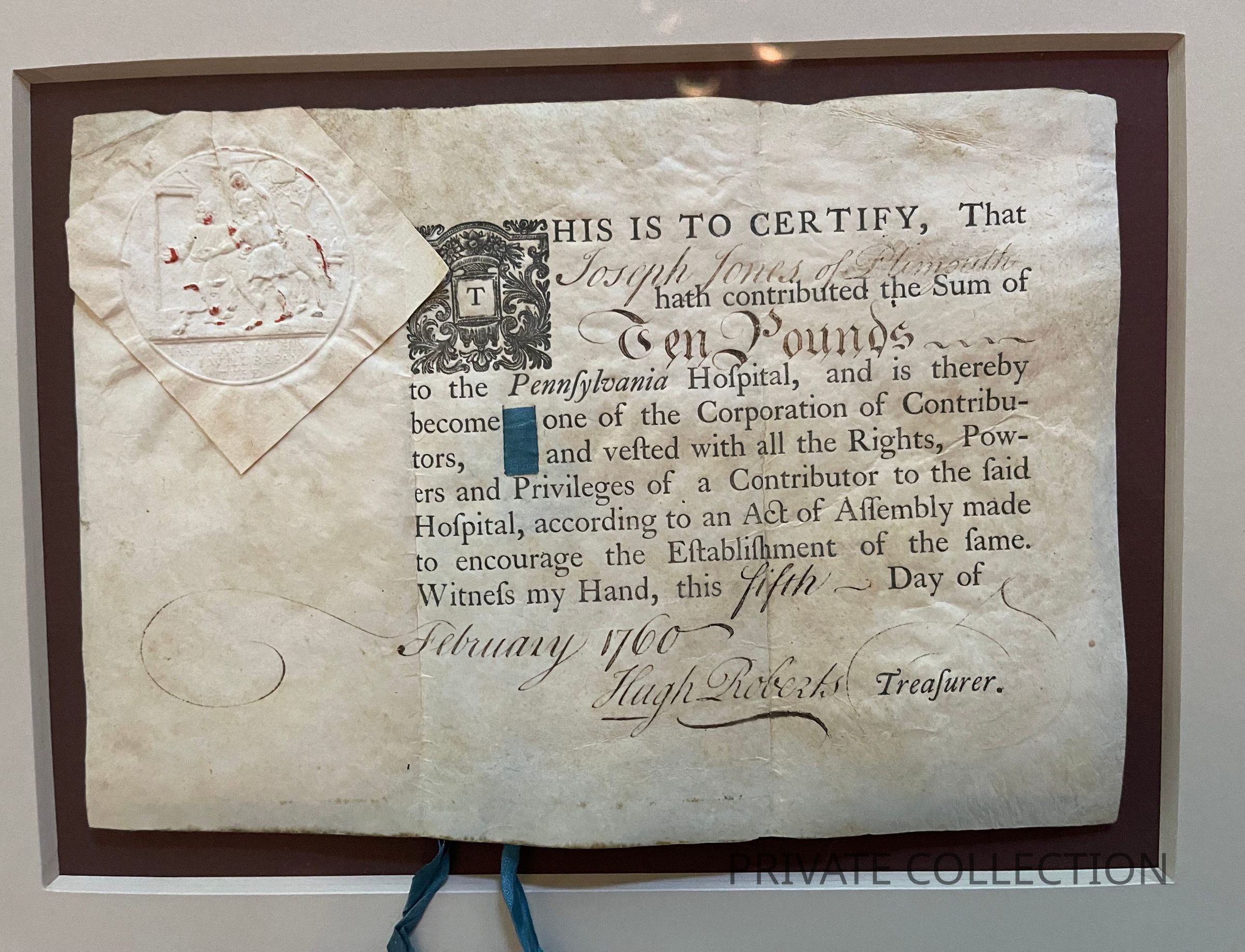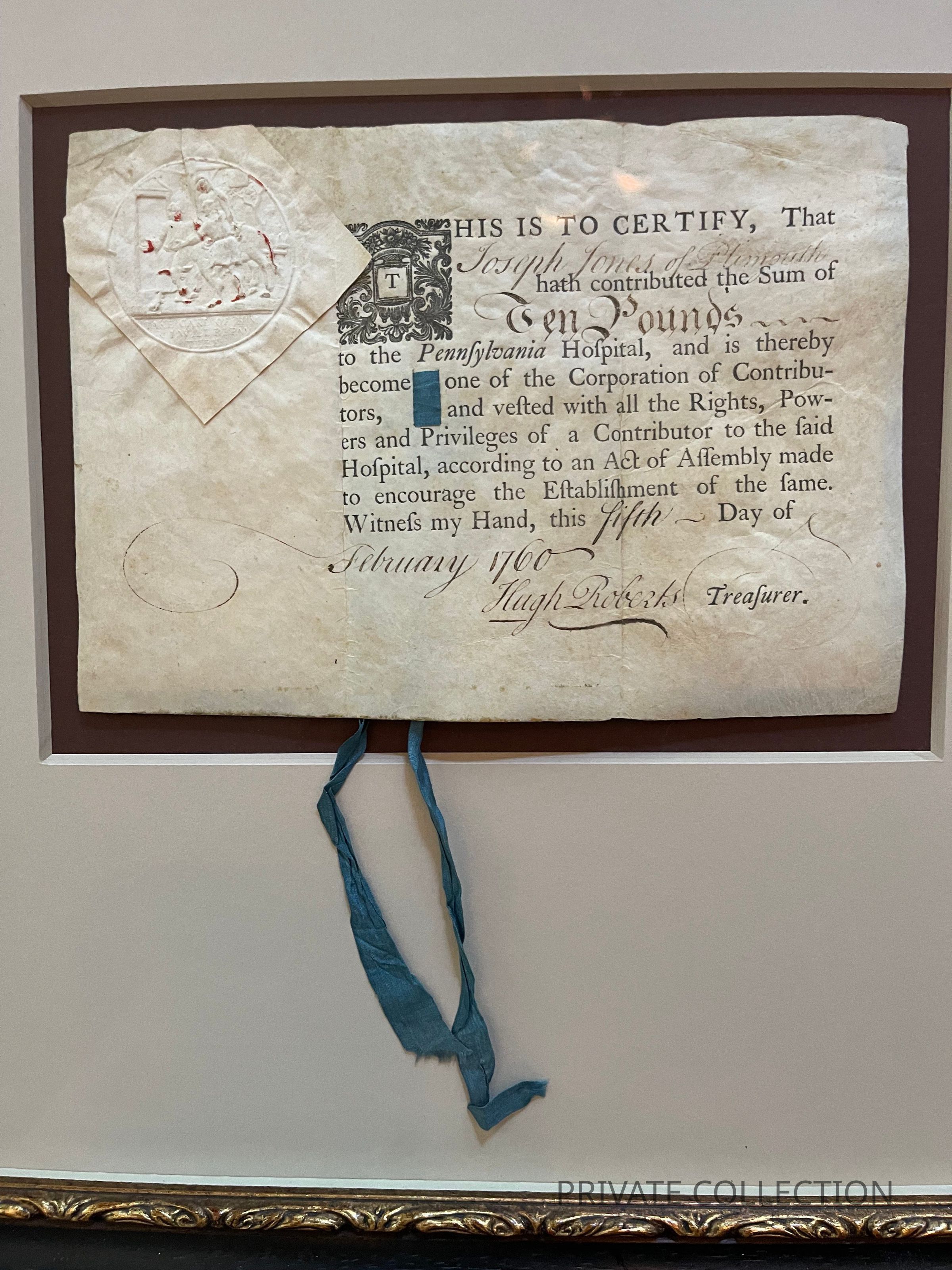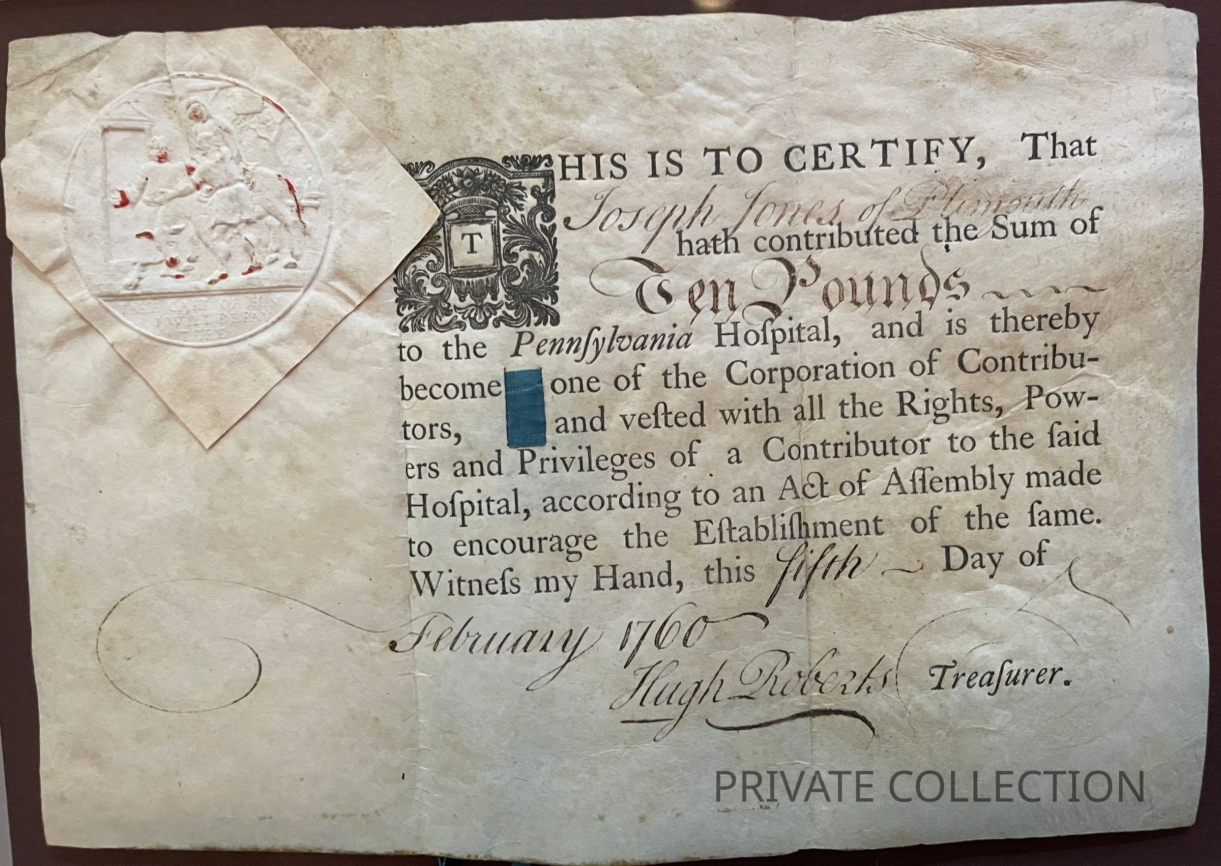 Contributor certificate issues to Joseph Jones [Phila: Franklin and Hall, 1754?]. Partially printed document with paper seal on vellum.