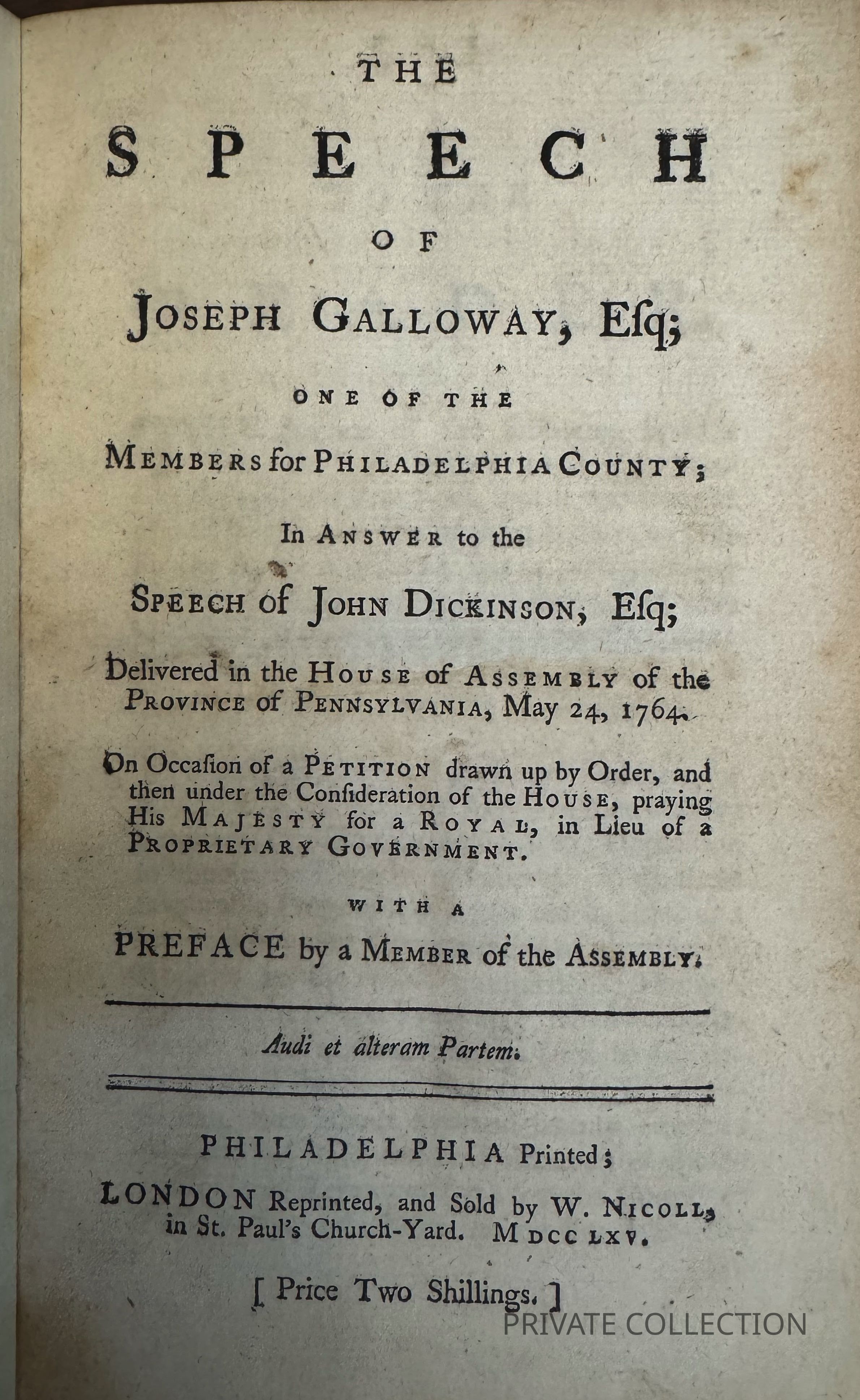 The first London edition of Joseph Galloway's speech in the Pennsylvania House of Assembly, printed the same year as the first Philadelphia edition. (Although the title page is dated 1765 in roman numerals, Adams indicates a 1764 printing in his AMERICAN CONTROVERSY.) Galloway was one of the leaders of the Pennsylvania Assembly, and a close ally at Benjamin Franklin. Through this speech and other measures he won the support of that representative body for a petition to King George Ill pleading that the proprietary governors of Pennsylvania be replaced by direct royal government. Galloway would eventually become the most prominent American Loyalist during the Revolution. John Dickinson, whose speech prompted this response from Galloway, later wrote LETTERS FROM A FARMER IN PENNSYLVANIA, the most important document of the Stamp Act crisis. The 'Preface' on pp. 3-43 was written by Franklin, and is a very bitter attack on the Penns and their supporters.Other Names and Numbers