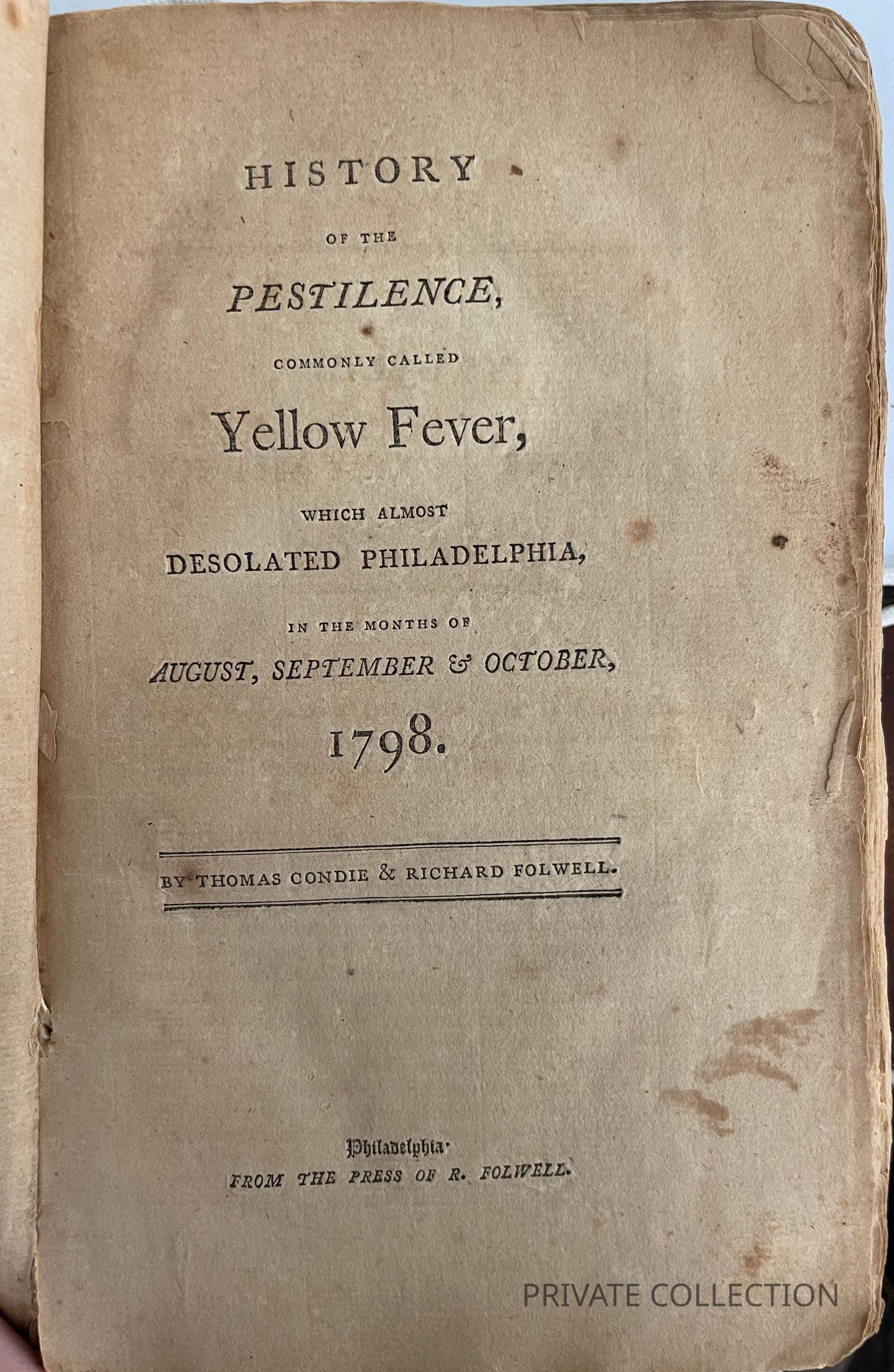 Condie, Thomas, 1775?-1814. and Richard Folwell History of the pestilence, commonly called yellow fever, which almost desolated Philadelphia, in the months of August, September & October, 1798... Philadelphia: From the press of R. Folwell. [1799] 108, xxxi, [68] p.; 21 cm. (8vo) A readable (though somewhat fragmented) history of the Philadelphia epidemic of 1798, which the authors generously supplement with documents issued by the Board of Health, statements issued by the College of Physicians (#s 116-117) and Academy of Medicine (#3), newspaper articles, correspondence, etc. Throughout, the authors have tried to present a balanced view of the controversy between the proponents of contagion and non-contagion, importation and domestic origin. The final sixty-eight unnumbered pages contain a list of the dead (3,521 names).Other Names and Numbers