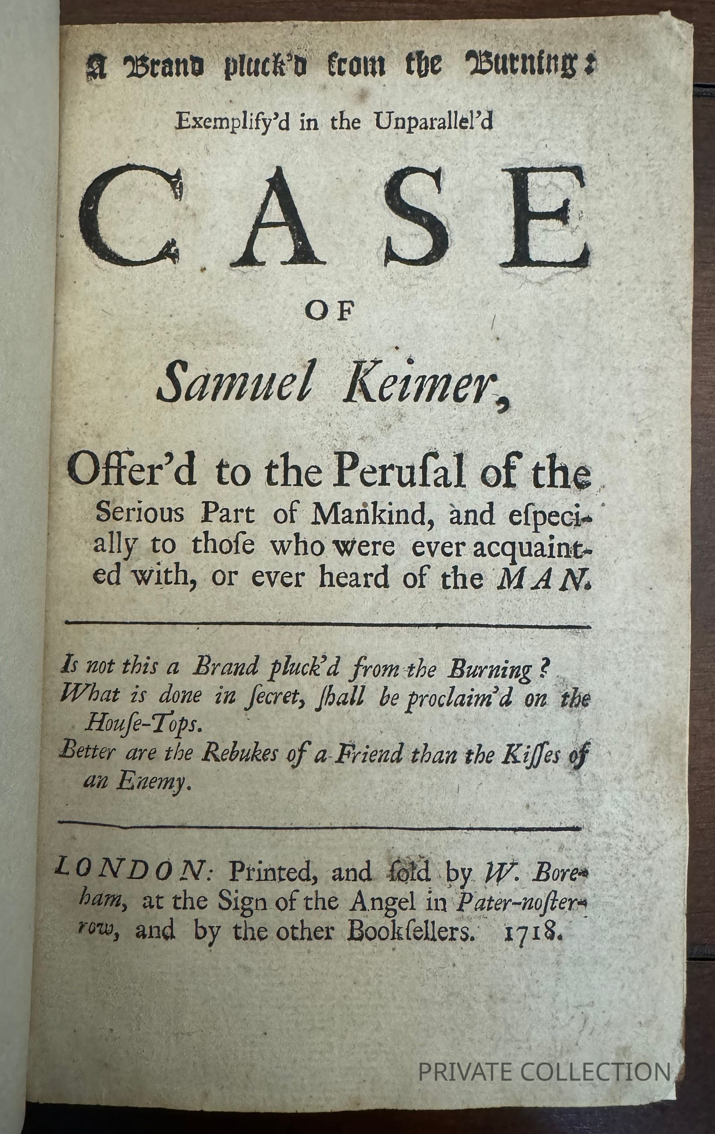 KEIMER, Samuel. A Brand Pluck'd from the Burning: Exemplify'd in the Unparallel'd Case of Samuel Keimer, Offer'd to the Perusal of the Serious Part of Mankind, and Especially to Those Who Were Ever Acquainted with, or Ever Heard of the Man.