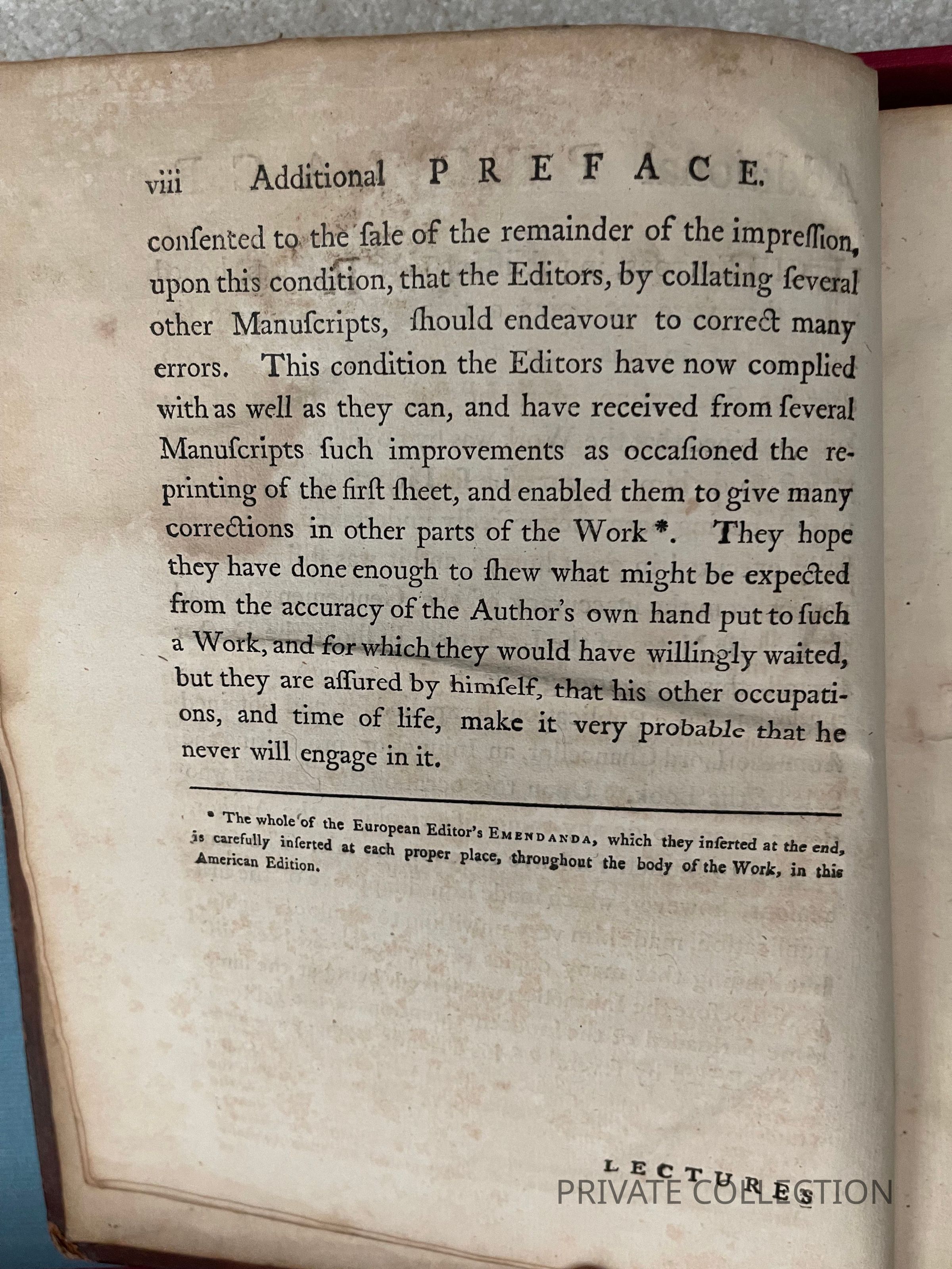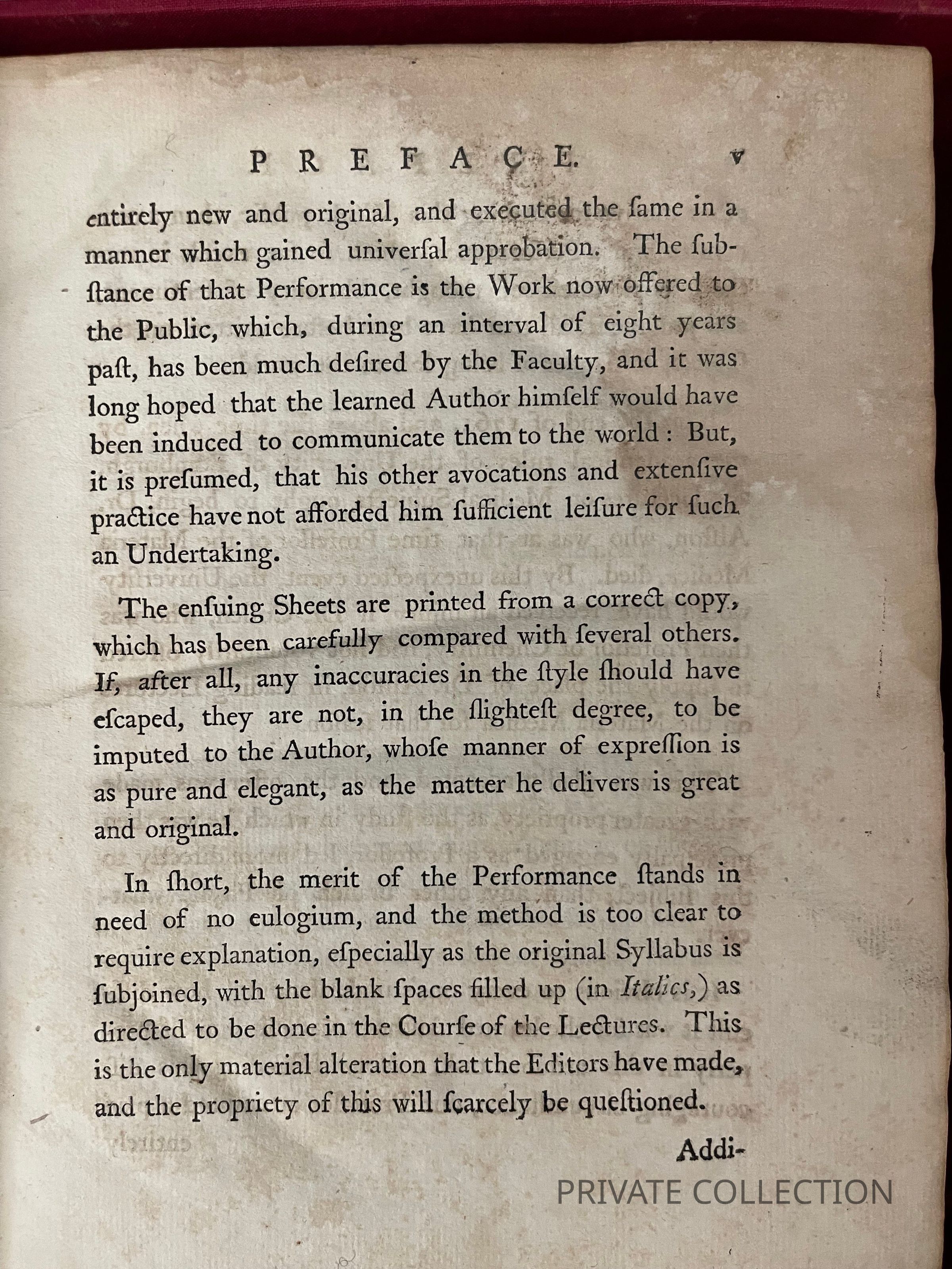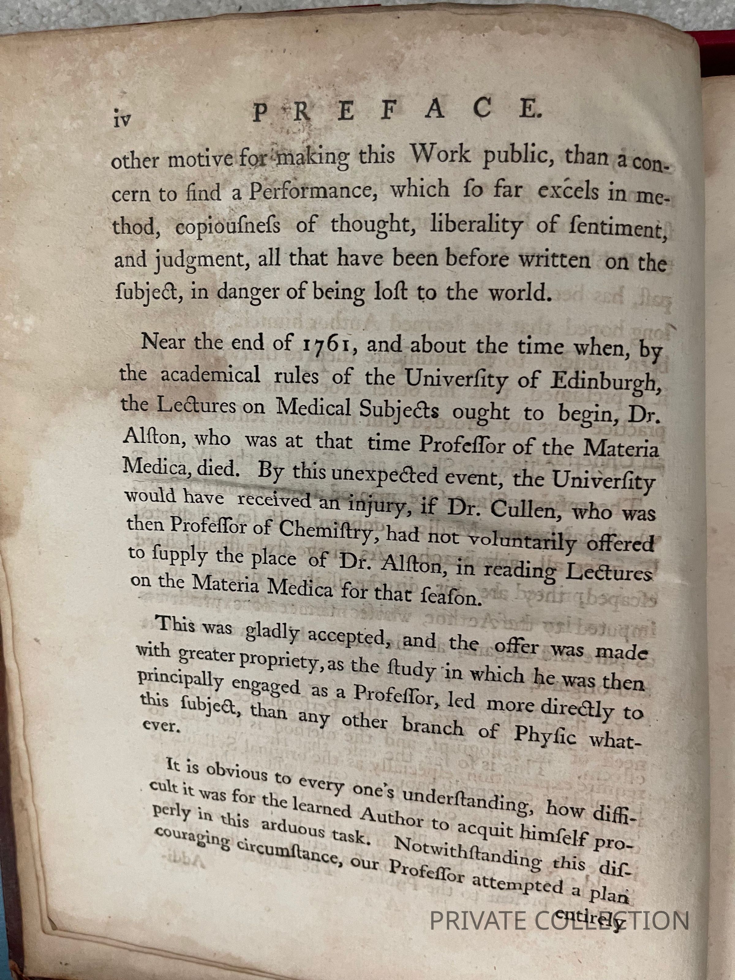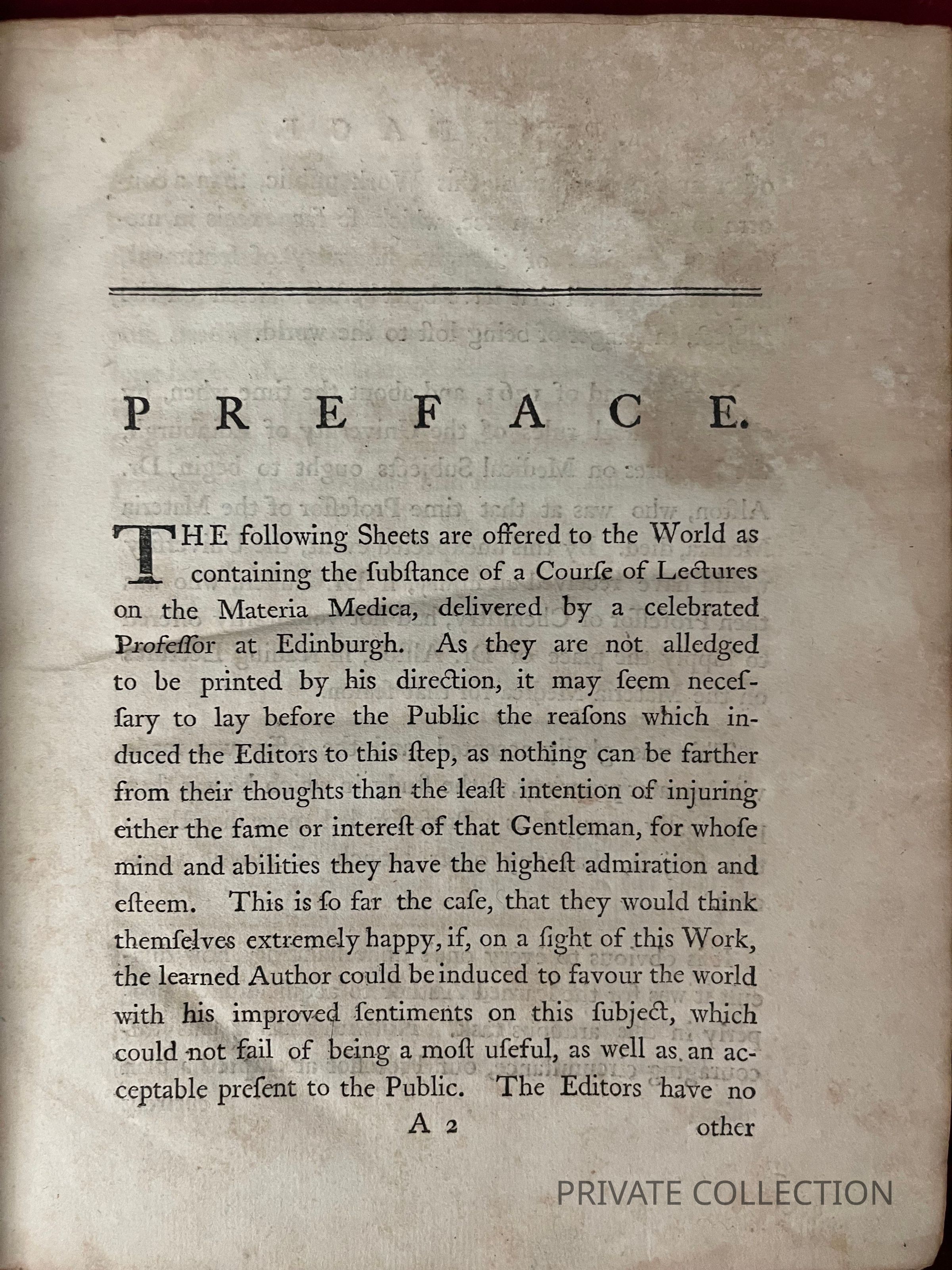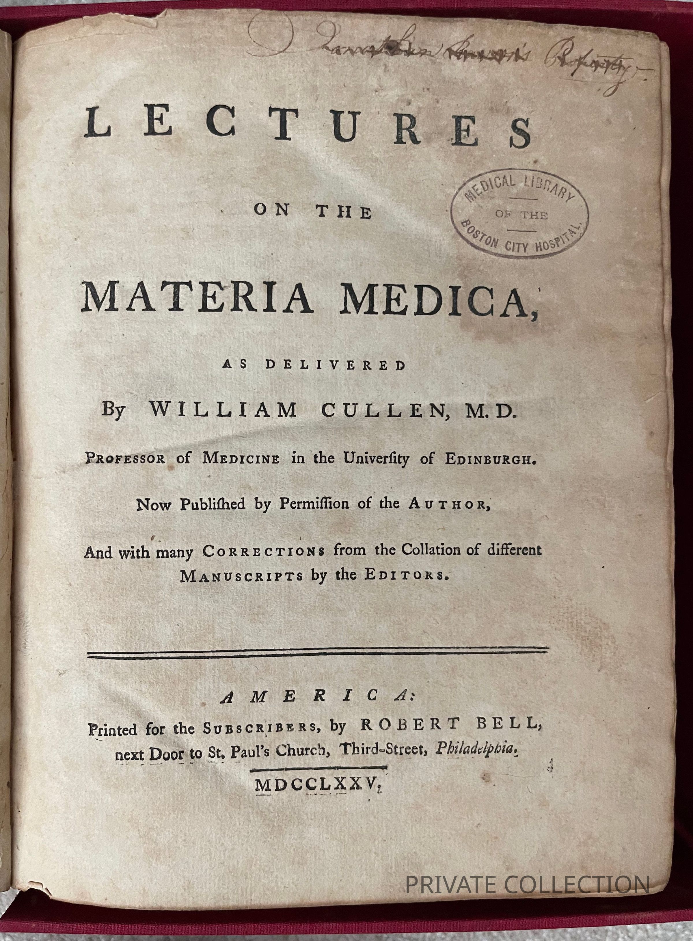 CULLEN, William. Lectures on the Materia Medica...Now Published by Permission of the Author, and with many Corrections from the Collation of Different Manuscripts by the Editors. Phila.: Robert Bell, 1775. viii,512pp. 4to. NAIP w013399. Evans 14000. Austin 577. Hildeburn 3188. Guerra A567. DNB V, pp. 279-82.