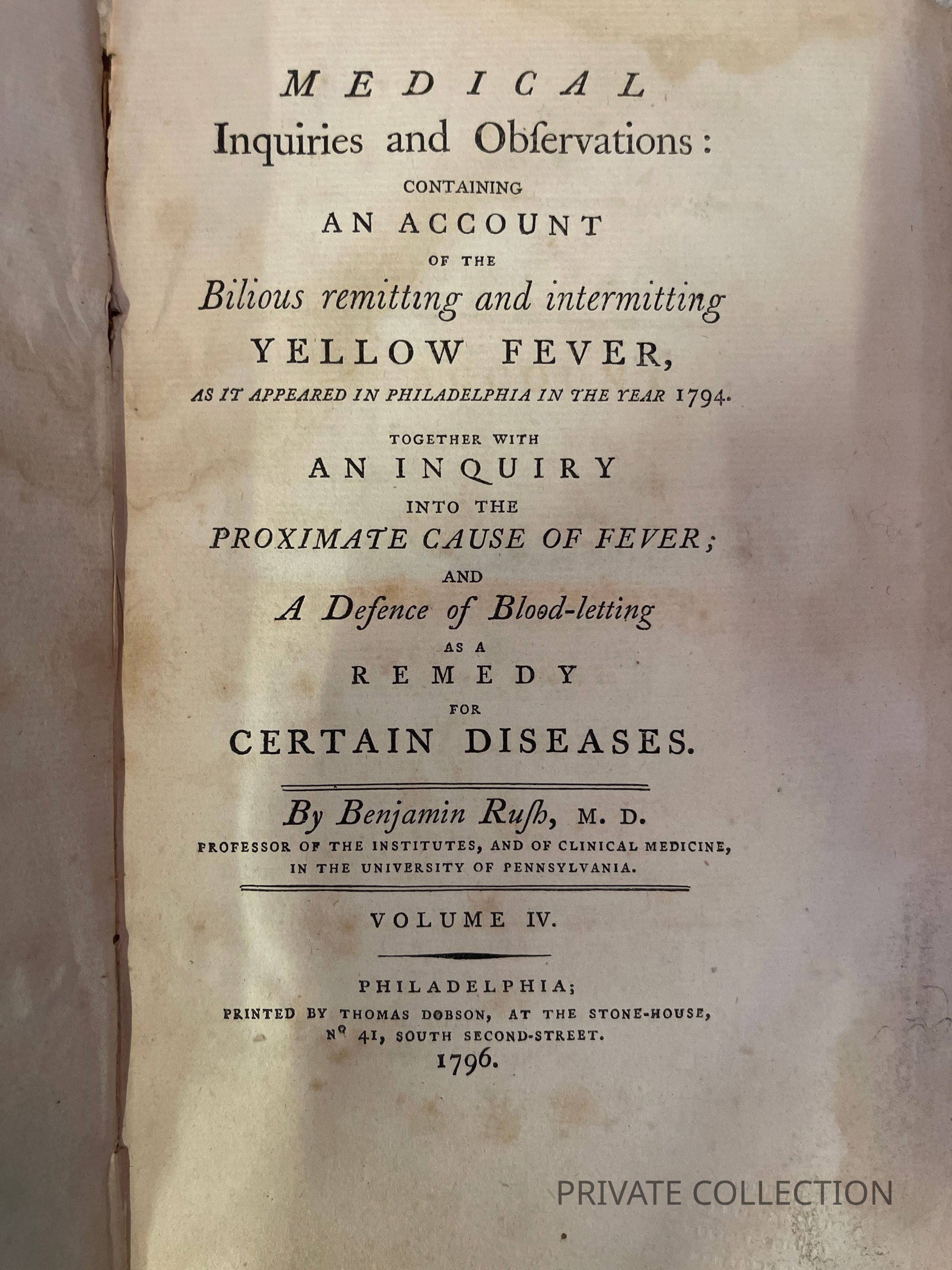 [with] Medical Inquiries and Observations: Containing an Account of the Bilious Remitting and Intermitting Yellow Fever, as It Appeared in Philadelphia in the Year 1794. Together with an Inquiry into the Proximate Cause of Fever; and a Defence of Bloodletting as a Remedy for Certain Diseases ... Volume IV. Phila.: Printed by Thomas Dobson, 1796. 1st ed. vii,[1] [viii]-ix,258pp.