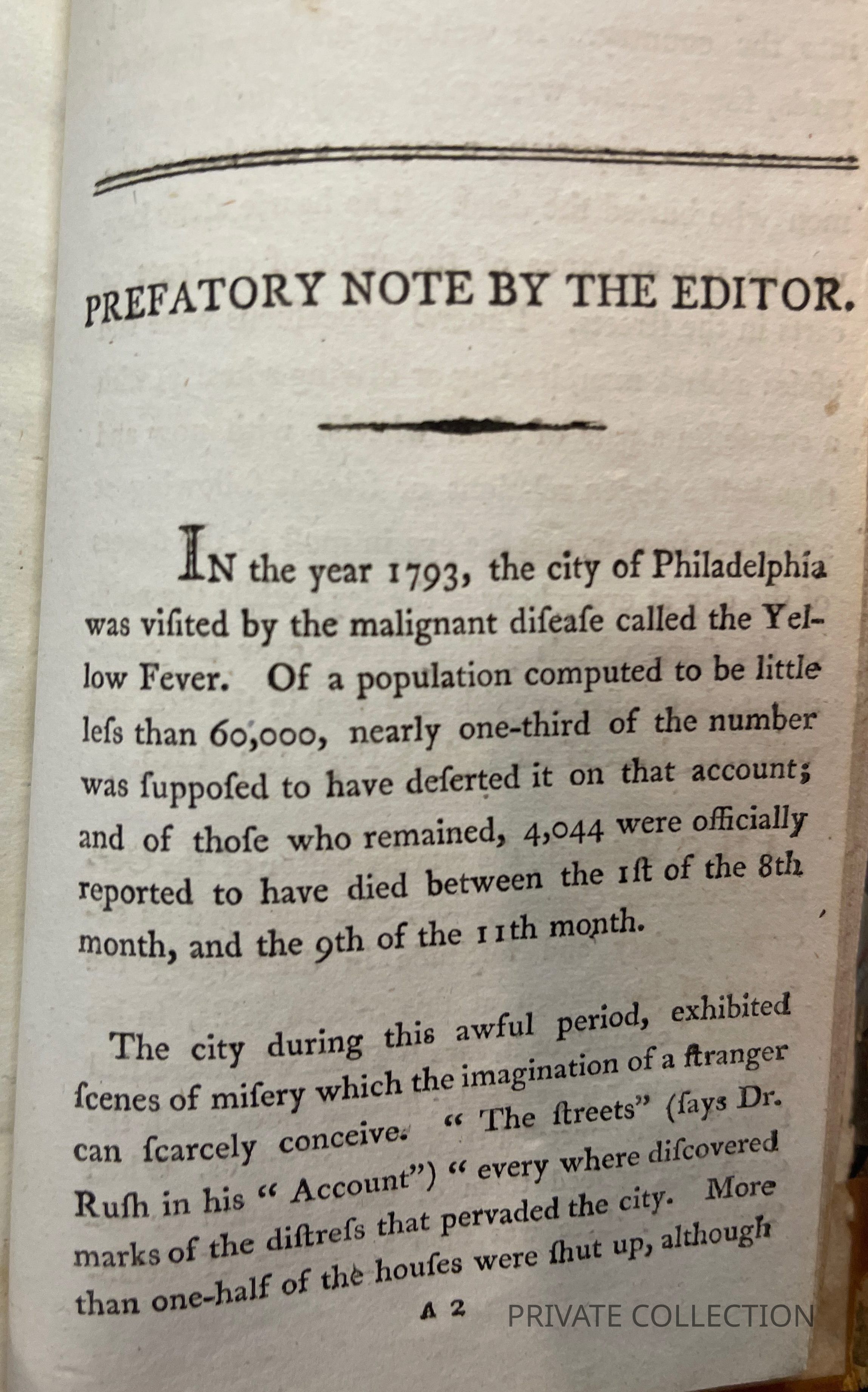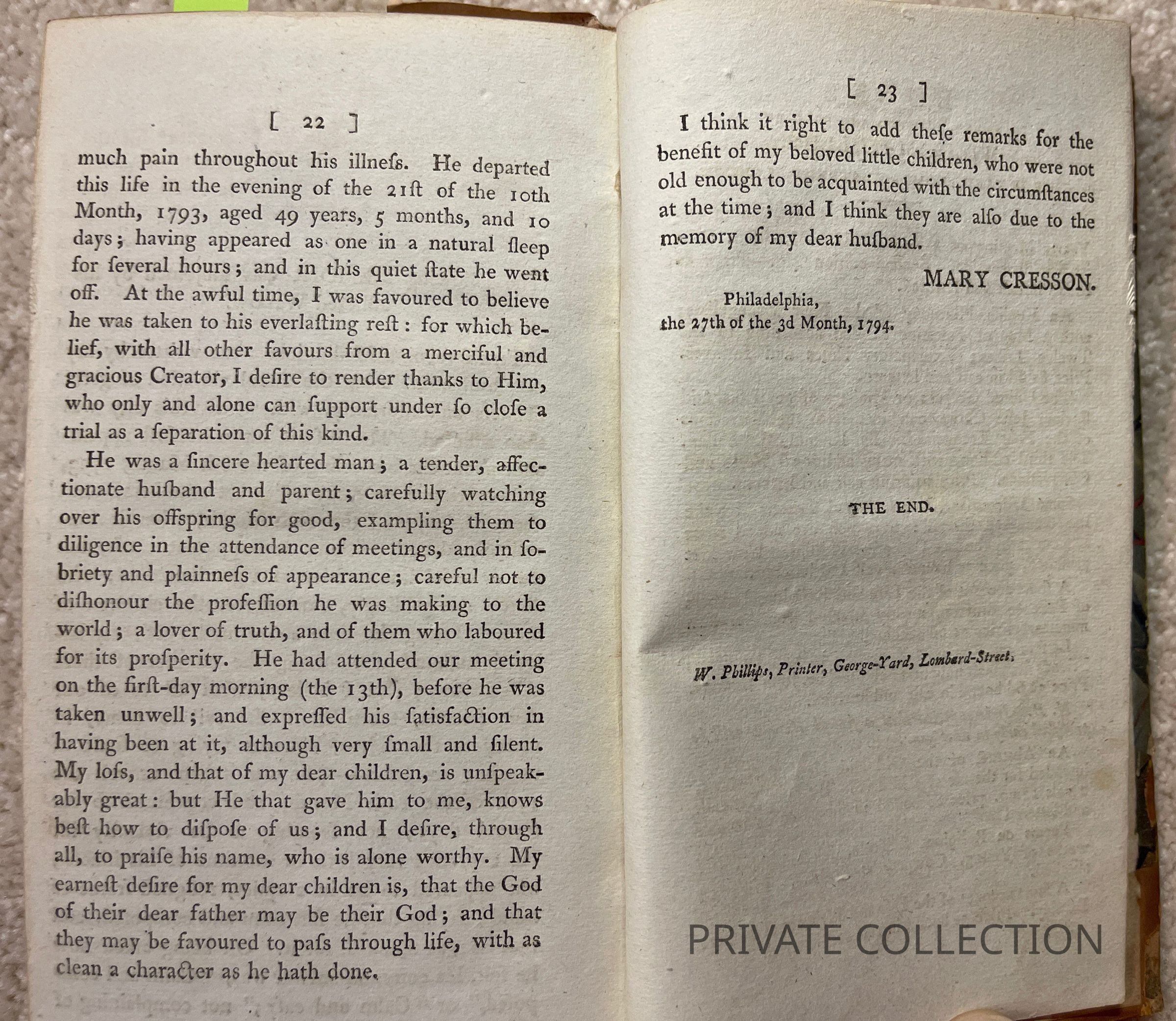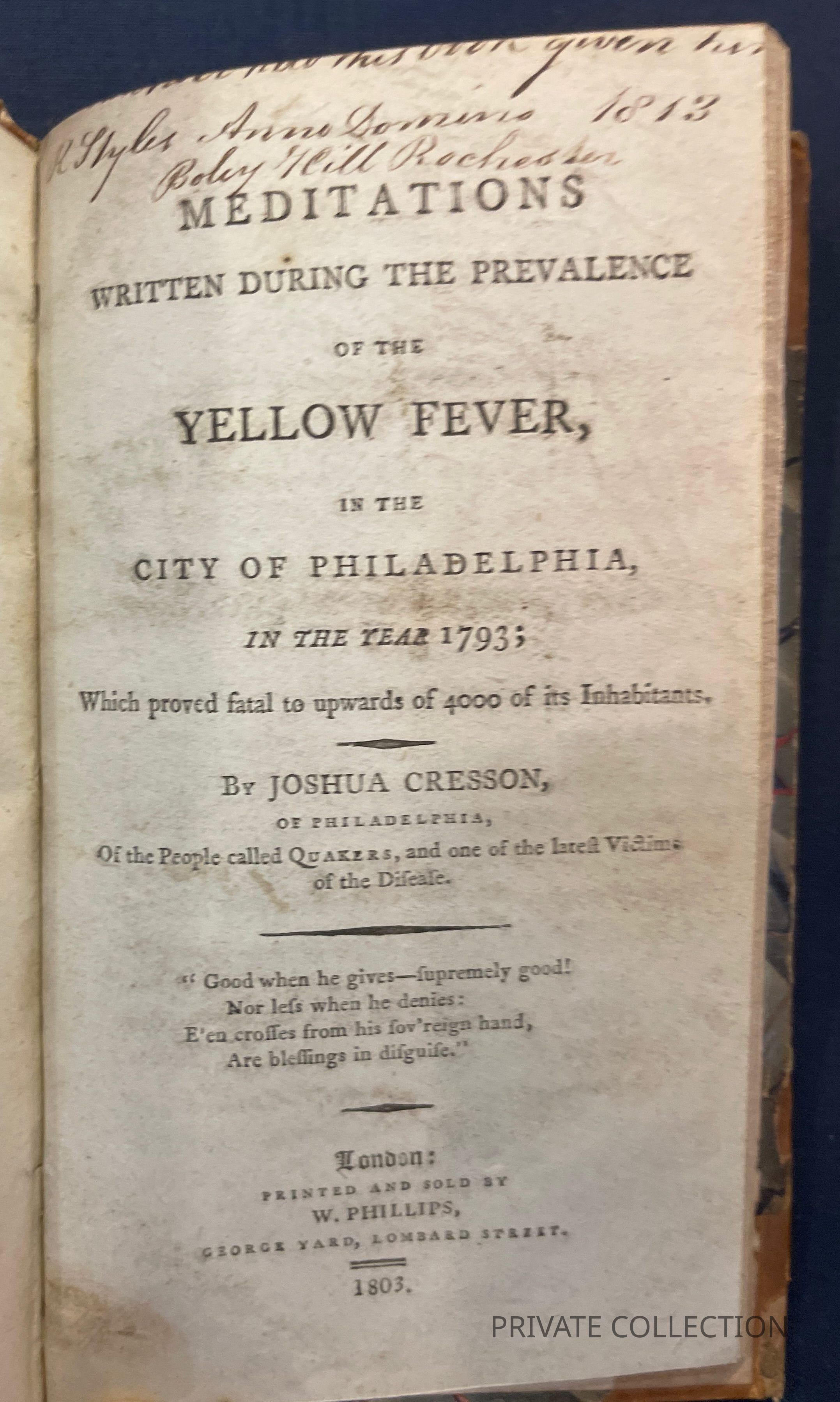 Cresson, a Philadelphia Quaker, died of yellow fever on 21 October, 1793. His meditations on the epidemic, written during the month prior to his illness, were acquired and edited for publication by William Dillwyn (cf Sabin 17484). A memoir by Cresson's widow is included. (Miner)Other Names and Numbers