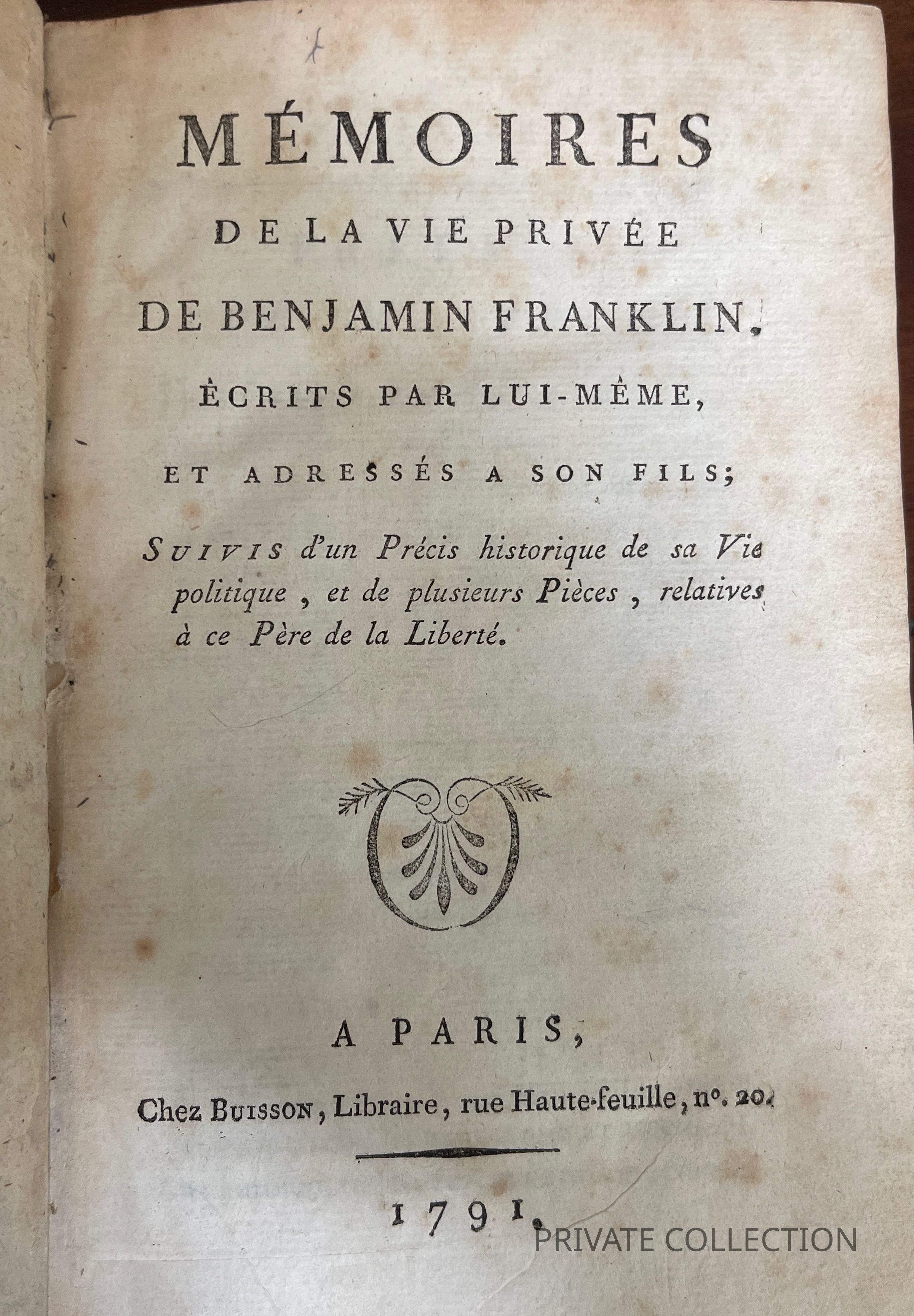 Memoires de la Vie Privee de Benjamin Franklin, Ecrits par Lui-Meme at Adresses a Son FilsDescription