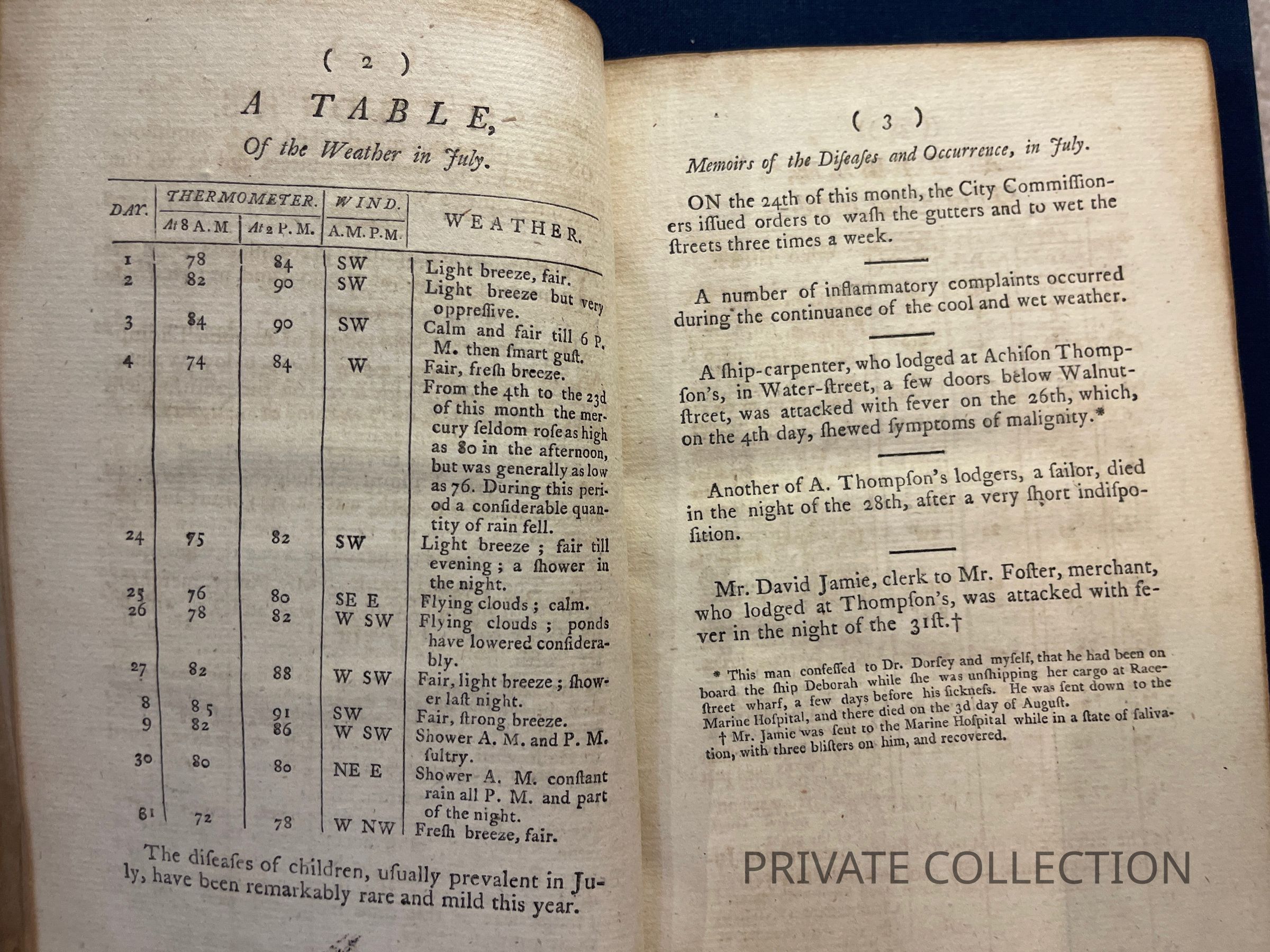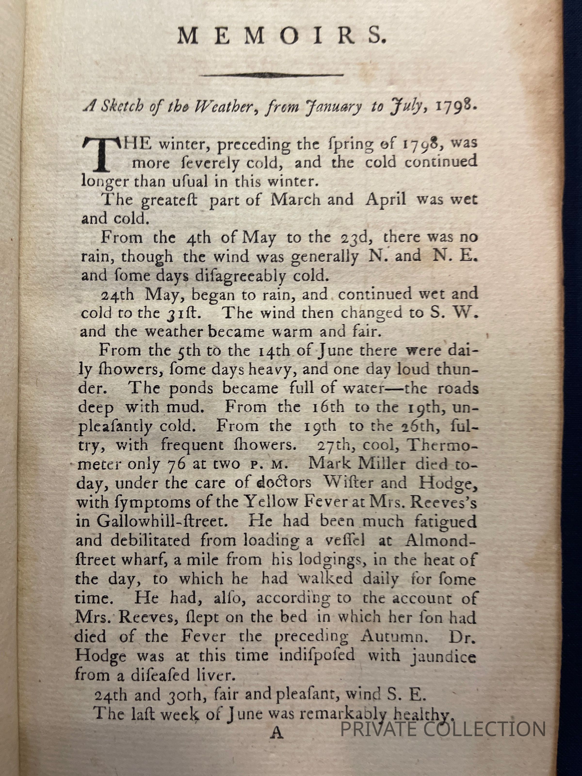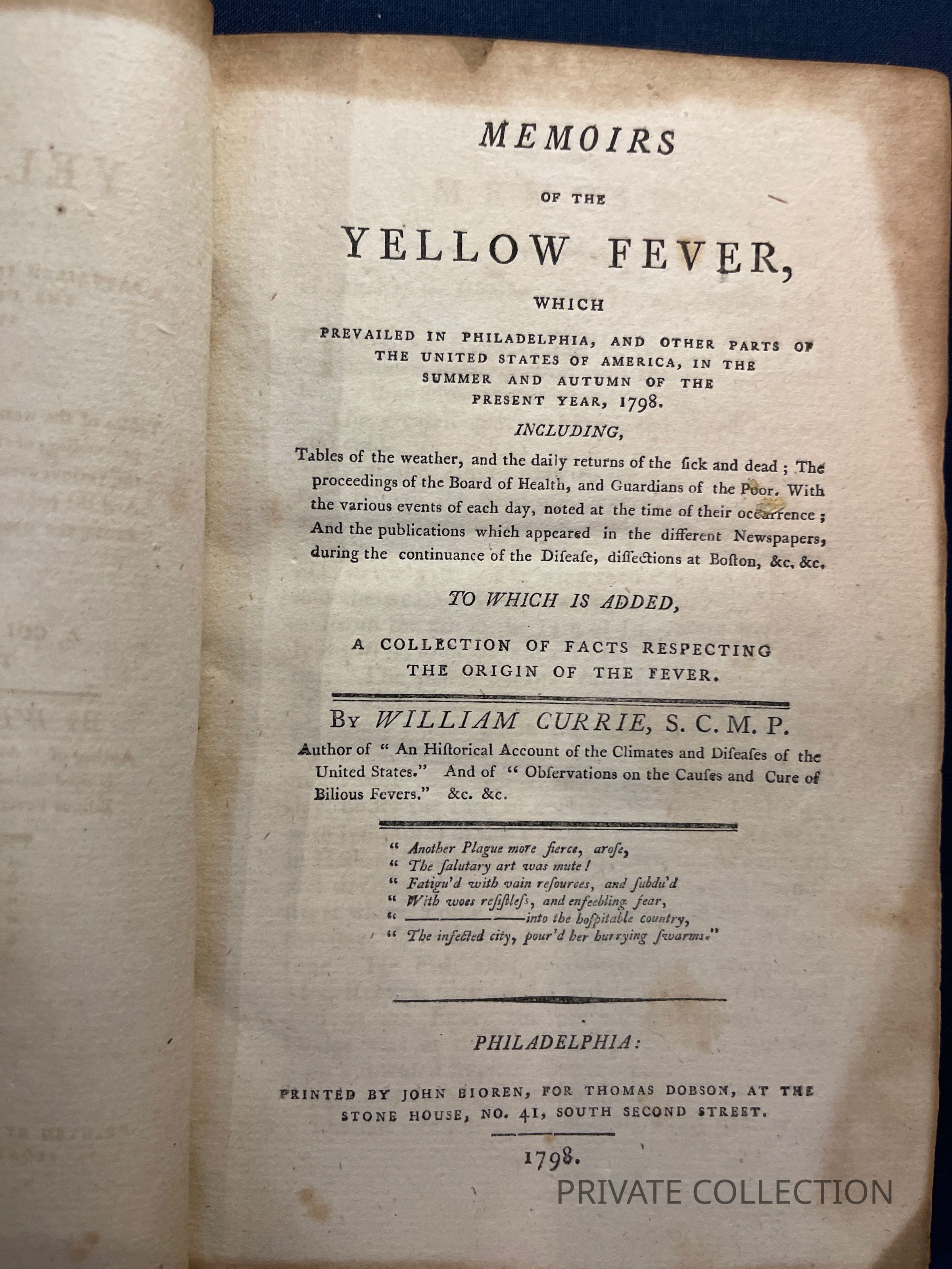 Currie, William, 1754-1828. Memoirs of the yellow fever, which prevailed in Philadelphia, and other parts of the United States of America, in the summer and autumn of the present year, 1798. Including, tables of the weather, and the daily returns of the sick, and dead; the proceedings of the Board of Health, and Guardians of the Poor. With the various events of each day, noted at the time of their occurrence; and the publications which appeared in the different newspapers, during the continuance of the disease, dissections at Boston, &c. &c. To which is added, a collection of facts respecting the origin of the fever... Philadelphia: Printed by John Bioren, for Thomas Dobson... 1798. [2], 145 p.; 21 cm. (8vo) Described by Bartlett as "a kind of desultory diary of the yellow-fever visitation of 1798" (#37, p. 570), the Memoirs provides a daily chronology of the epidemic drawn from Curries own recollections and a variety of published and manuscript sources.