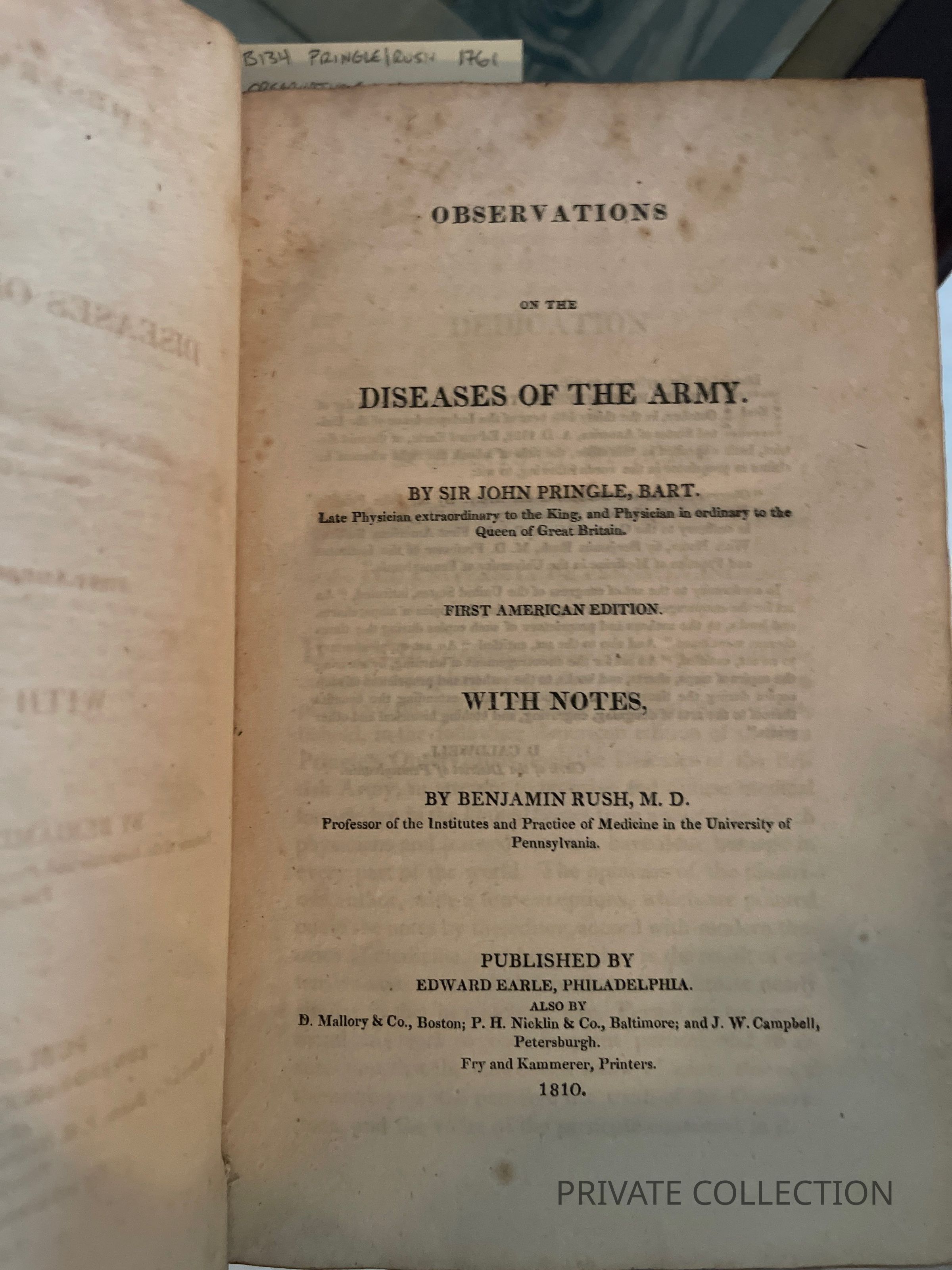 PRINGLE, John. Observations on the Diseases of the Army. First American Edition, with notes by Benjamin Rush MD. Professor of the Institutes and Practice of Medicine in the University of Pennsylvania.Other Names and Numbers