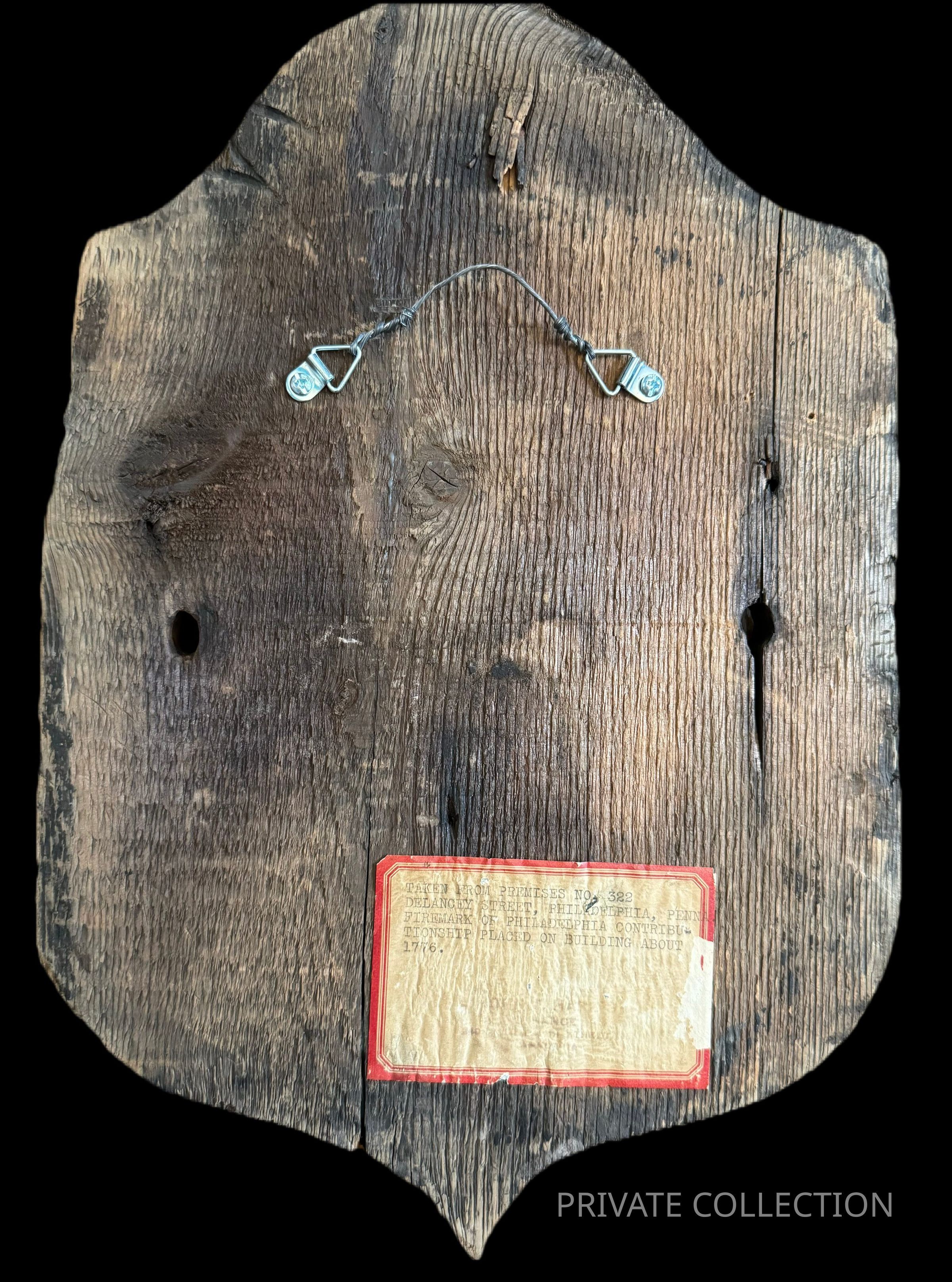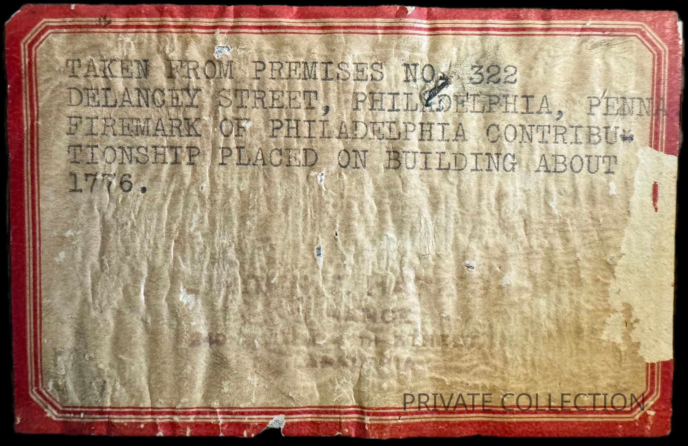 Per the National Museum of American History: The Philadelphia Contributionship was established in 1752, becoming the first successful fire insurance company in America. Benjamin Franklin was one of its founding members. The Contributionship began as a mutual insurance company and this concept is represented by its “Hand in Hand” fire mark. The Philadelphia Contributionship is still in operation. The square board in their collection is only one of two known surviving marks from the original run of at least two hundred and fifty square boards. Subsequent marks were on shield-shaped boards, which dates this board after 1753. (https://americanhistory.si.edu/collections/nmah_1305964)Note Type