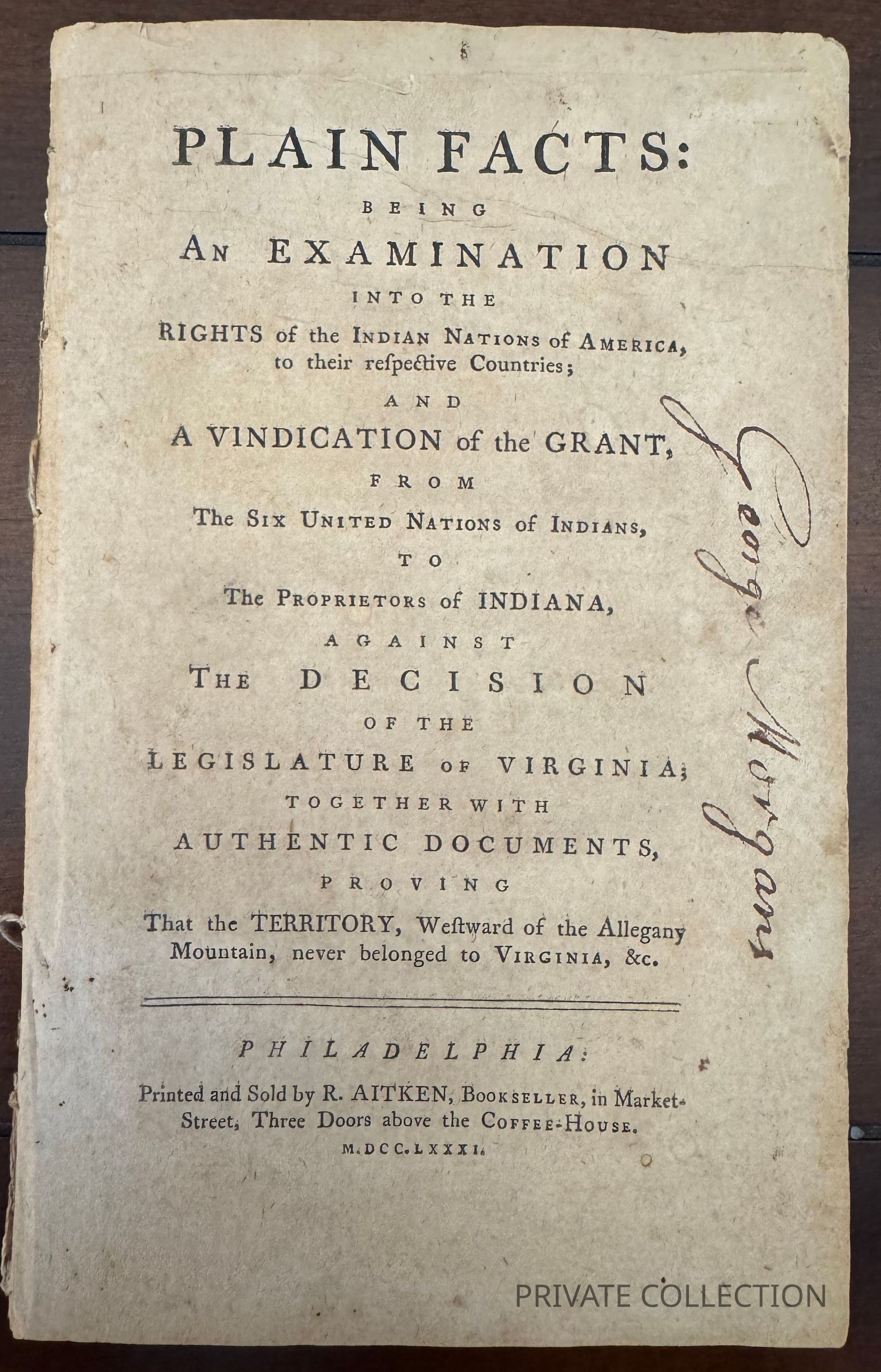 This pamphlet was issued by Wharton in 1781 to review the above facts and continue to present his case for their rights to the region. "The first twenty-five pages of this gem of frontier history are a remarkable summary of land claims in America" (Siebert).