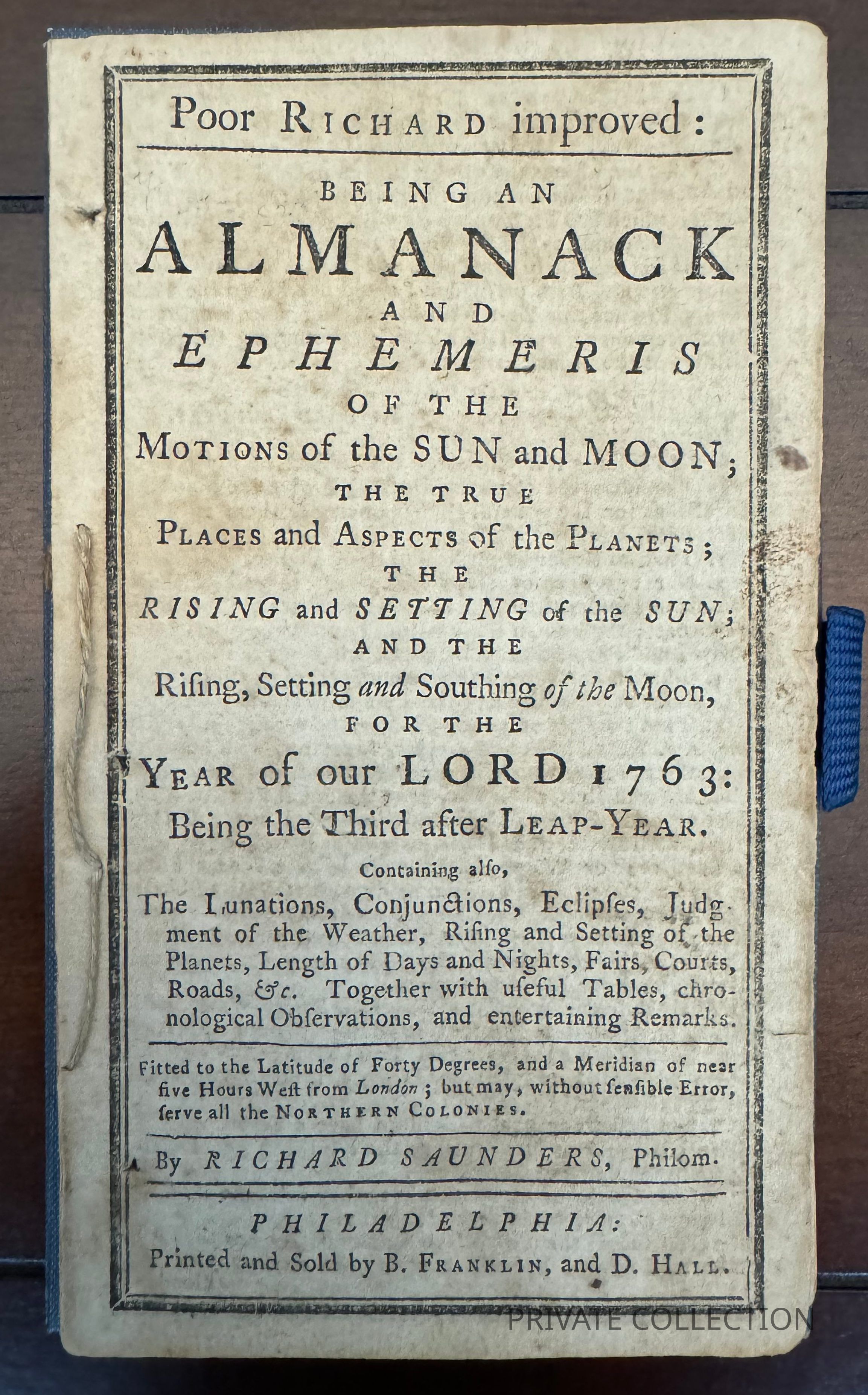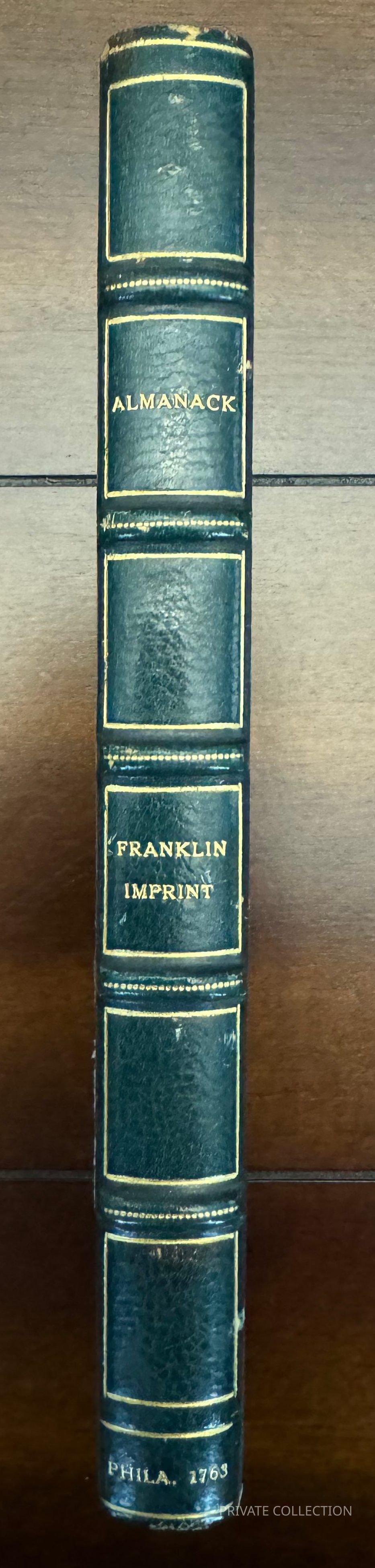 This example is housed in a custom blue canvas slipcase with matching chemise. It is in exceptional condition, with very little folding, foxing, soiling, or fading as otherwise seen in examples of almanacs. Original stitching intact and in excellent condition. Certainly one of the finest extant examples of Franklin's famous Almanac .Condition