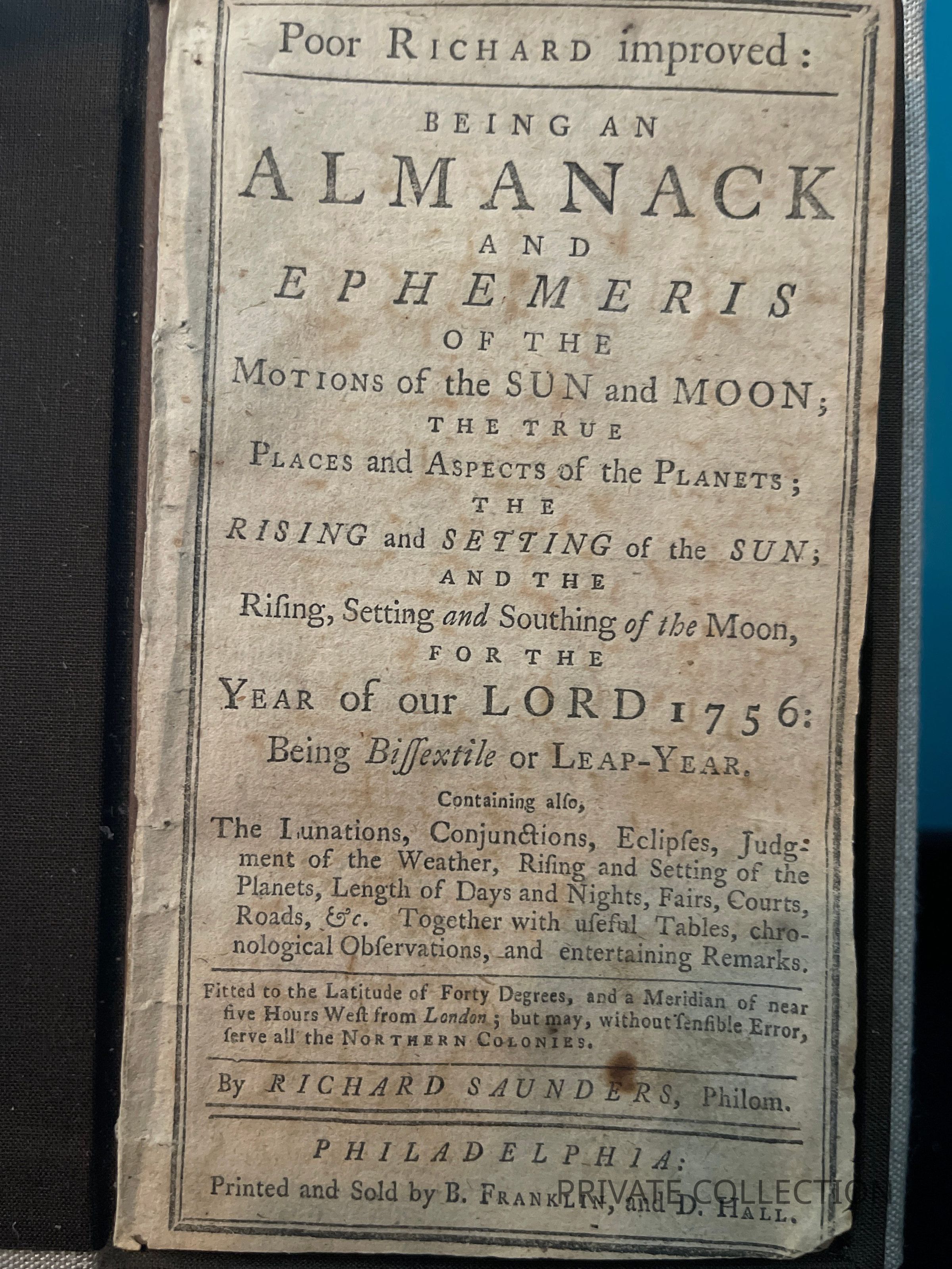 Poor Richard Improved: Being an Almanack and Ephemeris of the Motions of the Sun and Moon...For the Year of Our Lord 1756....By Richard Saunders. Phila.: Printed and Sold by B. Franklin, and D. Hall, [1755]. 18 leaves. Disbound. Several in text woodcut ornaments and vignettes.