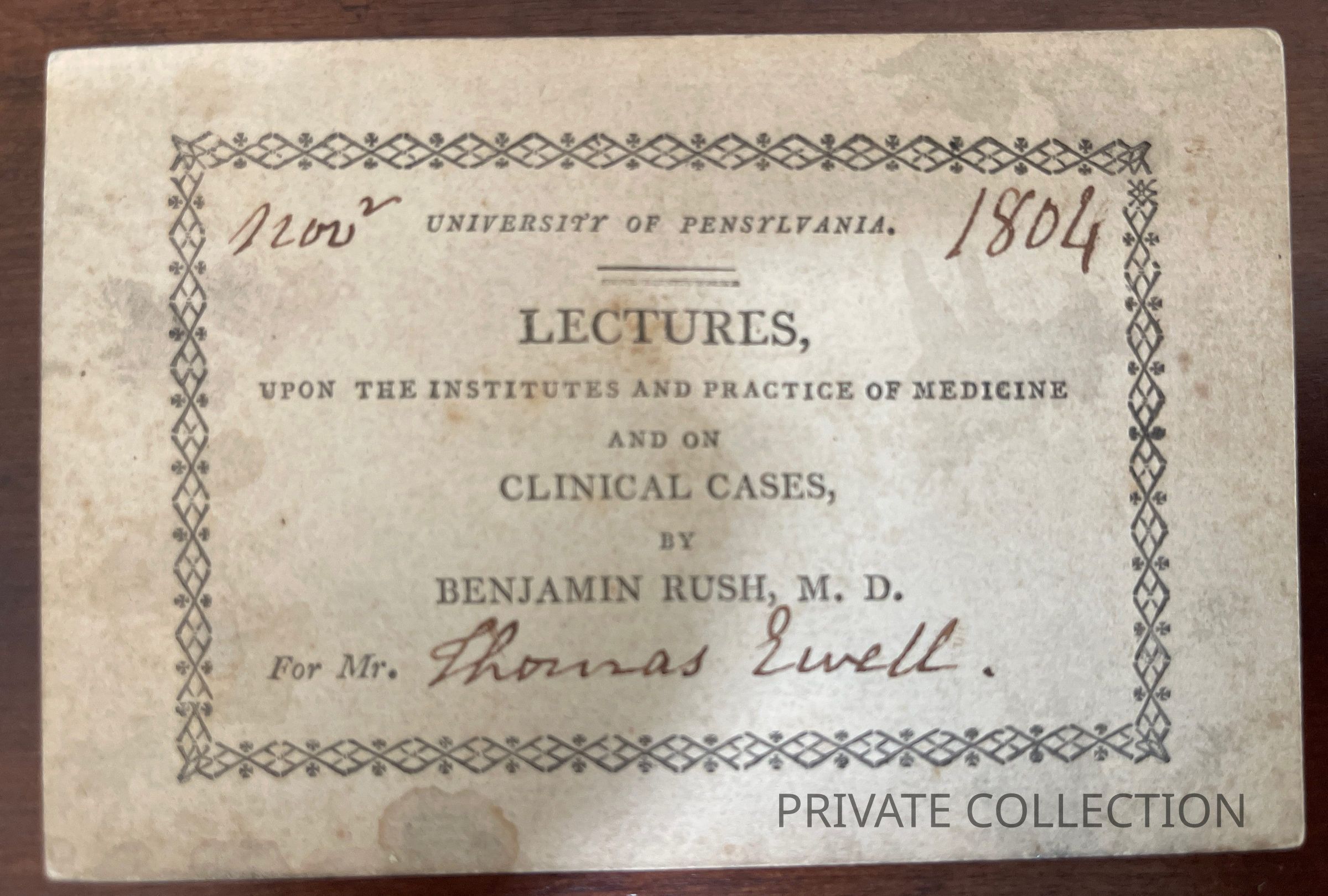 RARE LECTURE TICKET FOR BENJAMIN RUSH LECTURE UPON THE INSTITUTES AND PRACTICE OF MEDICINE AND ON CLINICAL CASES