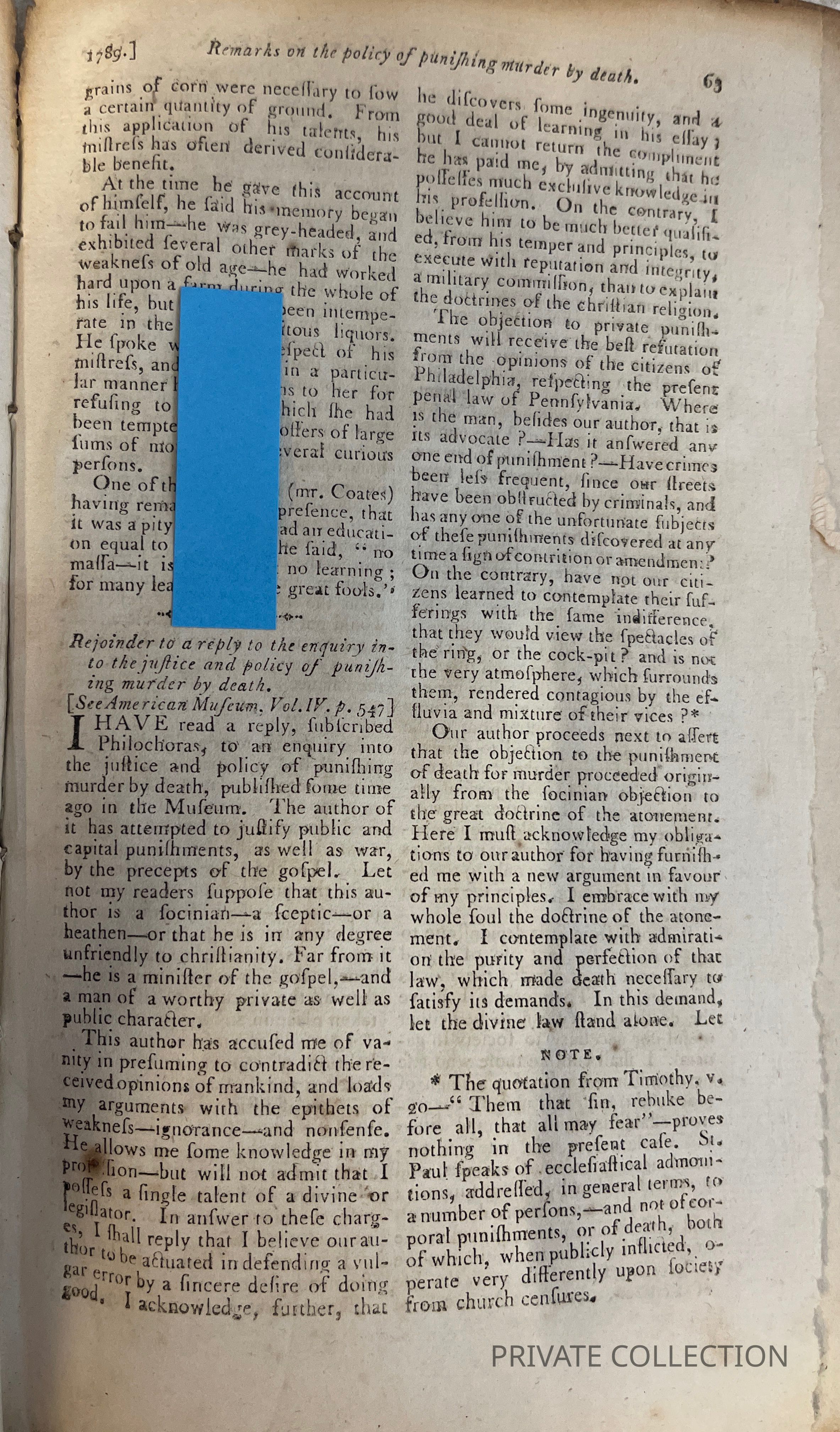 Accused of a dangerous rejection of Mosaic law, BR retorted that 'It becomes Christians to beware how far they condemn the popular virtue of humanity, because it is recommended by deists,' and goes on to cite the contributions of Voltaire, Beccaria, and others." (see also 1788-6)Other Names and Numbers
