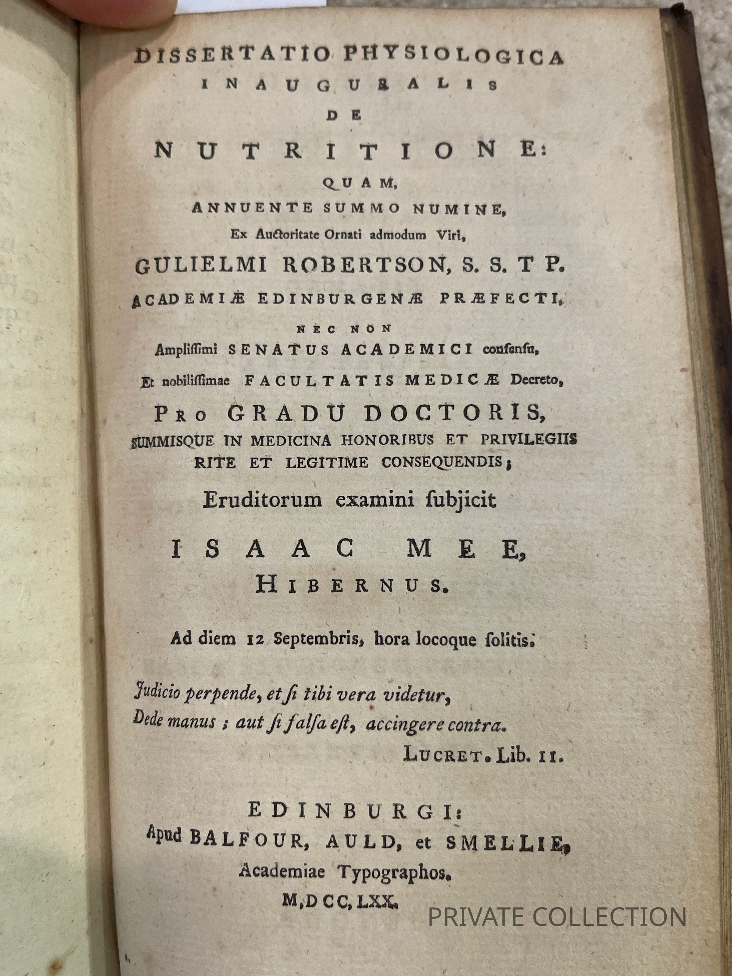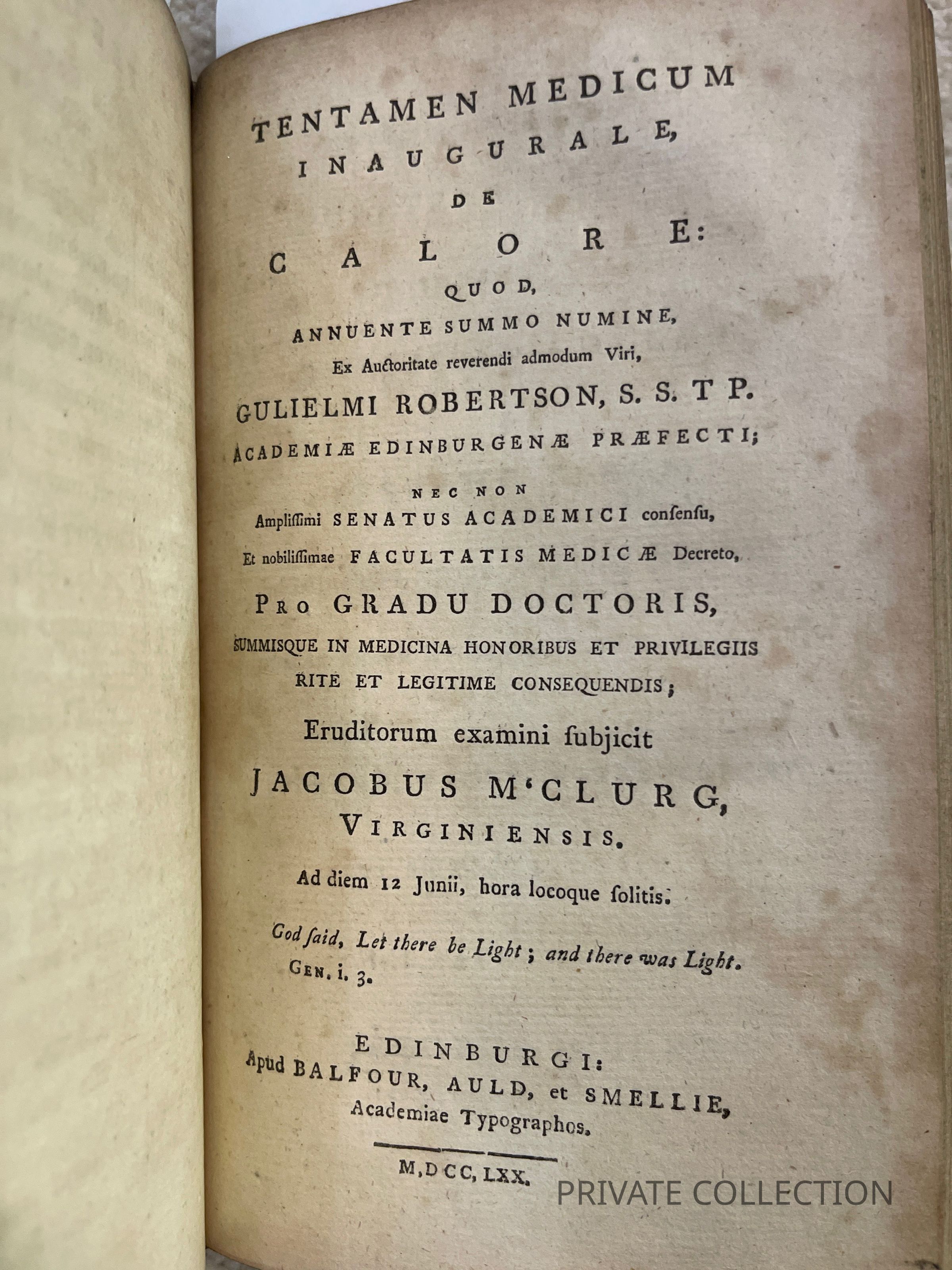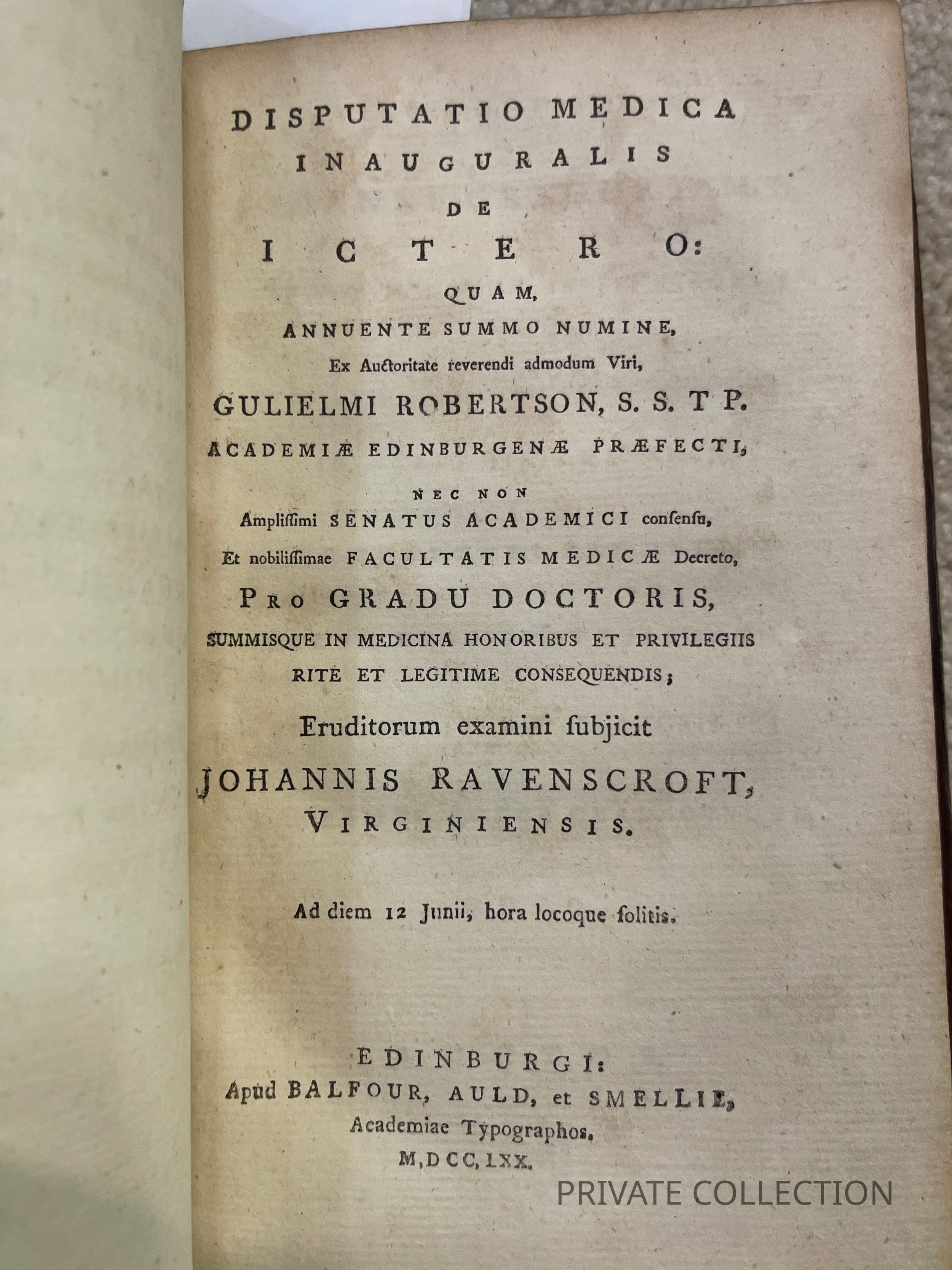 The sammelband was most likely put together by the University of Edinburgh for the graduating class of 1770. A very rare compilation of medical dissertations with important connections to the American Revolution.
