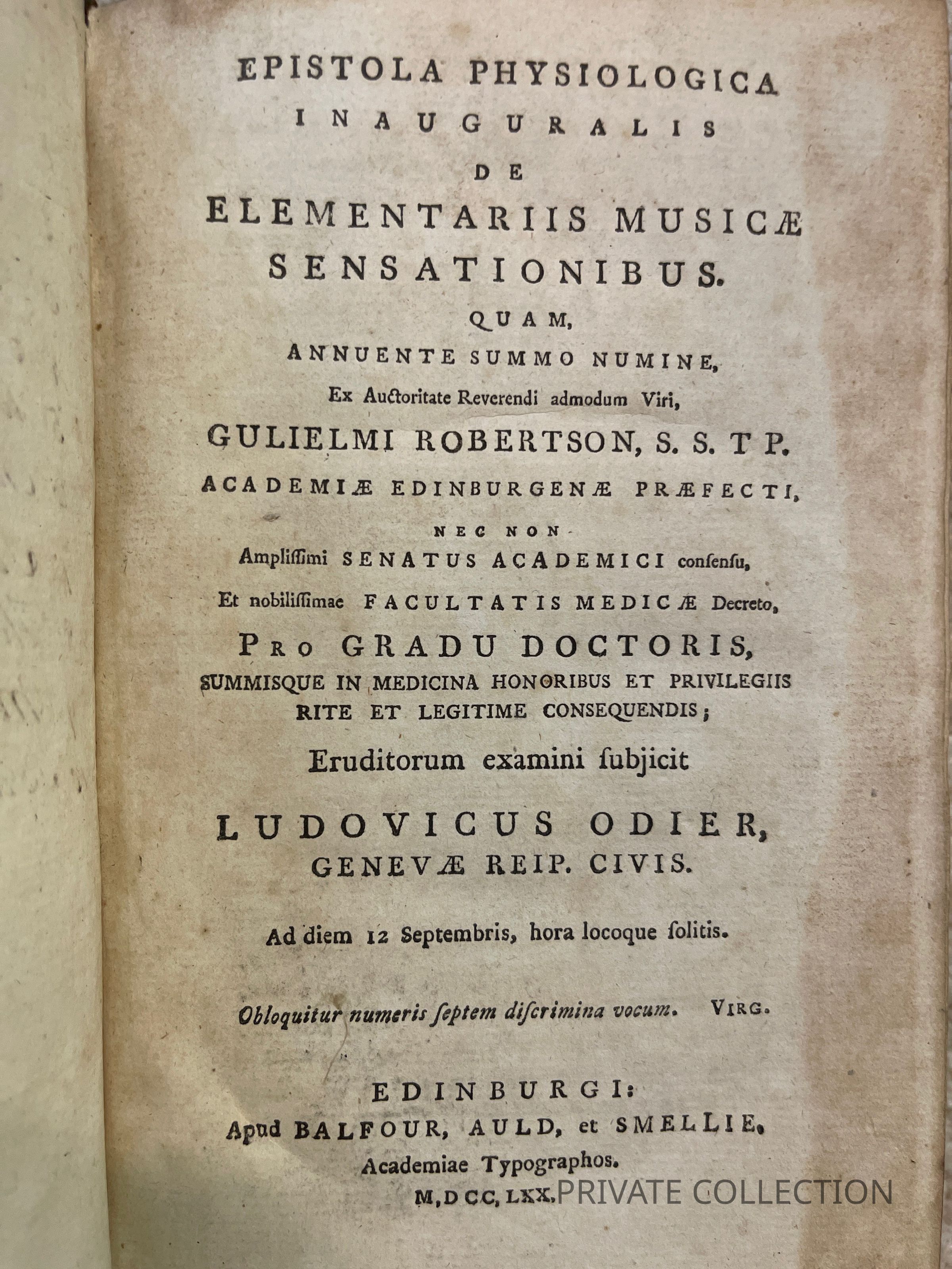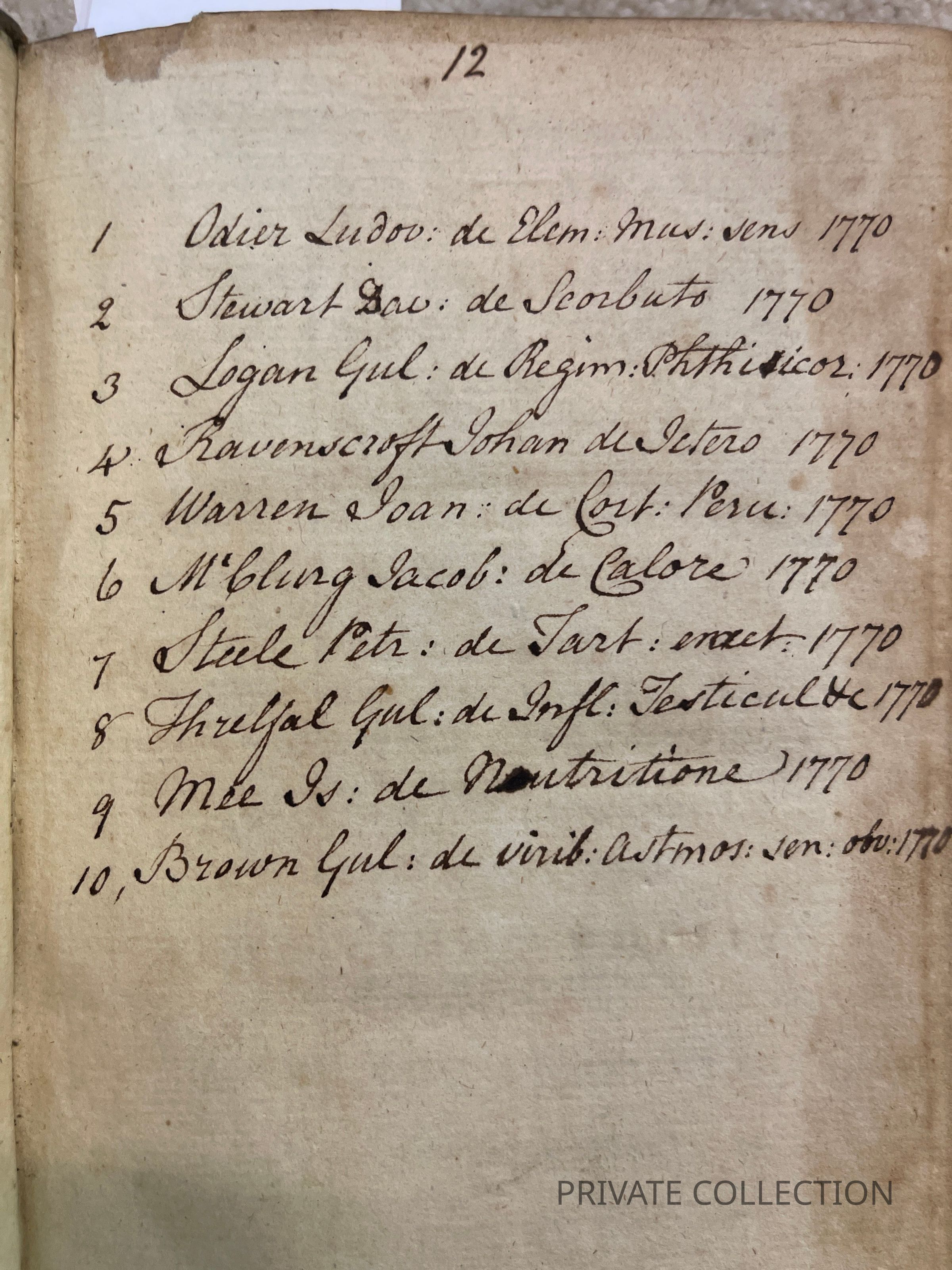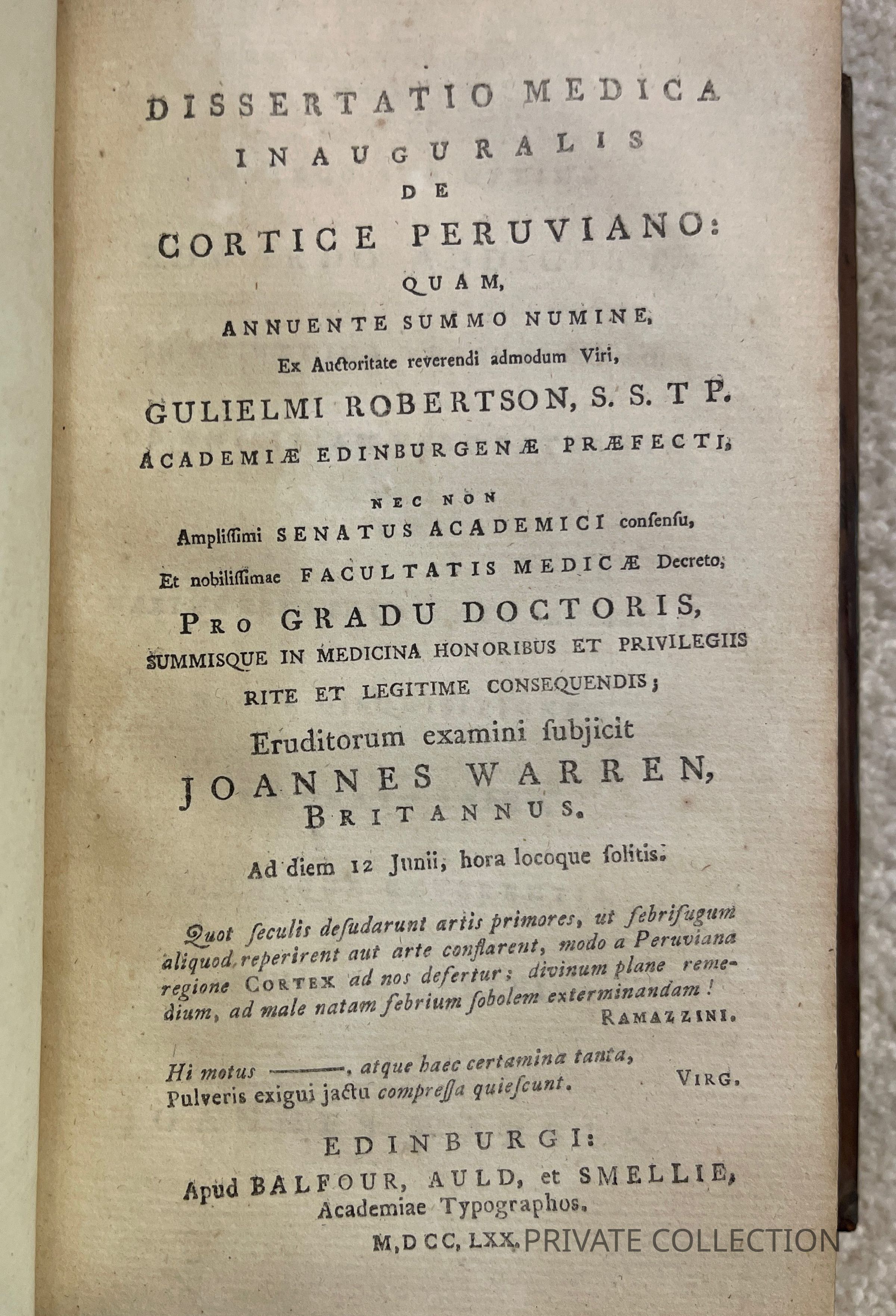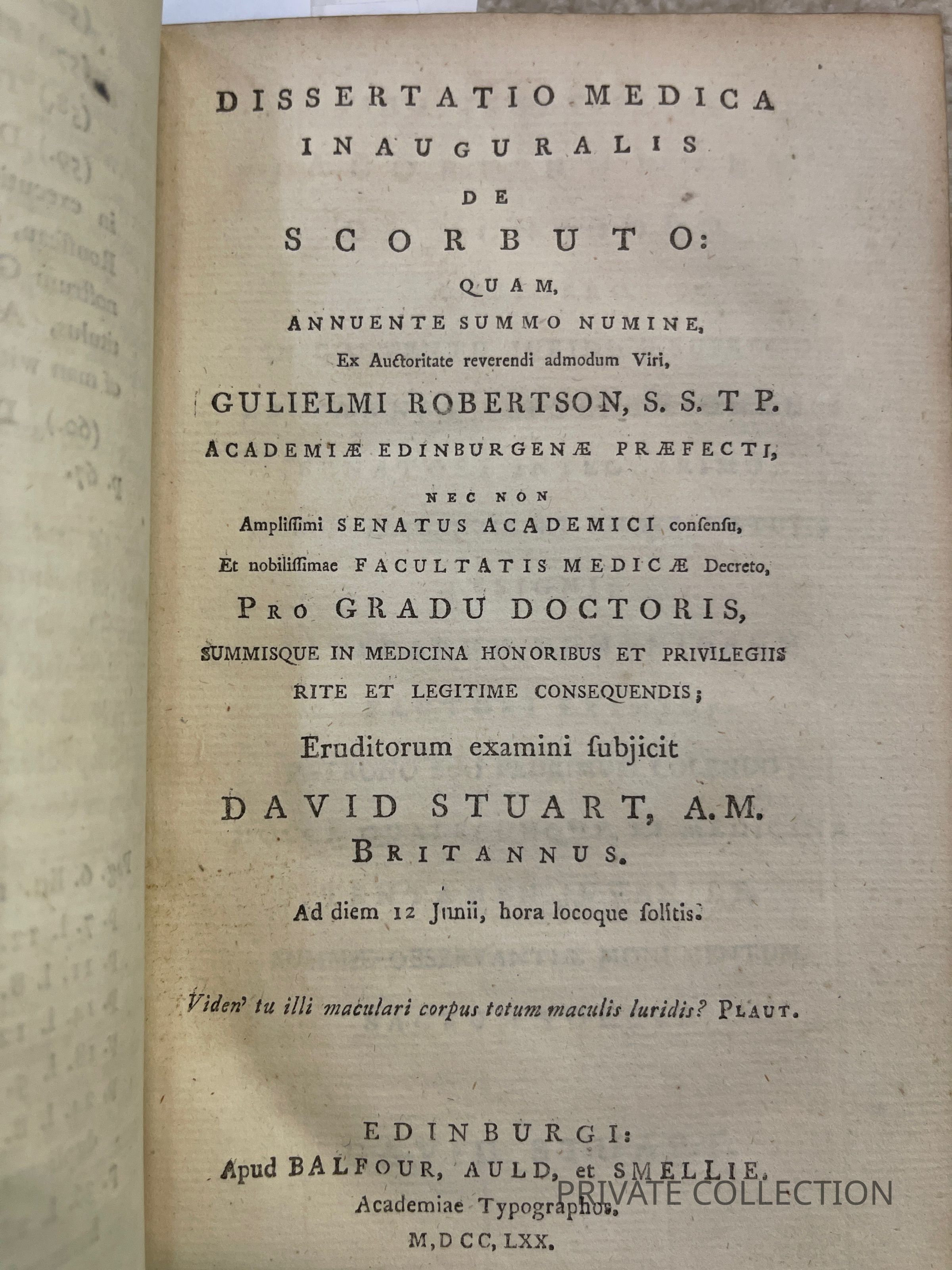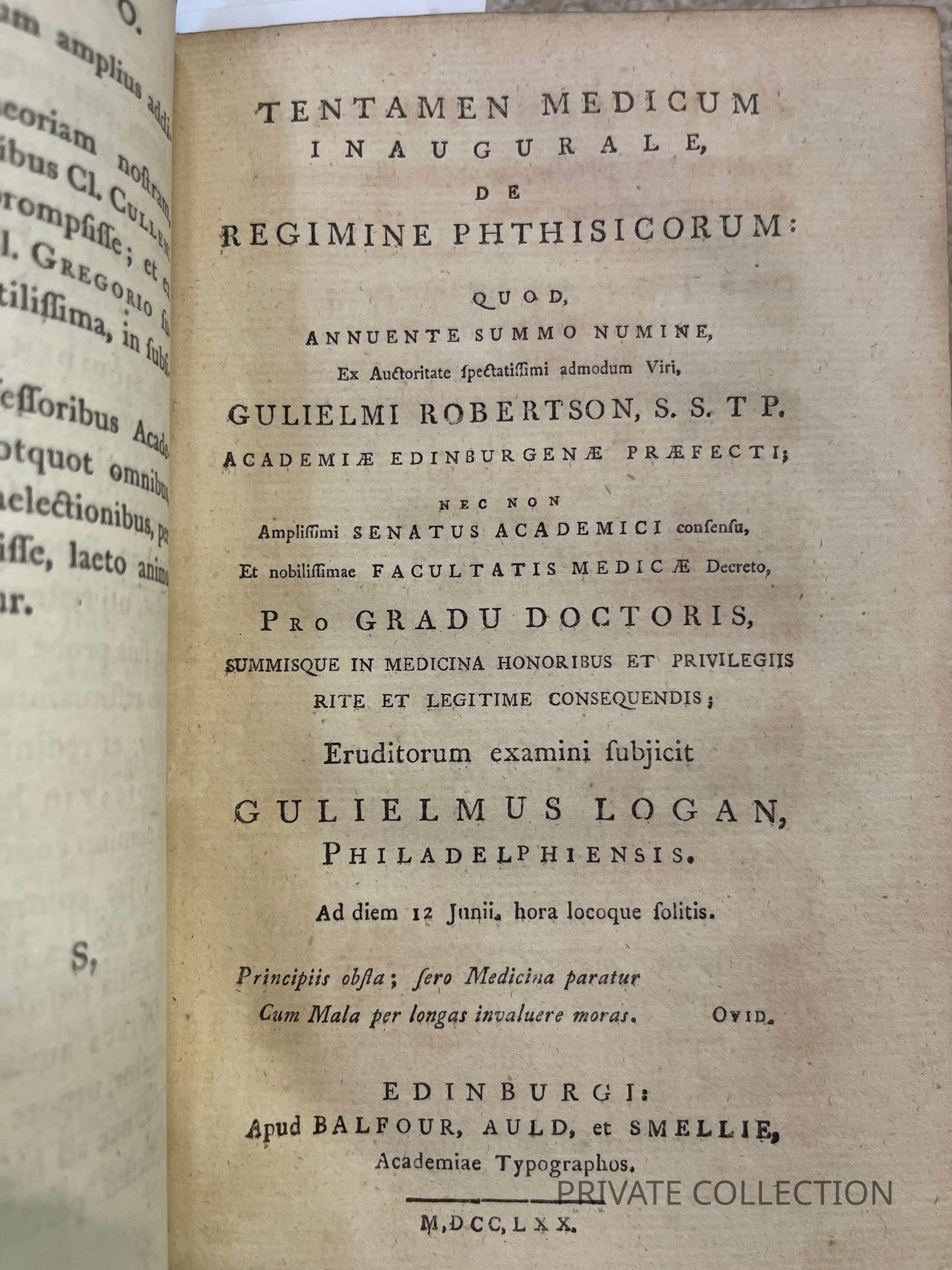 Logan Family Papers. A Cyclopedia of American Medical Biography. American National Biography. 1. Epistola Physiologica Inauguralis de Elementariis Musicae Sensationibus. Ludovicus Odier. Edinburgh: 1770. 49pp. 2. Dissertatio Medica Inauguralis de Scorbuto. David Stuart. Edinburgh: 1770. 40pp. 3. Tentamen Medicum Inaugurale, de Regimine Phthisicorum. Gulielmus Logan. Edinburgh: 1770. 37pp, [1]. 4. Disputatio Medica Inauguralis de Ictero. Johannis Ravenscroft. Edinburgh: 1770. 29pp + [3]. 5. Dissertatio Medicia Inauguralis de Cortice Peruviano. Joannes Warren. Edinburgh: 1770. 51pp. 6. Tentamen Medicum Inaugurale, de Calore. Jacobus M’Clurg. Edinburgh: 1770. 52pp. 7. Disputatio Medica Inauguralis de Tartaro Emetico. Petrus Steele. Edinburgh: 1770. 35pp. 8. Disputatio Medica Inauguralis de Testiculi Post Inflammationem Veneream Tumore. Edinburgh: 1770. 35pp. 9. Disserato Physiologica Inaugralis de Nutritione. Isaac Mee. Edinburgh: 1770. 37pp + [3]. 10. Specimen Inaugurale Pathologicum de Viribus Atmosphere Sentienti Obviis. Gulielmus Brown. Edinburgh: 1770. 48pp + [2].Condition
