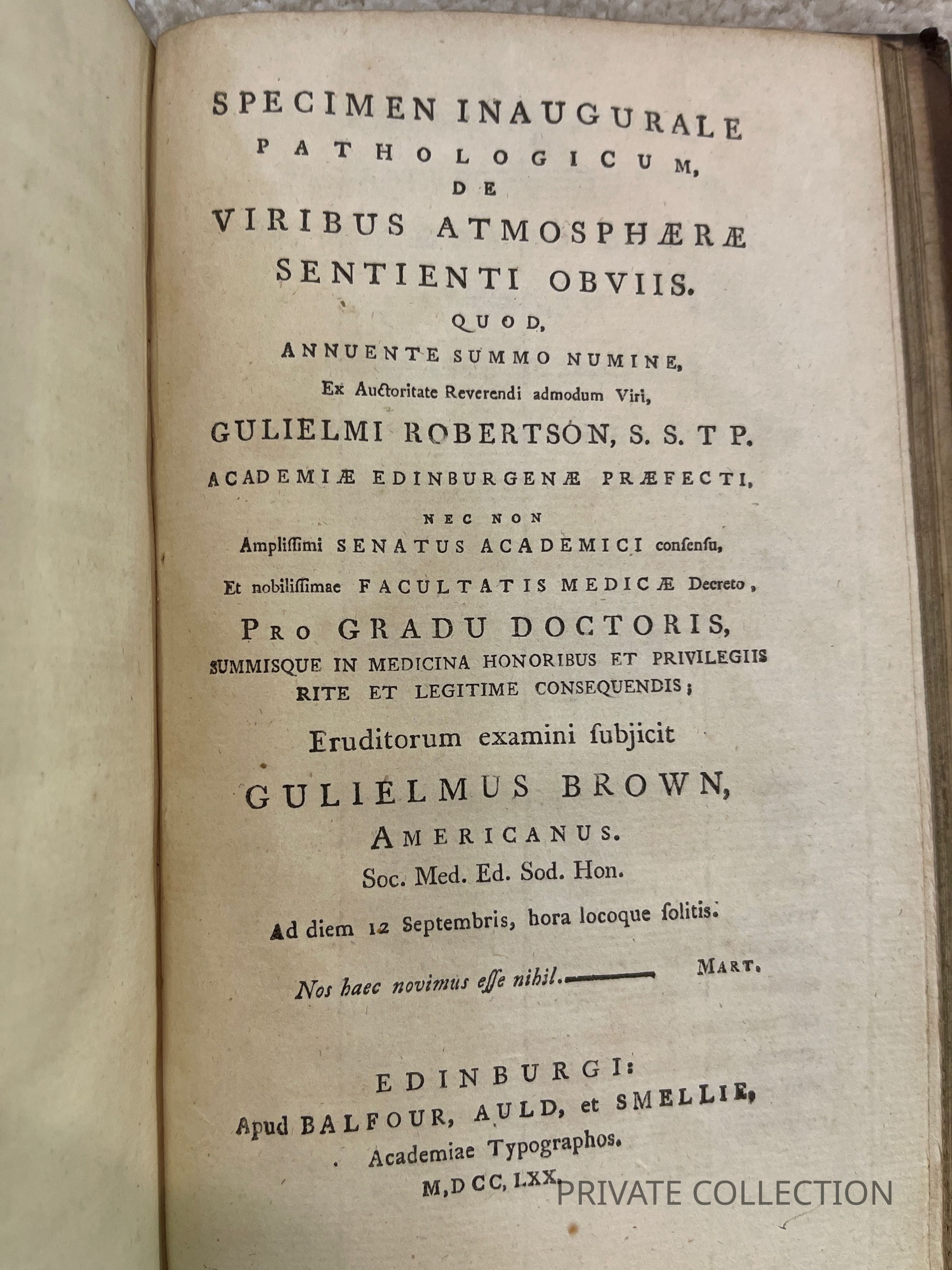William Brown (1752 - 1792) graduated from the University of Edinburgh in 1770. Dr. Brown was elected Surgeon General by Congress in 1777 and was Washington's physician with whom he spent a winter in Valley Forge during the American Revolution. Brown studied medicine in Scotland and came to America soon after. He published the first Pharmacopeia in the United States, which served in all military hospitals during the American Revolution. He was well acquainted with Washington, Jefferson, Rush, and Madison. Brown also served as the chairman of trustees of the Alexandria Academy at the direct request of George Washington. This particular dissertation by Brown is one of the earliest devoted to environmental medicine and atmospheric pathogens.
