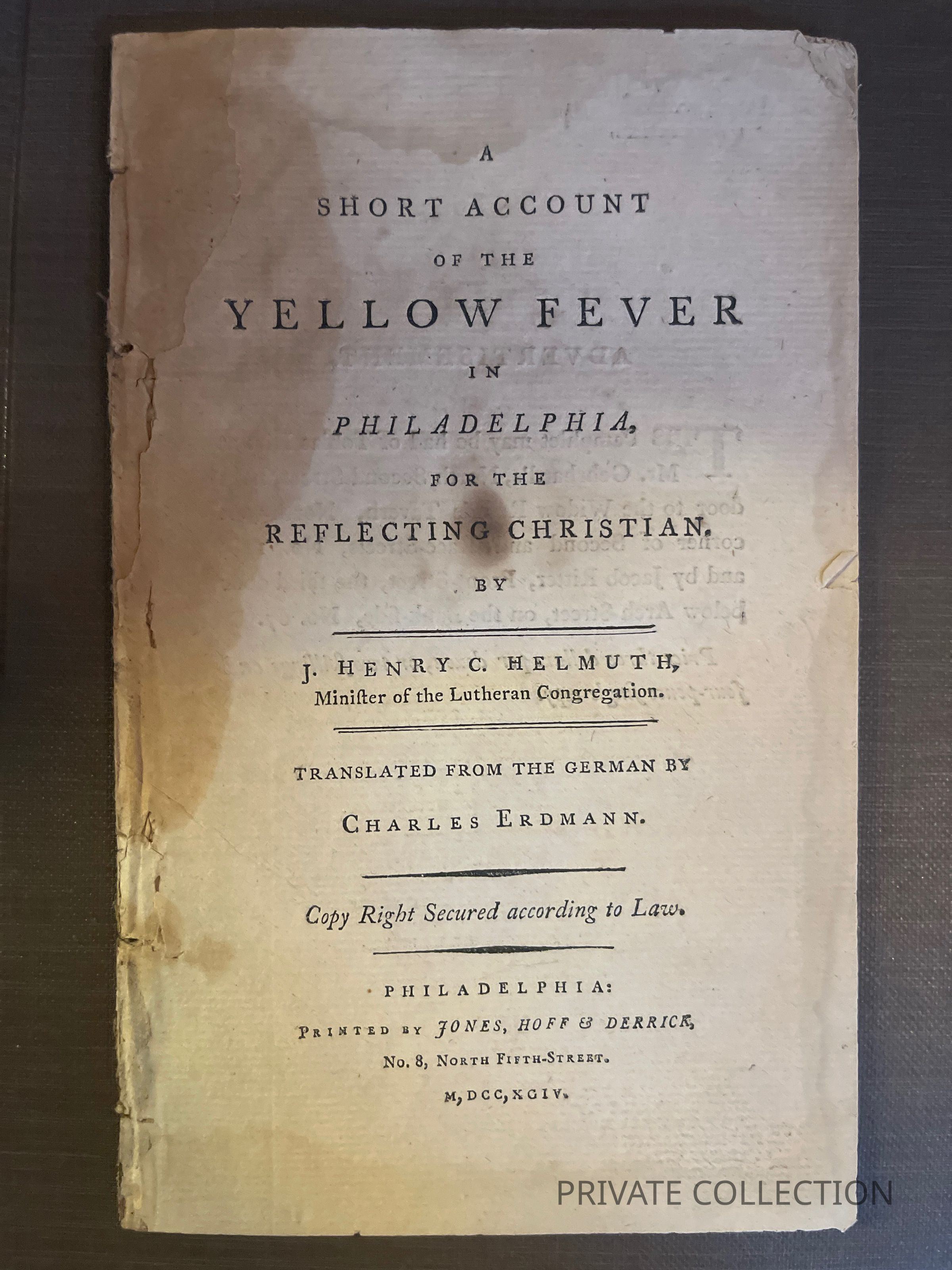 HELMUTH, J. Henry. A Short Account of the Yellow Fever in Philadelphia, for the Reflecting Christian. Phila.: Printed by Jones, Hoff & Derrick, 1794. . The author who was minister of the Lutheran congregation of the city is firmly convinced that the wickedness and dissipation of the inhabitants brought on the plague.Other Names and Numbers