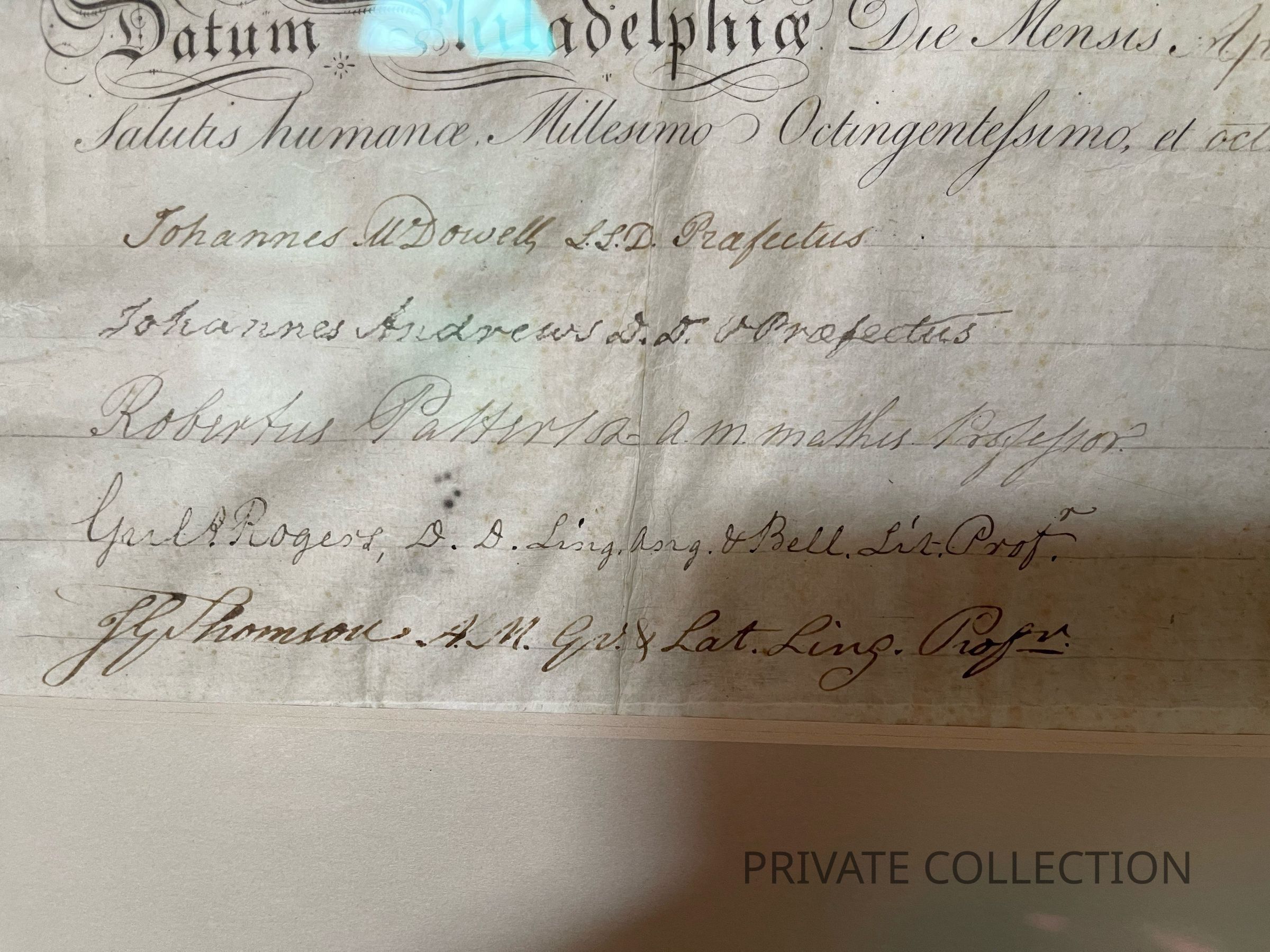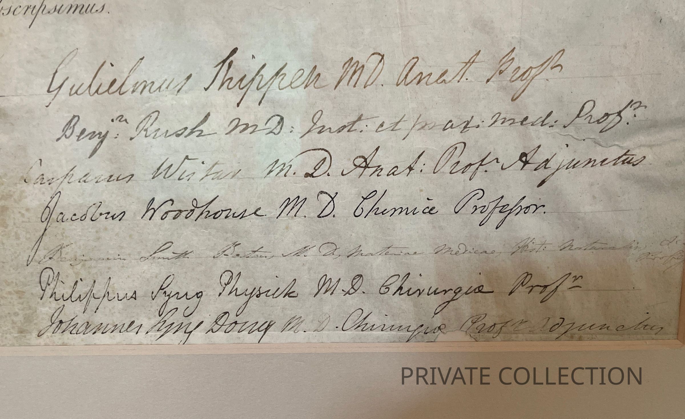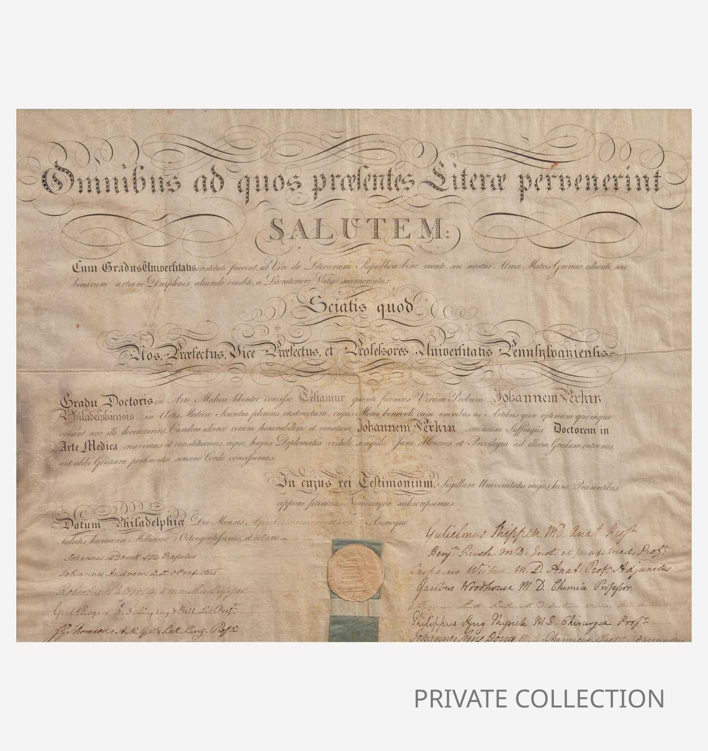 Philadelphia, April 28, 1808. Single vellum sheet, 18 1/2 x 23 /12 in. (470 x 596 mm). Partially-printed document in Latin, signed by Signer of the Declaration of Independence from Pennsylvania, Benjamin Rush (1746-1813), being a diploma from the University of Pennsylvania, naming John Perkin a Doctor of Medical Science; counter-signed by 12 professors, including notable physicians William Shippen, Jr. (1736-1808) ("Guilemus Shippen"); Caspar Wistar (1761-1818) ("Casparus Wistar"); Robert Patterson (1743-1824) ("Robertus Patterson"); paper seal intact at bottom. In mat and in frame, 25 x 30 in. (635 x 762 mm).Inscription/Signature/Marks