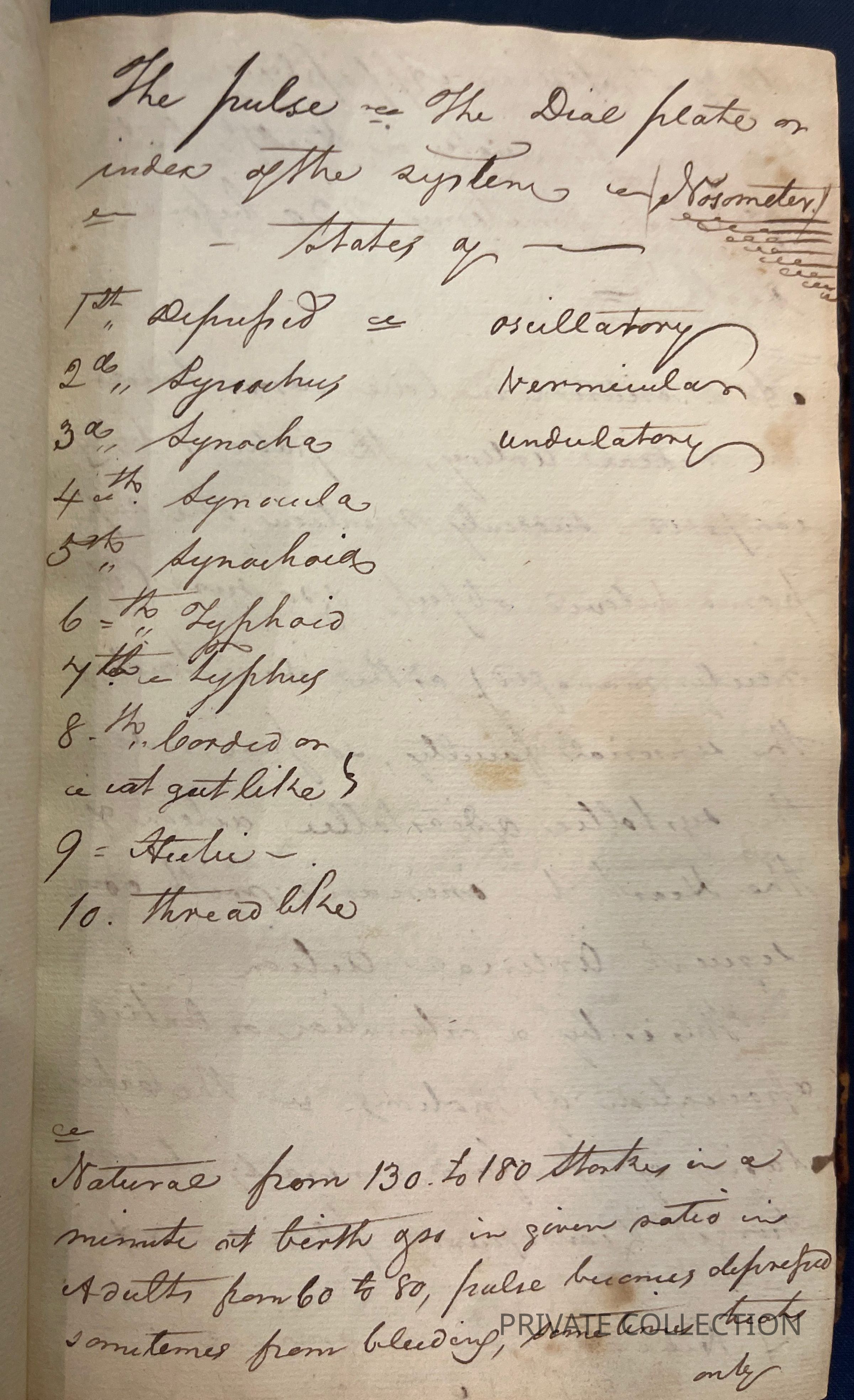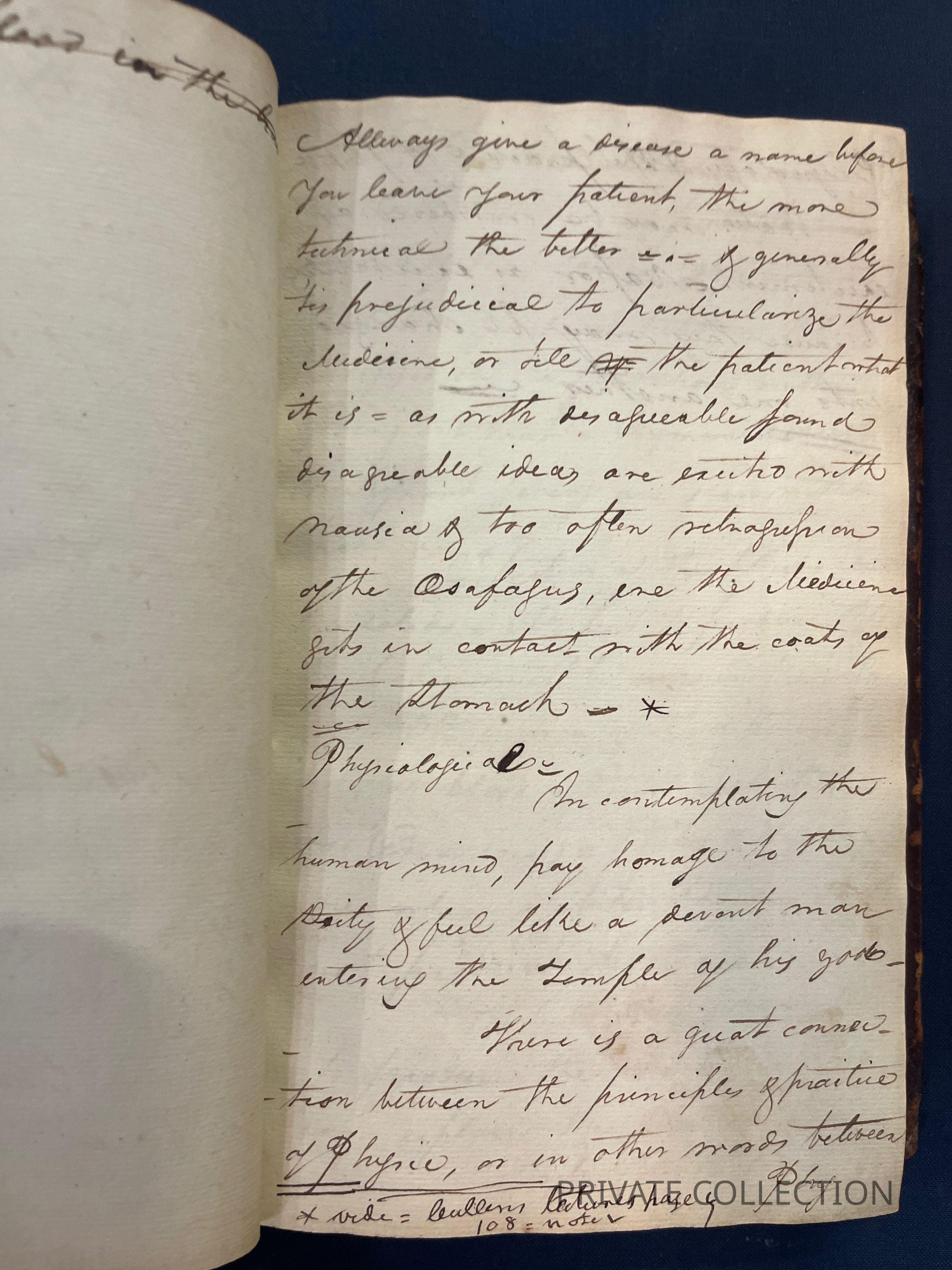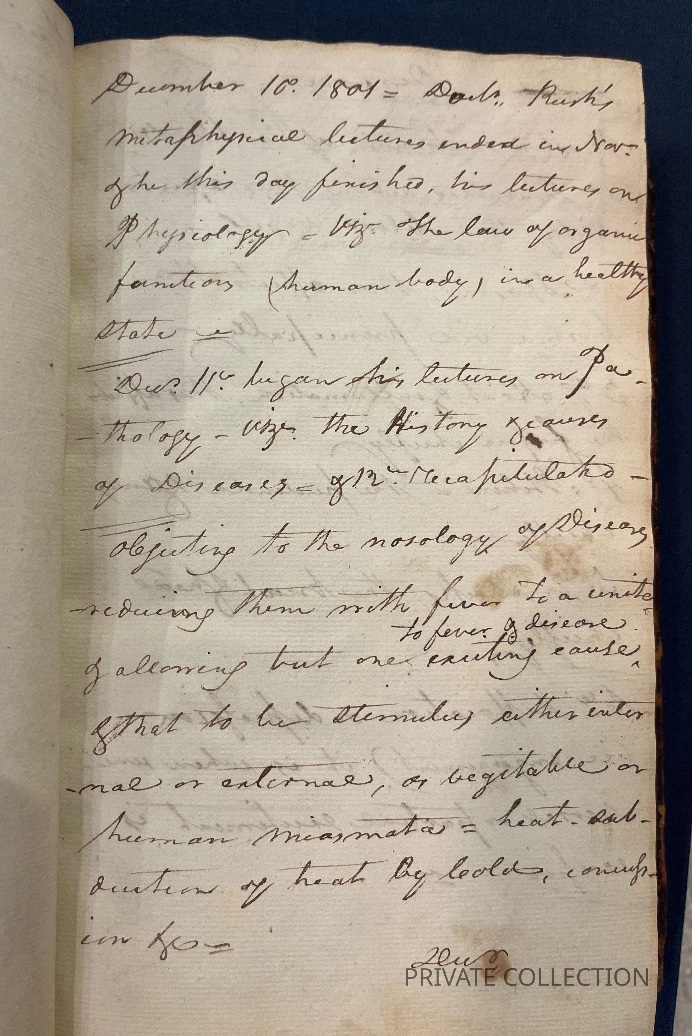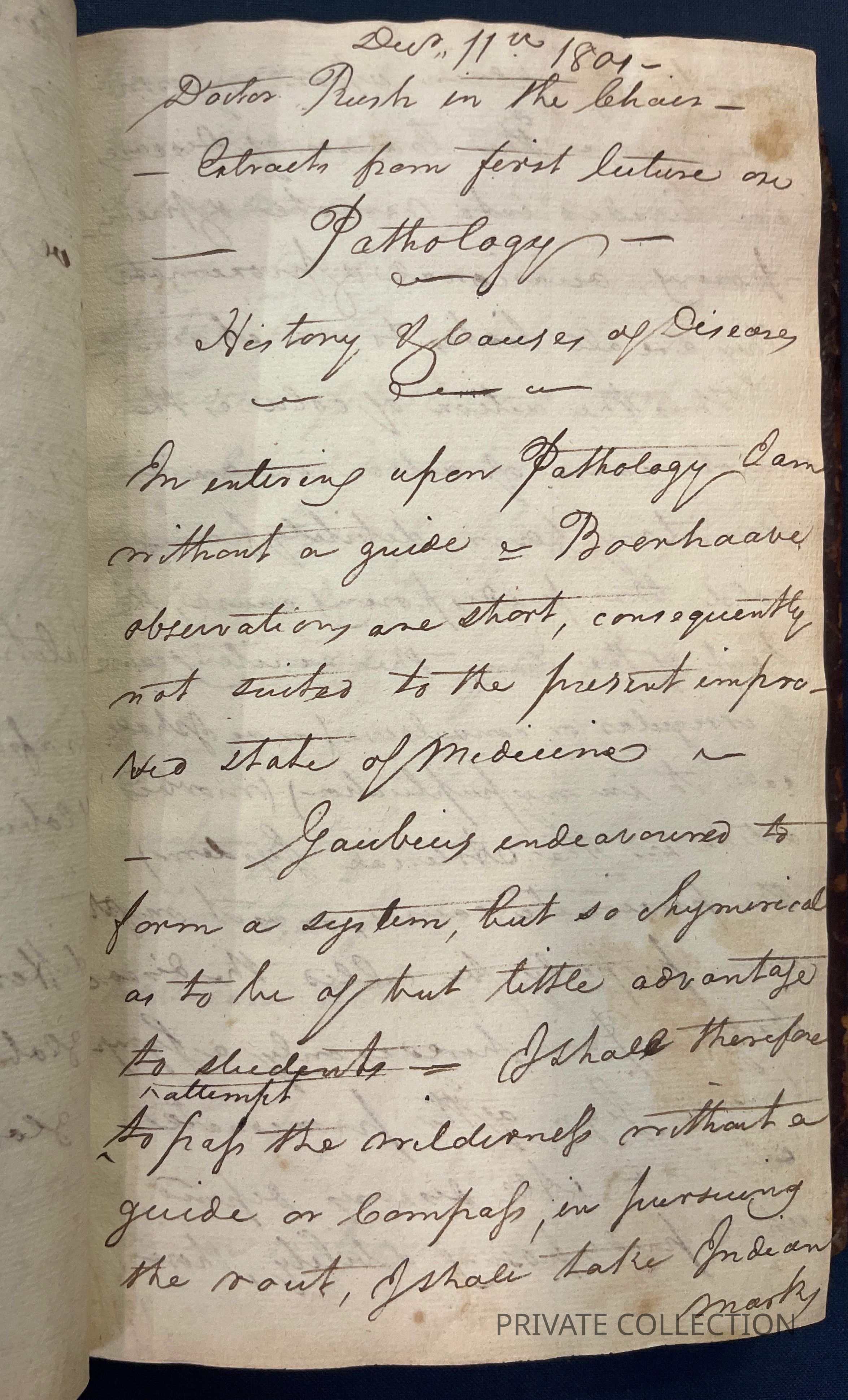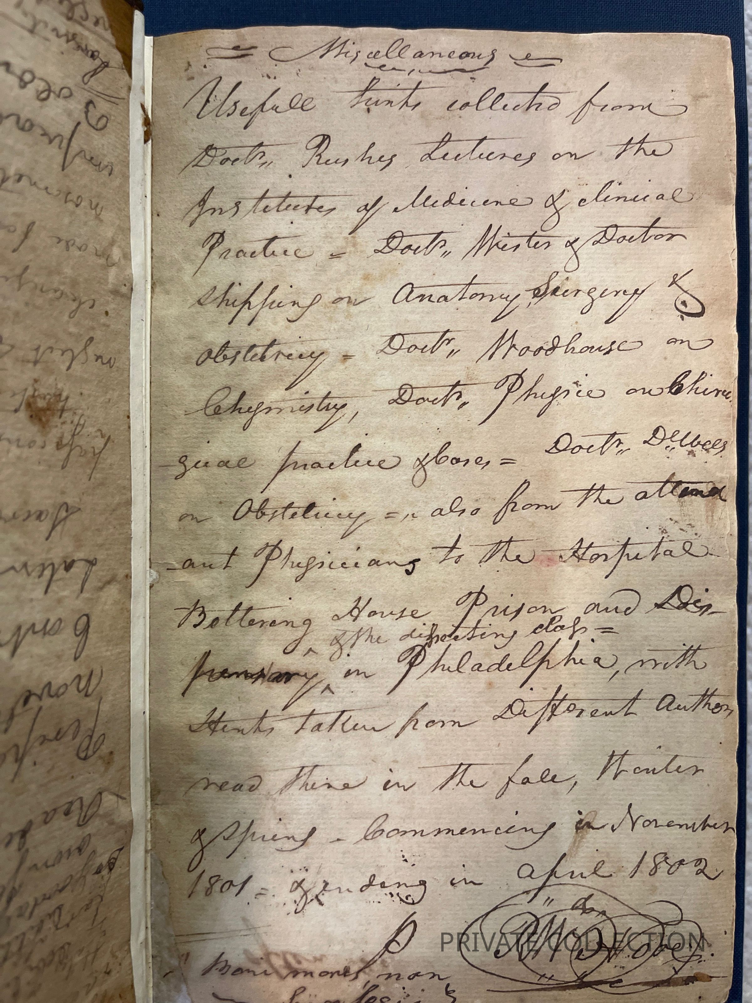 Bound With: “Manuscript Notes of Rice W. Hood (RWH), a private student of Rush’s who continued correspondance with Rush for several years afterwards. (2 letters from Hood to Rush in Libreary Company of PA) “Useful Hints collected from Doctor Rush’s Lectures on the Institutes of Medicine & Animal Practice and Doctor Wistar and Doctor Shippen on Anatomy, Surgery, and Obstetricy, Doctor Woodhouse on Chemistry, Dr. Physic on Chirugial practice and care, Doctor Delbees on Obstetricy, also from the attenand physicians to the Hospital, Bettering HOuse, Prison and Dispensary in Philadelphia with hints taken from different authors read there in the fall, winter and spring - commencing in Novermber 1801 and ending in April 1802”- a fascinating and unique multi-page manuscript filled with the authors lecture notes, self-pontifications, poetry, and other medical tidbits.Condition